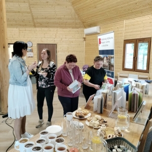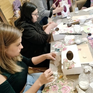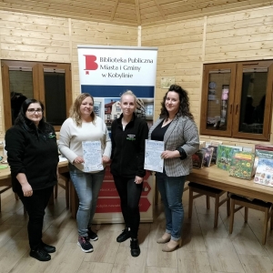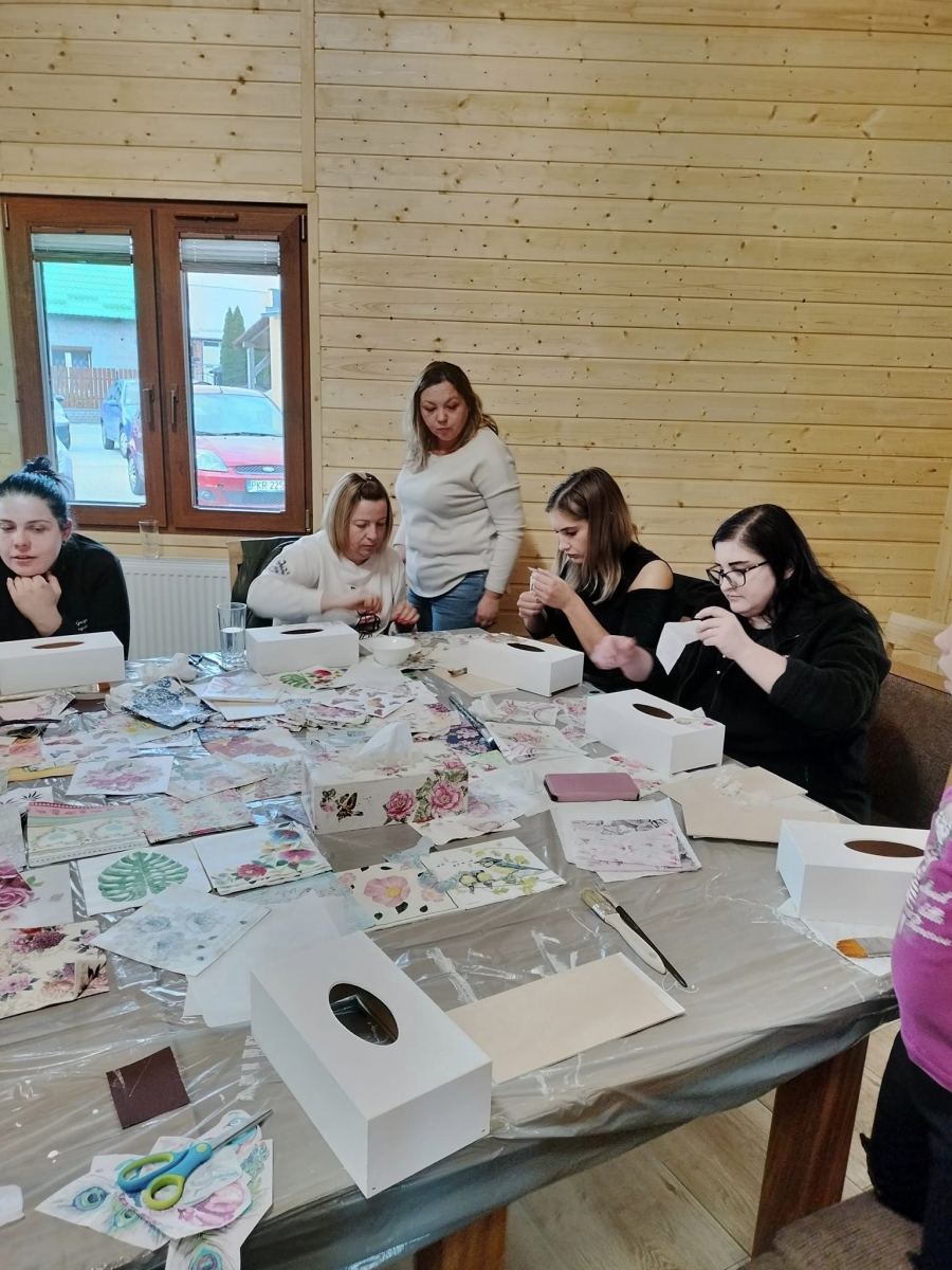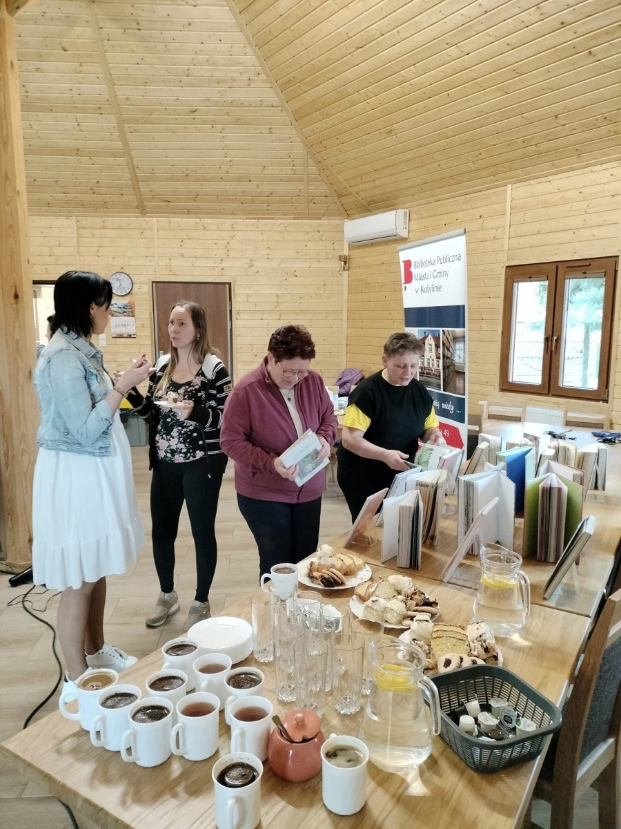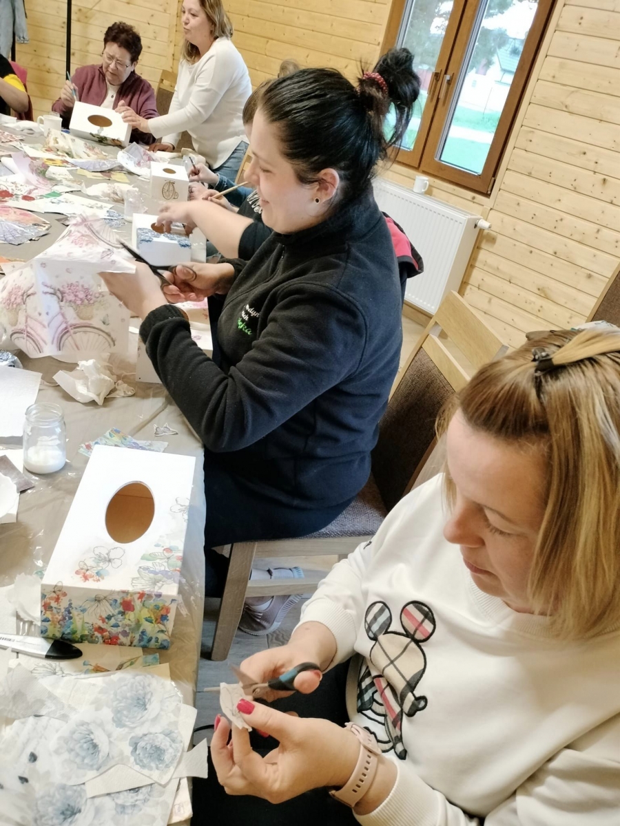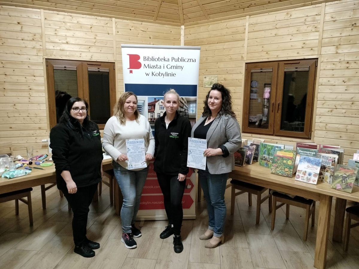 Zebrane Panie tworzyły oryginalne chusteczniki. Przy użyciu serwetek, farb i ogromu wyobraźni powstały piękne przedmioty. Tego wieczoru można było skorzystać z Objazdowej Biblioteki i wypożyczyć książkę.