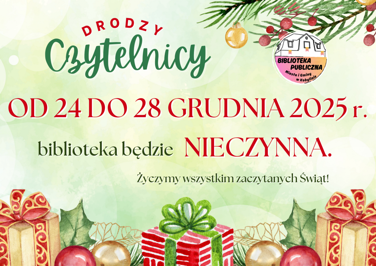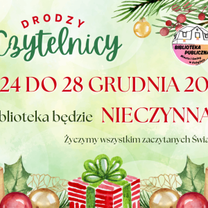 Ilustracja przedstawia informację skierowaną do Czytelników biblioteki, mówiącą o tym, że w dniach od 24 do 28 grudnia 2025 r. biblioteka będzie nieczynna. Grafika jest w kolorze jasnozielonym z elementami czerwieni. U dołu ilustracji jest grafika przedstawiająca świąteczne prezenty.