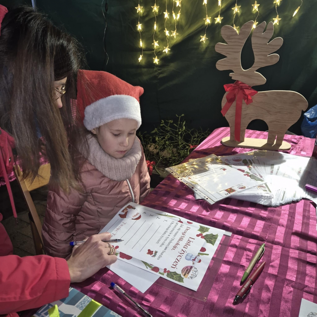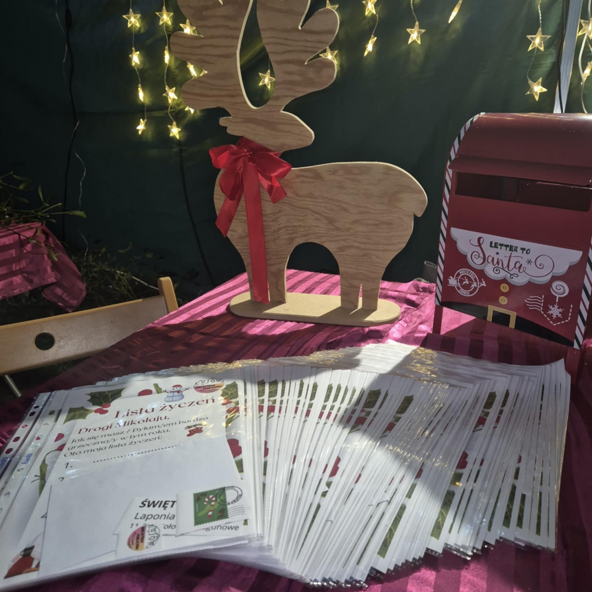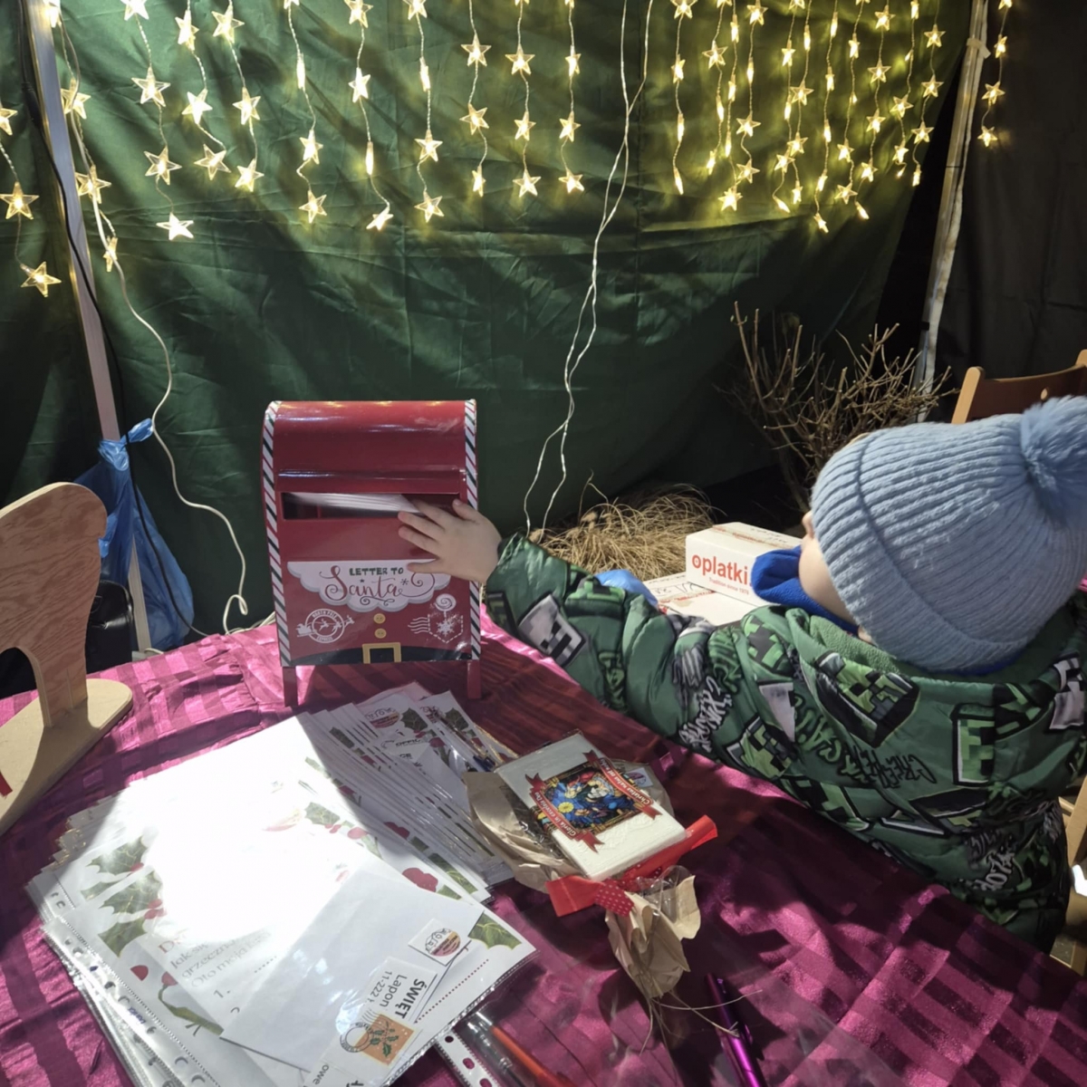 Każdy kto nas odwiedził mógł napisać list do Świętego Mikołaja. Bibliotekarki gwarantowały wysyłkę do Laponii. Rozdawałyśmy książkowe prezenty dla dzieci i dorosłych. Poza tym dla odwiedzających miałyśmy wigilijne sianko, jemiołę, a nawet opłatki. Do naszego stoiska zawitało ponad 250 osób.