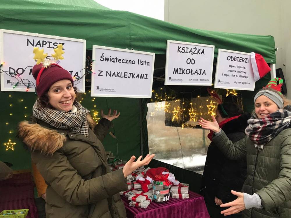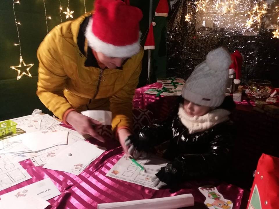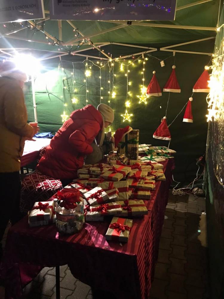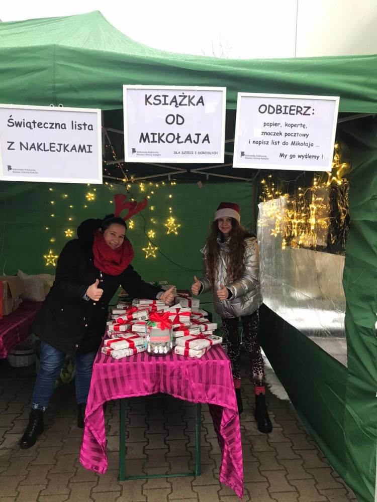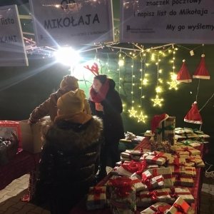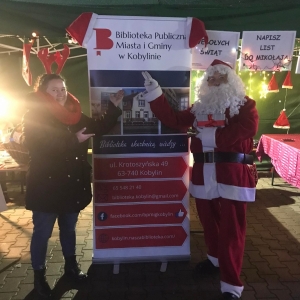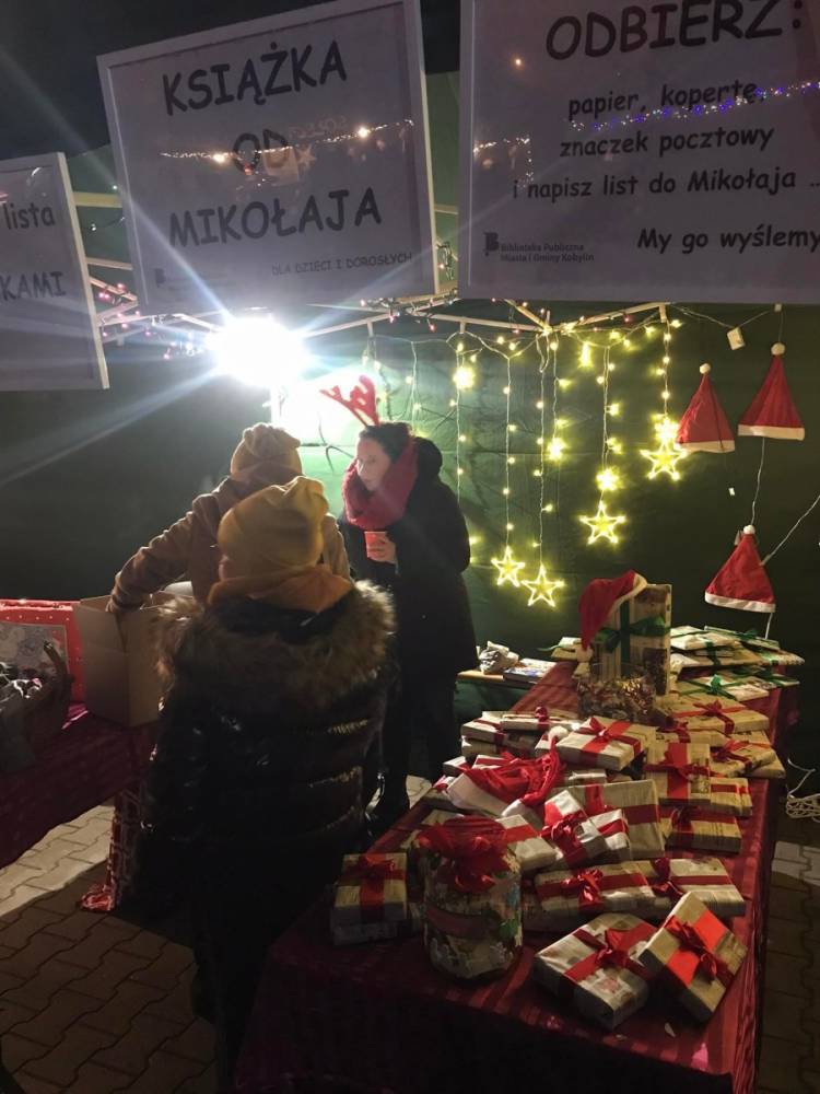Tego dnia Biblioteka Publiczna oferowała książki, które sprezentował Mikołaj. Każde dziecko, a także osoba dorosła mogła ze sobą zabrać prezent, którym była książka o nieznanym (dla obdarowanego) tytule. Kolejną miłą niespodzianką, którą oferowaliśmy było pisanie listów do Świętego Mikołaja. Przygotowaliśmy specjalną papeterię, zaadresowane koperty, a nawet specjalne znaczki pocztowe. Listy wrzucane do naszej skrzynki pocztowej, zostały wysłane do Mikołaja priorytetem ! Pisanie listu było pierwszym punktem do zrealizowania w naszej kolejnej zabawie. Odwiedzający nasz namiot otrzymywali listę obowiązków świątecznych, którą zapełniali specjalnymi naklejkami.