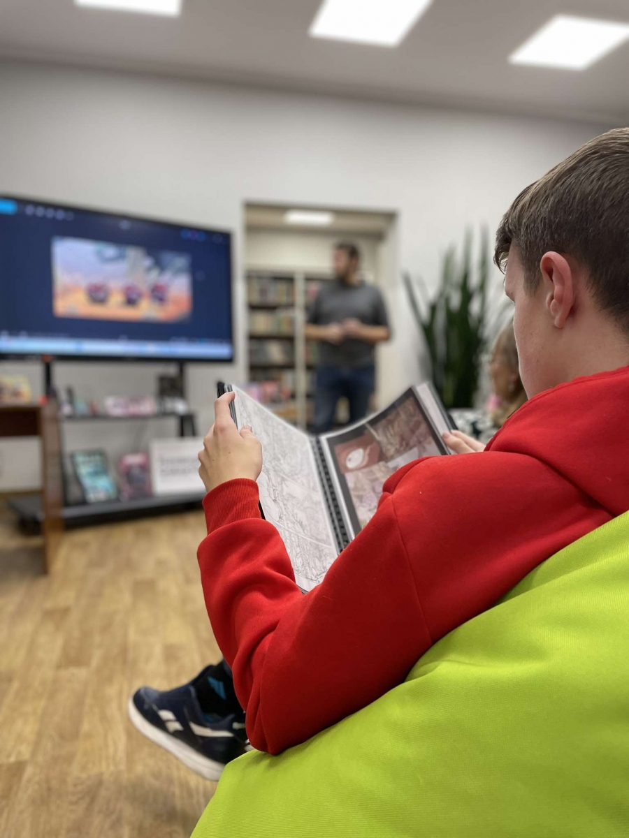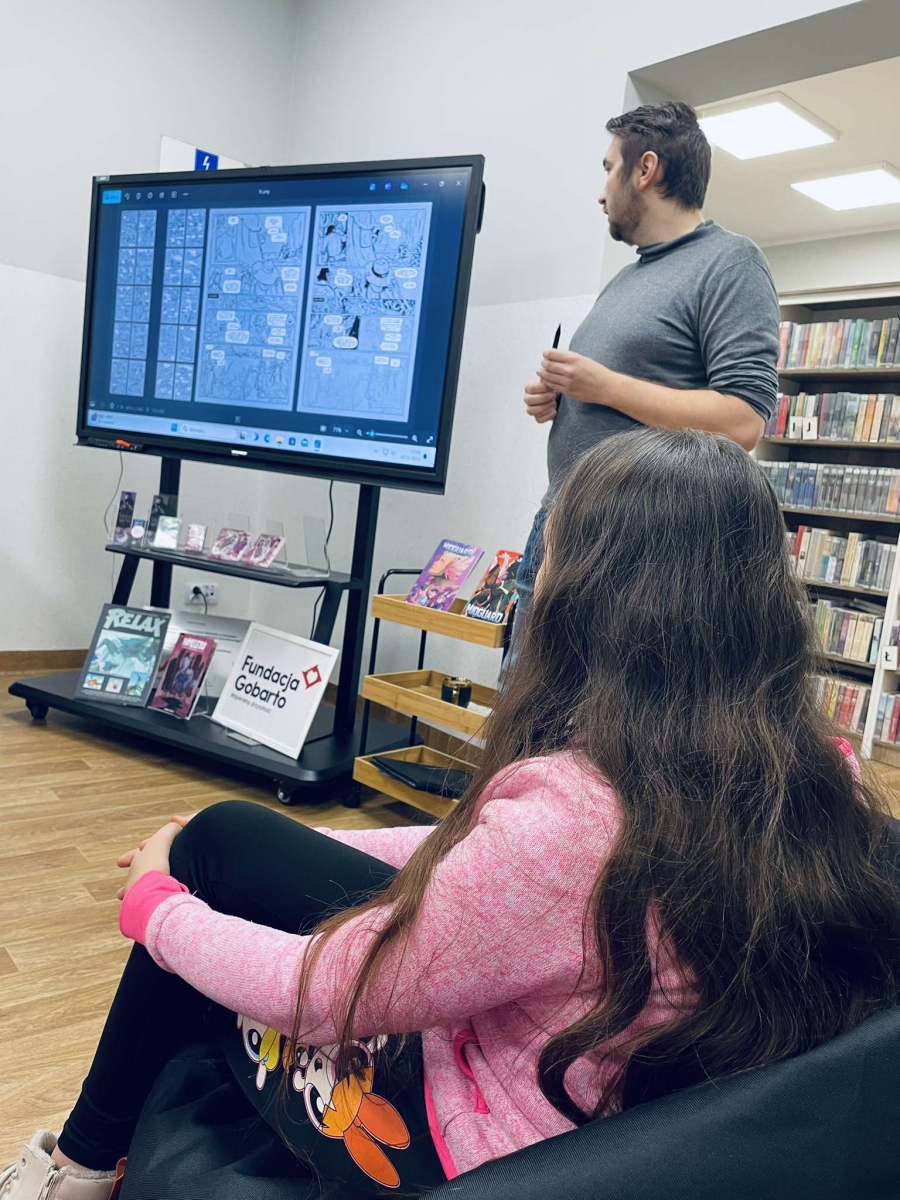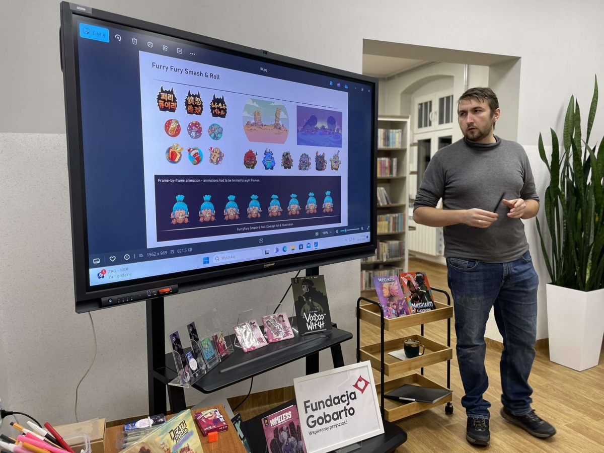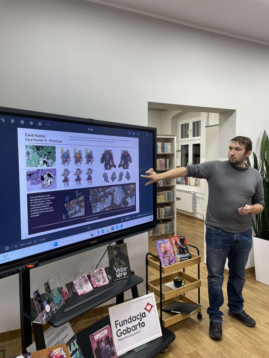 Zaprosiliśmy Dawida Malika - grafika, twórcę gier komputerowych i komiksów, a także ich pasjonata. Dawid opowiedział o etapach tworzenia ilustracji oraz o charakterystyce zawodu grafika. Ukazał także sporo własnych prac, które młodzież z zainteresowaniem przeglądała.