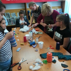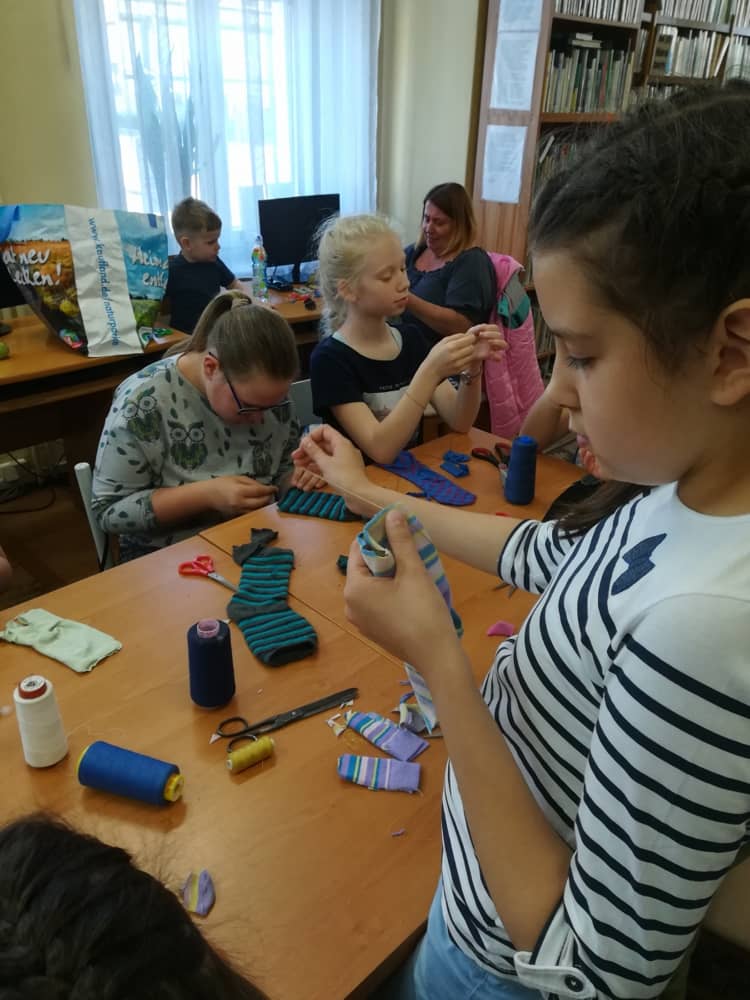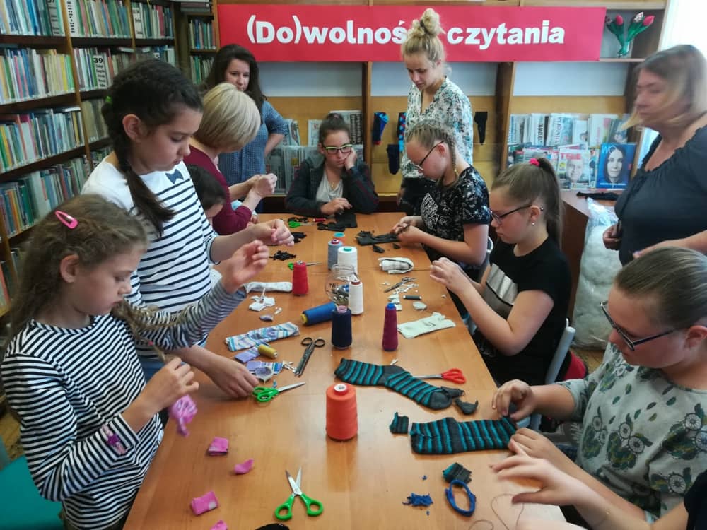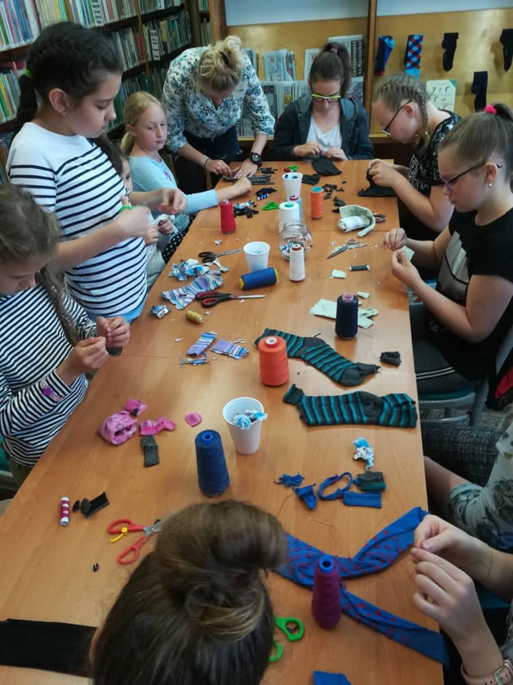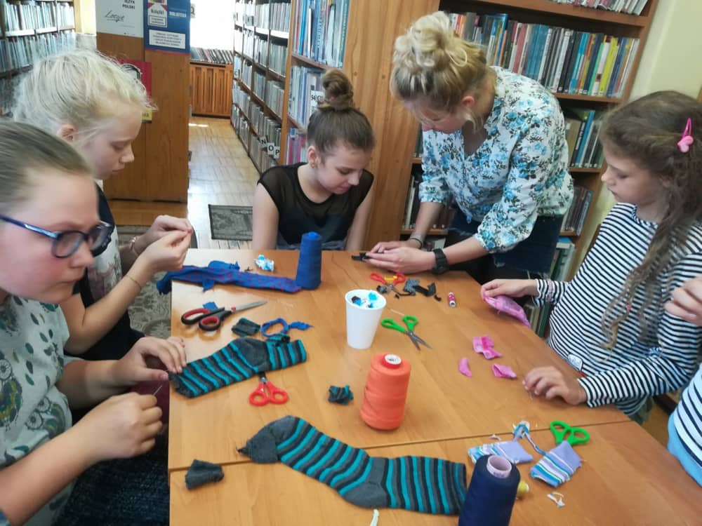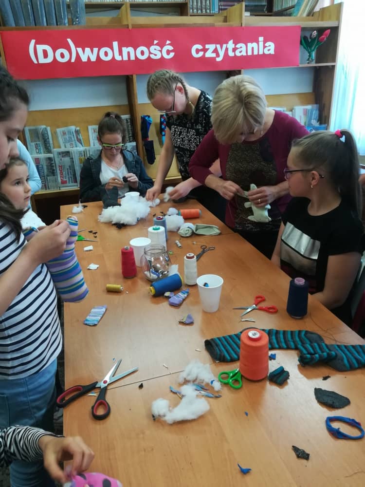 Sobotni poranek był idealną okazją, aby połączyć czytanie i szycie. Poznaliśmy książkę „Niesamowite przygody dziesięciu skarpetek (czterech prawych i sześciu lewych)" Justyny Bednarek. Skarpetki towarzyszyły uczestnikom również w dalszej części spotkania. To właśnie z nich tworzyliśmy śmieszne pluszaki. Jak się okazało nasze czytelniczki to prawdziwe artystki. Przy pomocy nici, igieł, waty dały życie zwykłym skarpetkom. Zabawy i śmiechu było co niemiara. Dorota skradła serca naszych czytelniczek oraz zaraziła pasją szycia.