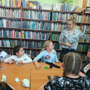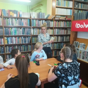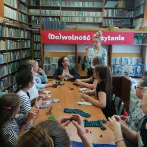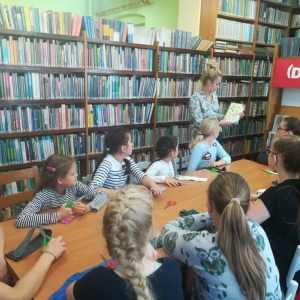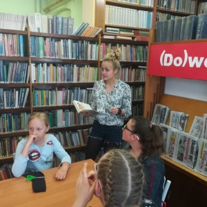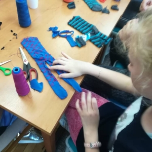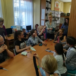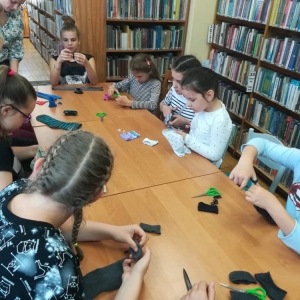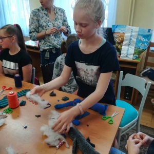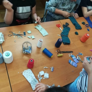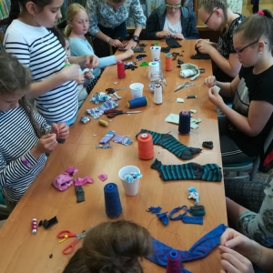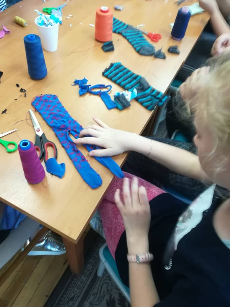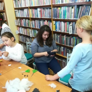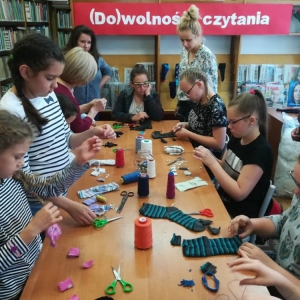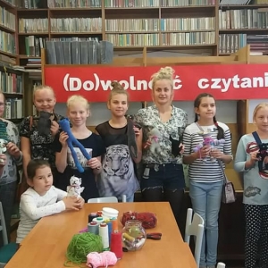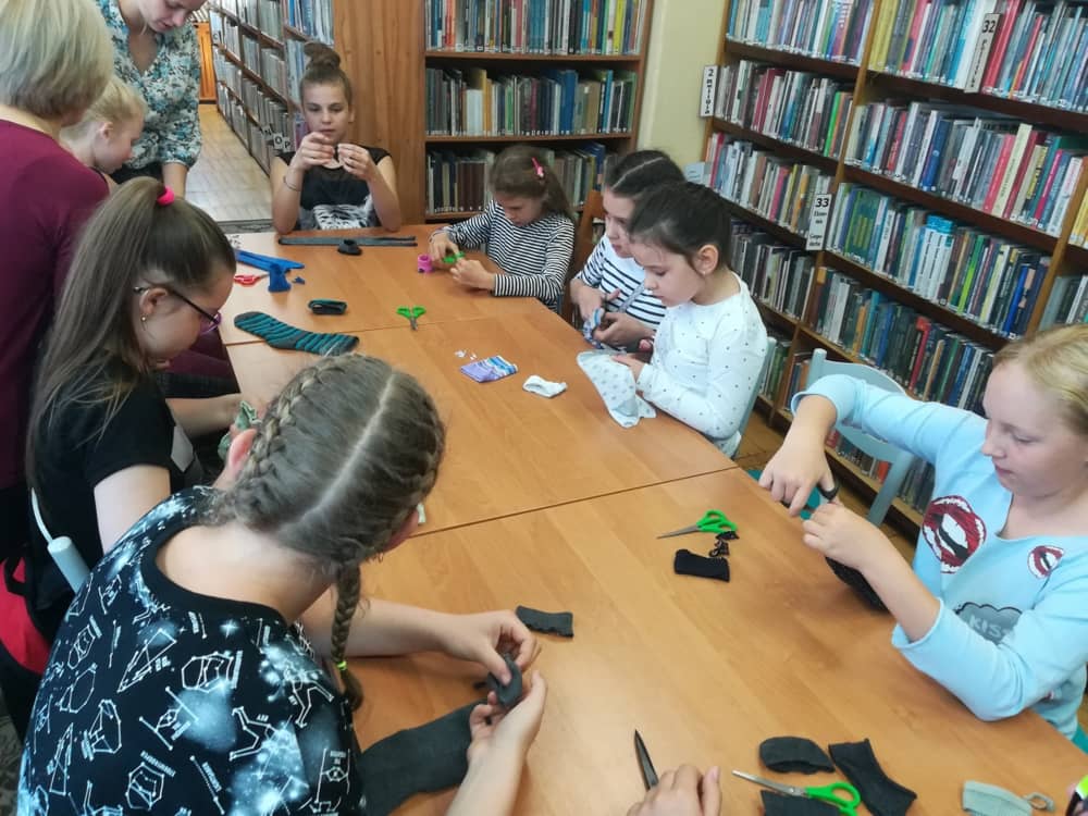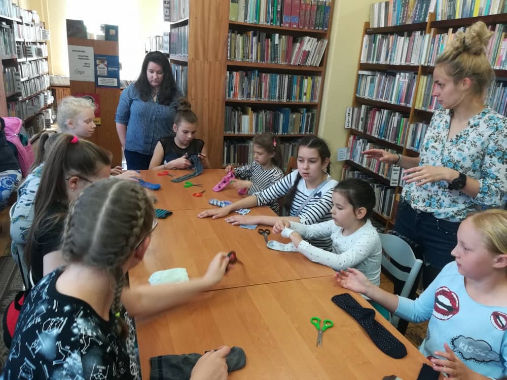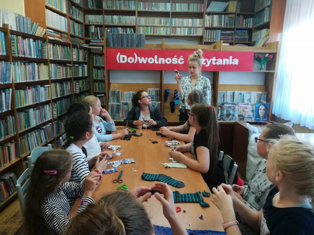 Sobotni poranek był idealną okazją, aby połączyć czytanie i szycie. Poznaliśmy książkę „Niesamowite przygody dziesięciu skarpetek (czterech prawych i sześciu lewych)" Justyny Bednarek. Skarpetki towarzyszyły uczestnikom również w dalszej części spotkania. To właśnie z nich tworzyliśmy śmieszne pluszaki. Jak się okazało nasze czytelniczki to prawdziwe artystki. Przy pomocy nici, igieł, waty dały życie zwykłym skarpetkom. Zabawy i śmiechu było co niemiara. Dorota skradła serca naszych czytelniczek oraz zaraziła pasją szycia.