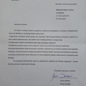 Biblioteka Publiczna w Kobylinie otrzymała podziękowanie od FundacjI Gobarto za owocną współpracę. Przypominamy, że w ubiegłym roku realizowaliśmy projekt ,,Chill w Bibliotece” w ramach programu ,,Wspieramy Przyszłość”.