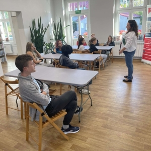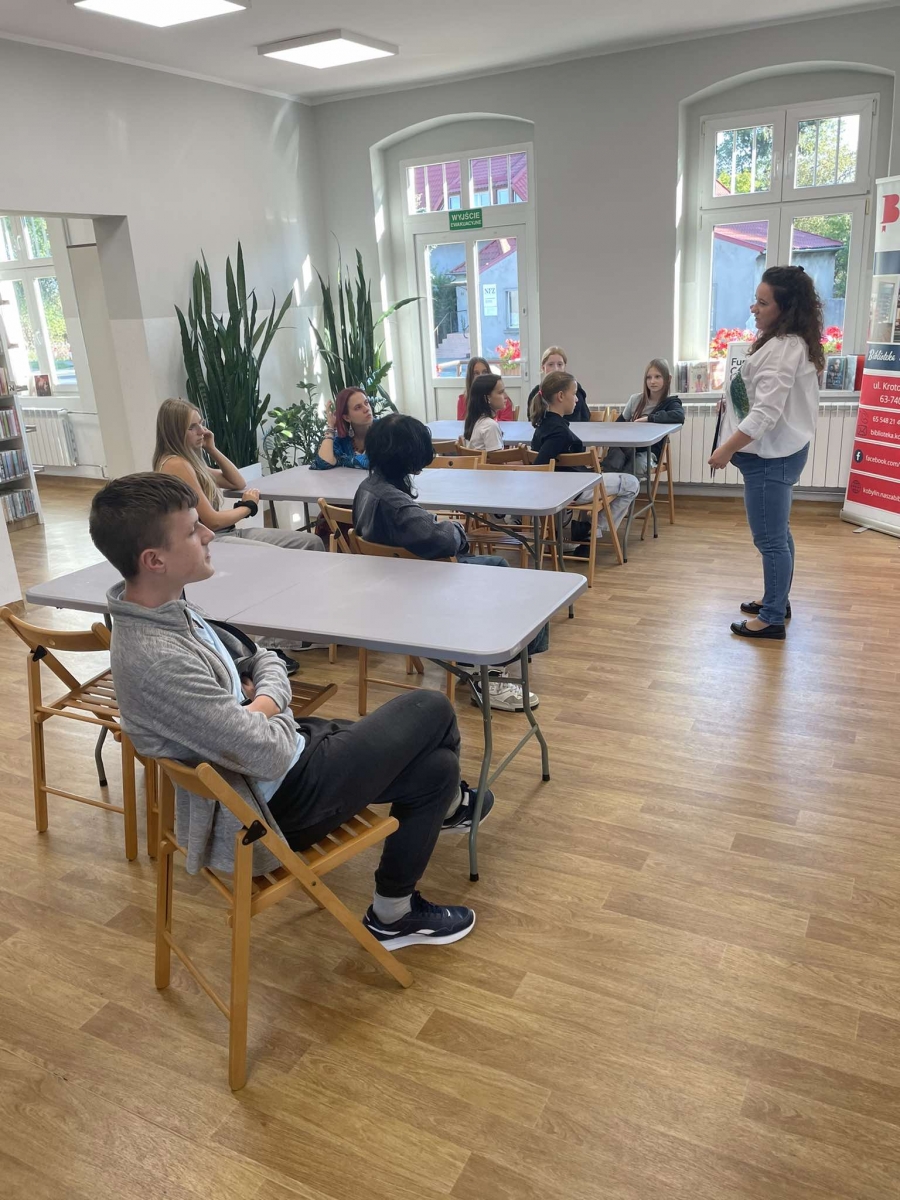Spotkanie rozpoczęliśmy od rozmowy na temat preferencji czytelniczych naszych młodych odbiorców oraz ich obrazu kobylińskiej biblioteki. Uczestnicy otrzymali krótkie anonimowe ankiety na wymienione tematy, abyśmy mogli dostroić się do potrzeb nastolatków.