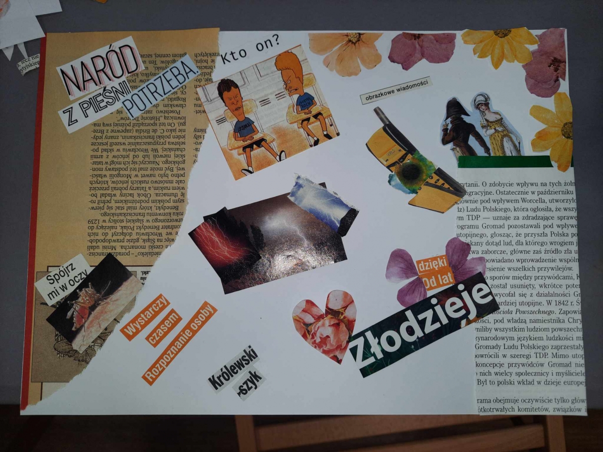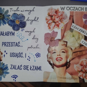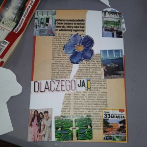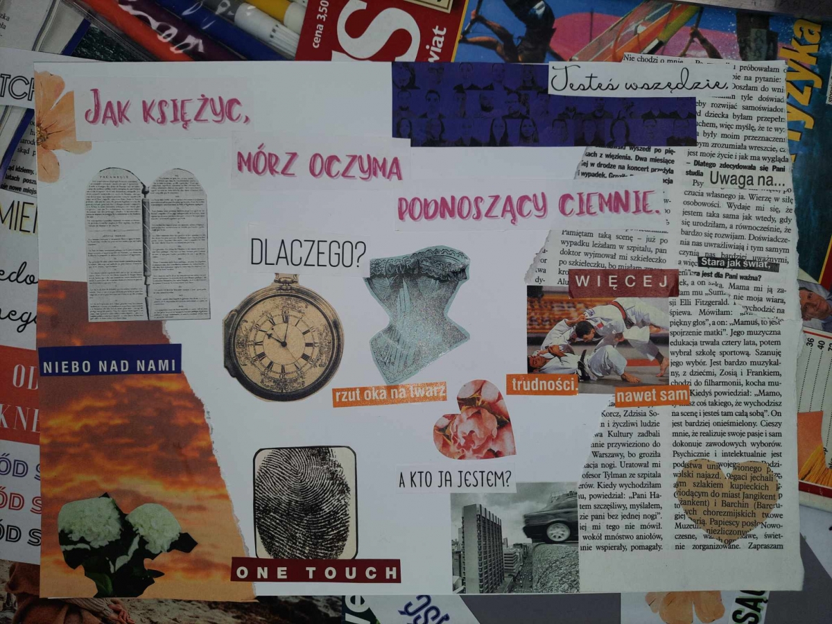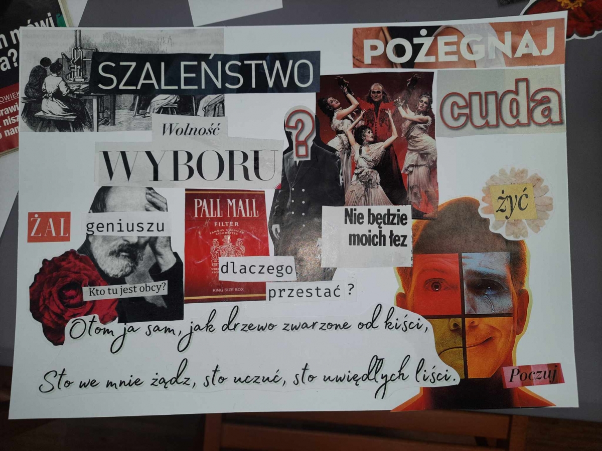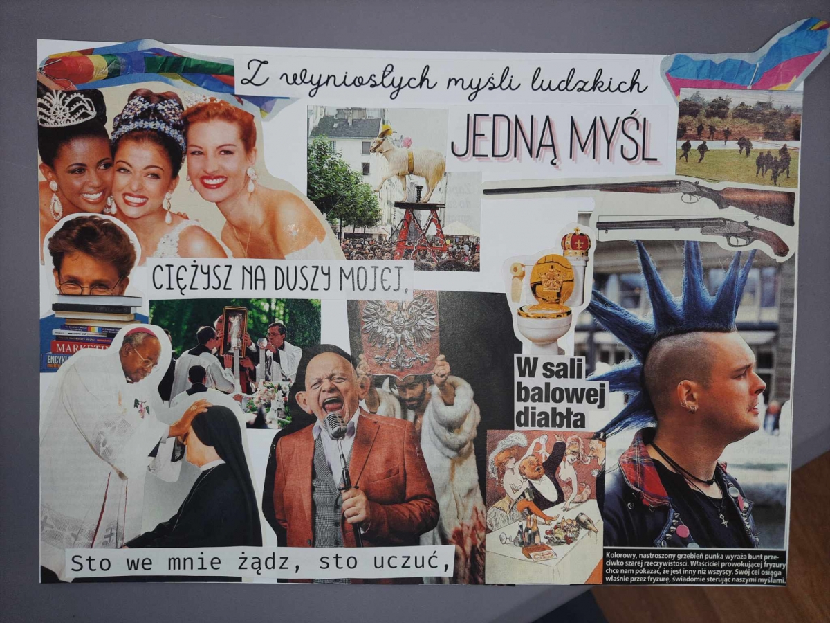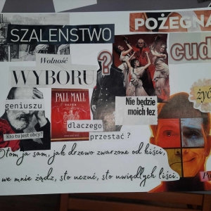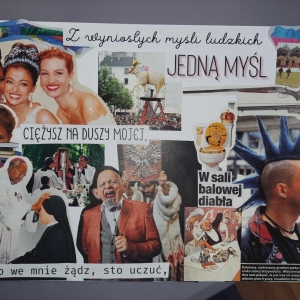 Następnie popracowaliśmy artystycznie. Nożyczki w ręce, stare gazety, wycinki plus cytaty z „Kordiana” J. Słowackiego i… po niedługim czasie ukazały się wspaniałe, pełne wyrazu i sporej dawki emocji – KOLAŻE. Przekaz poruszył nasze serca, ukazując niezwykłą wrażliwość młodzieży. Prace można obejrzeć poniżej, w galerii zdjęć.