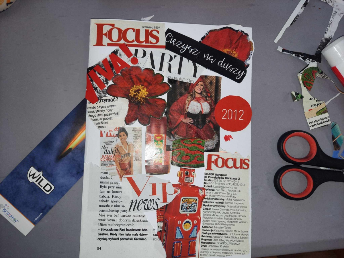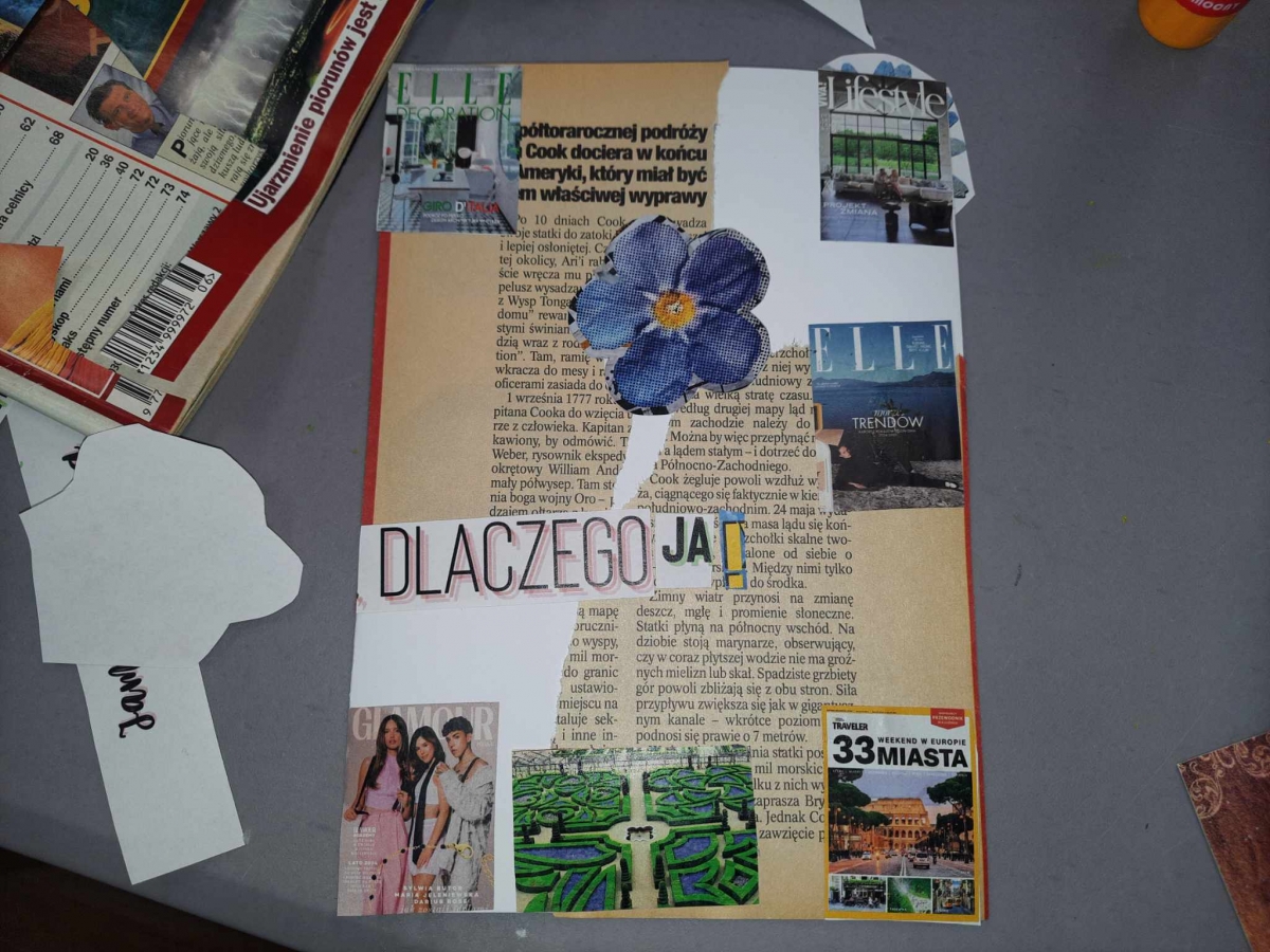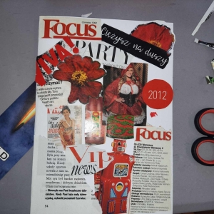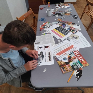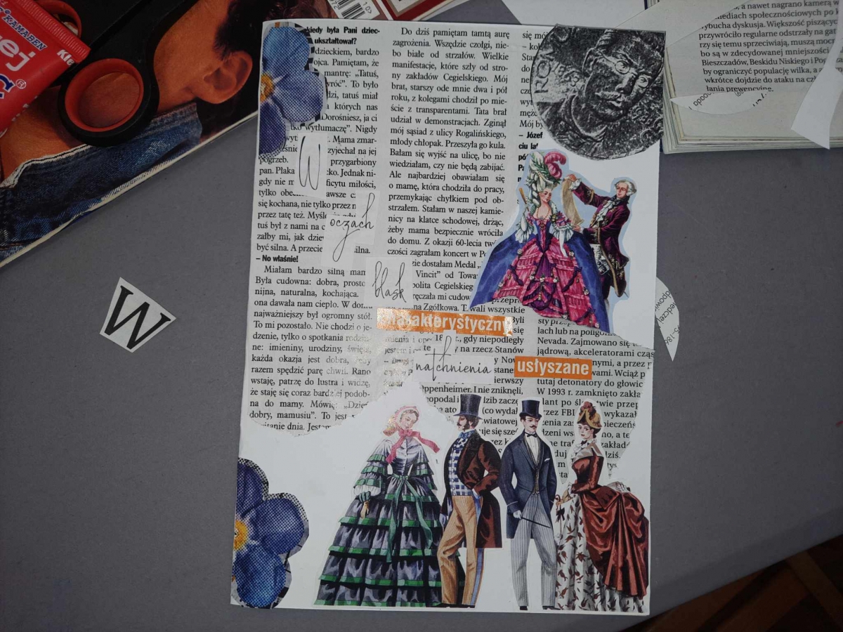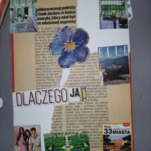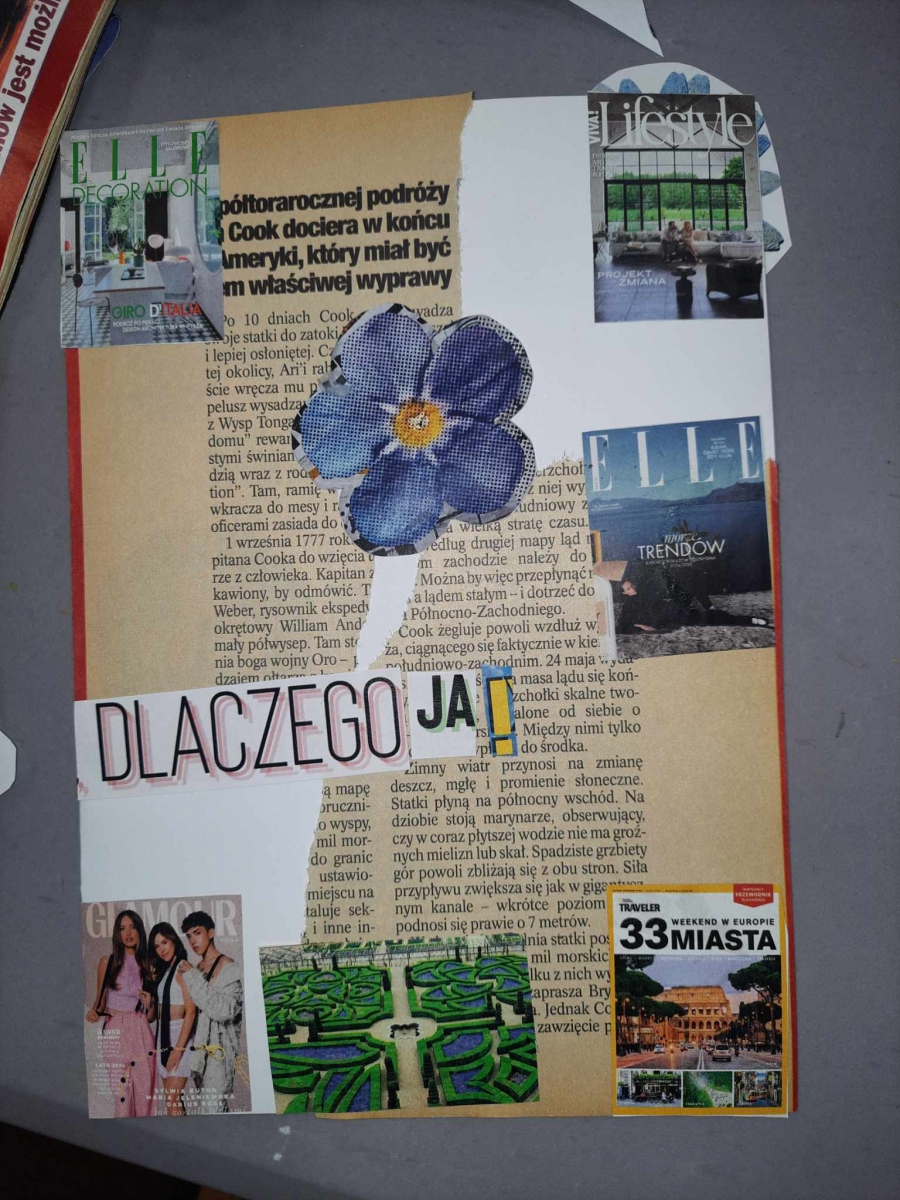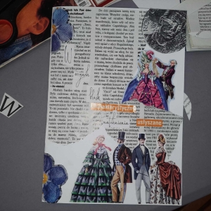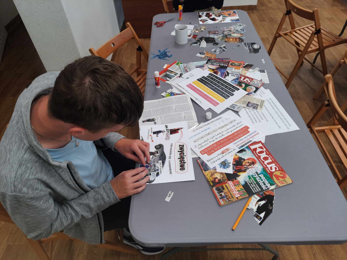 Następnie popracowaliśmy artystycznie. Nożyczki w ręce, stare gazety, wycinki plus cytaty z „Kordiana” J. Słowackiego i… po niedługim czasie ukazały się wspaniałe, pełne wyrazu i sporej dawki emocji – KOLAŻE. Przekaz poruszył nasze serca, ukazując niezwykłą wrażliwość młodzieży. Prace można obejrzeć poniżej, w galerii zdjęć.