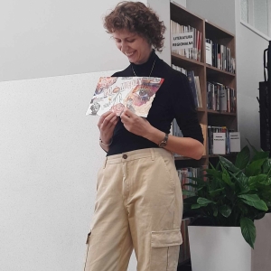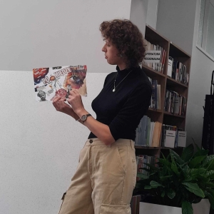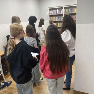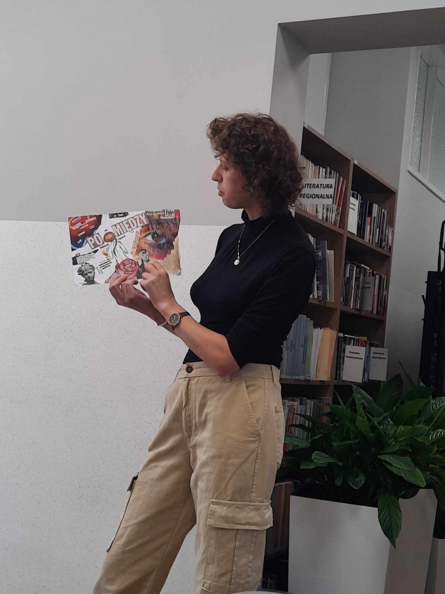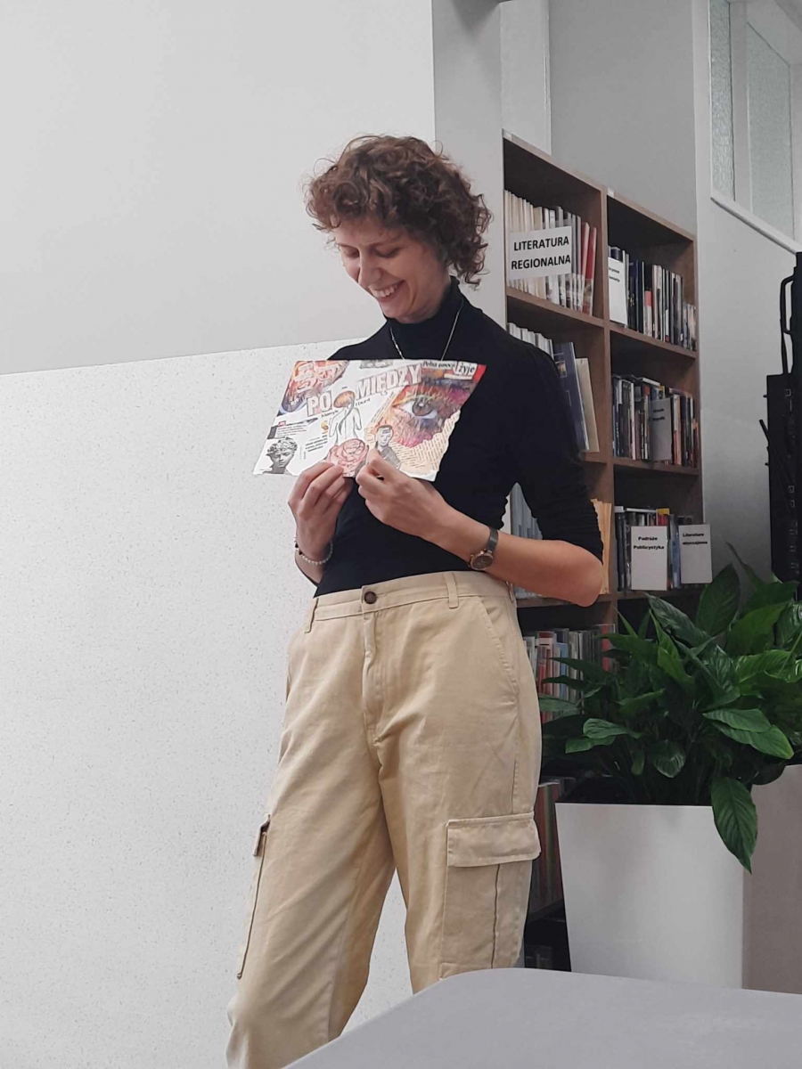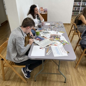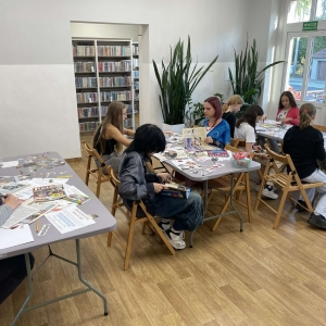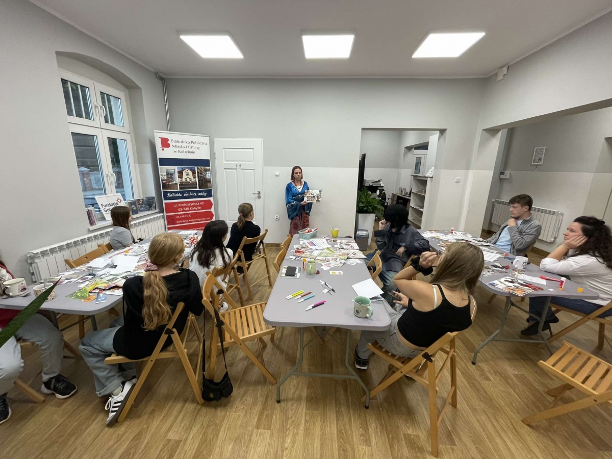 Zwiedziliśmy bibliotekę, zatrzymując się w czytelni dla młodzieży, gdzie uczestnicy mogli zastanowić się jakich zmian potrzebują w tym pomieszczeniu.