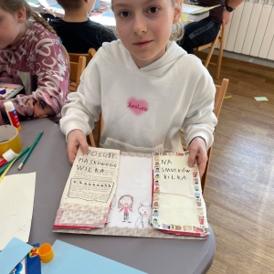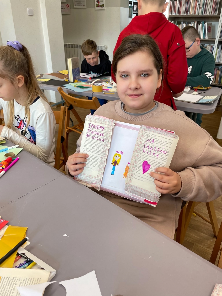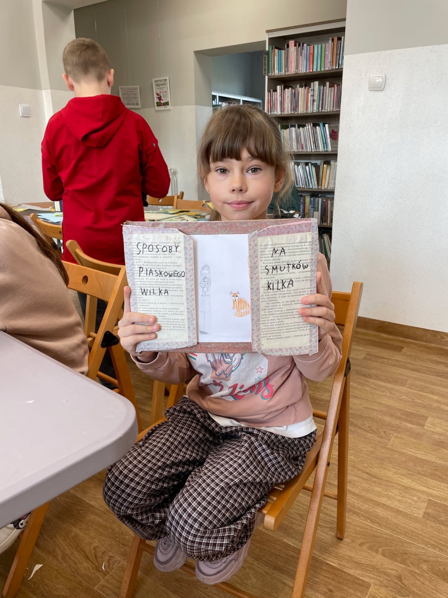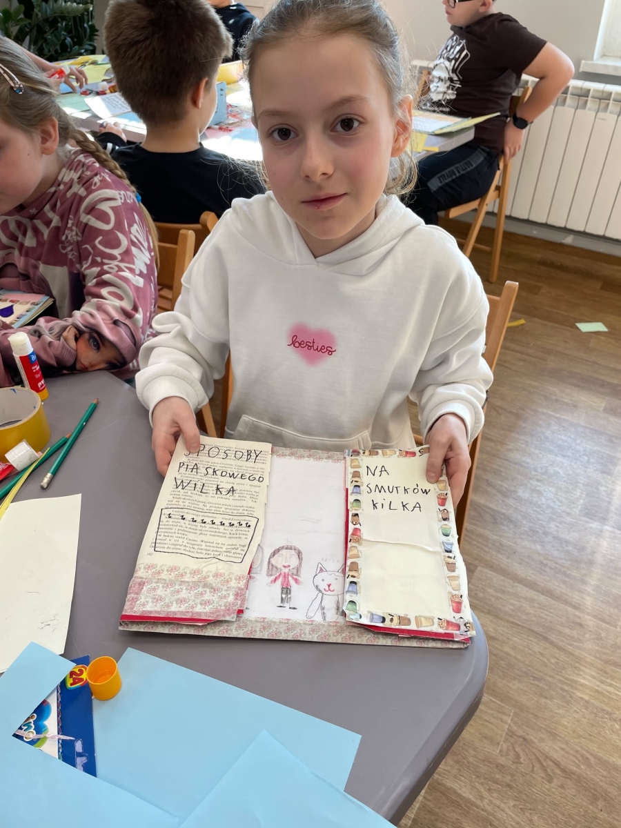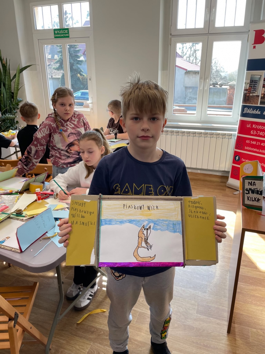Tak więc dla „treningu pozytywności” dzieci tworzyły tekturową książkę zatytułowaną „Sposoby Piaskowego Wilka na smutków kilka”. W środku wpisywali oraz rysowali swoje własne pomysły na radzenie sobie ze smutkiem. W momencie przygnębienia każdy będzie mógł zajrzeć do własnego poradnika, by przypomnieć sobie, że na chandrę jest sposobów co najmniej kilka.