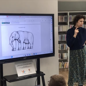 Obejrzeliśmy krótki filmik ze strony Uniwersytetu Dzieci, na którym dr Monika Zazula wprowadziła nas w świat postrzegania obrazu przez różne gatunki zwierząt. Dowiedzieliśmy się, że koty i psy nie widzą koloru czerwonego oraz zielonego, rekiny natomiast rozpoznają barwę czarną i białą.