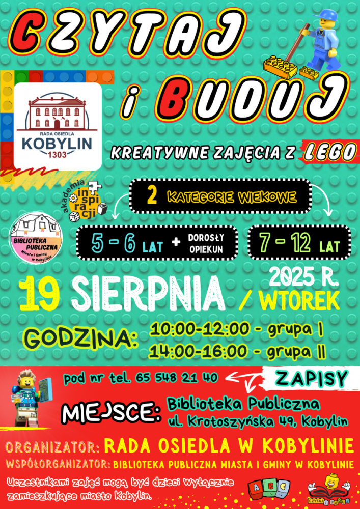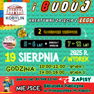19 sierpnia w Bibliotece Publicznej w Kobylinie (ul. Krotoszyńska 49) odbędą się kreatywne zajęcia z klockami LEGO pt. „CZYTAJ i BUDUJ”.