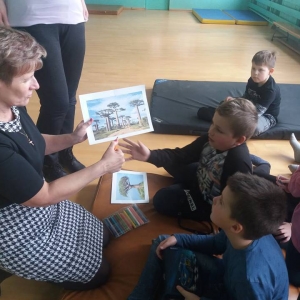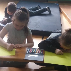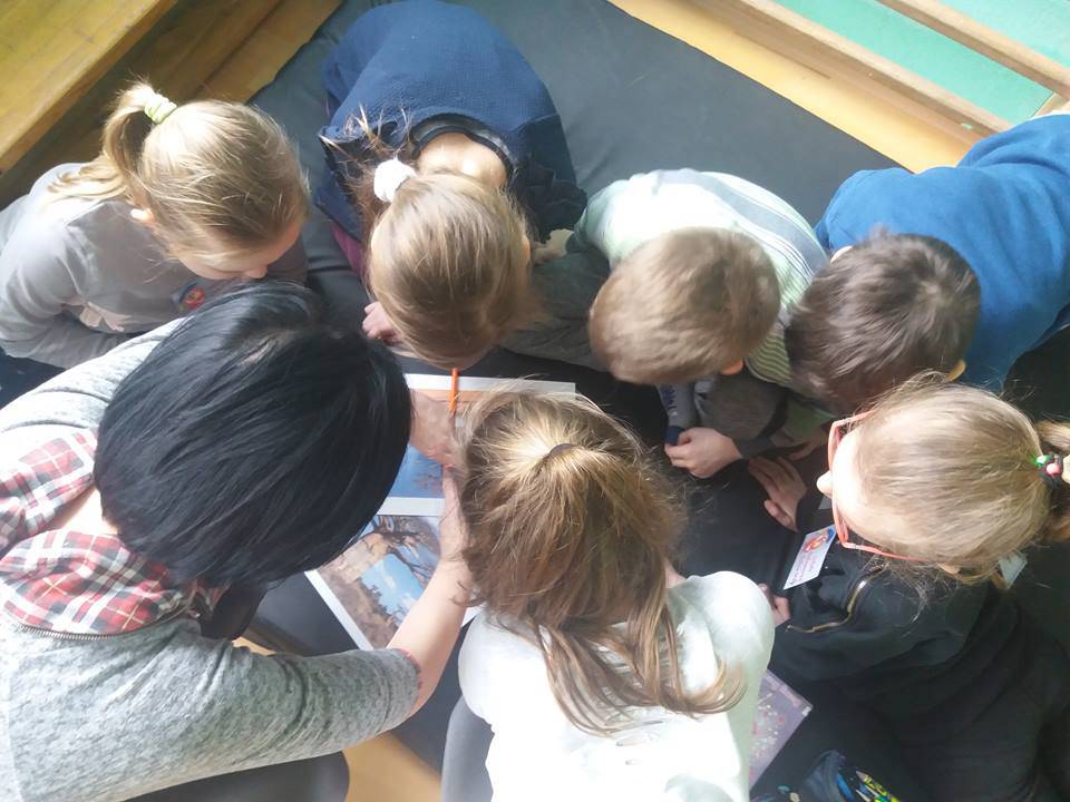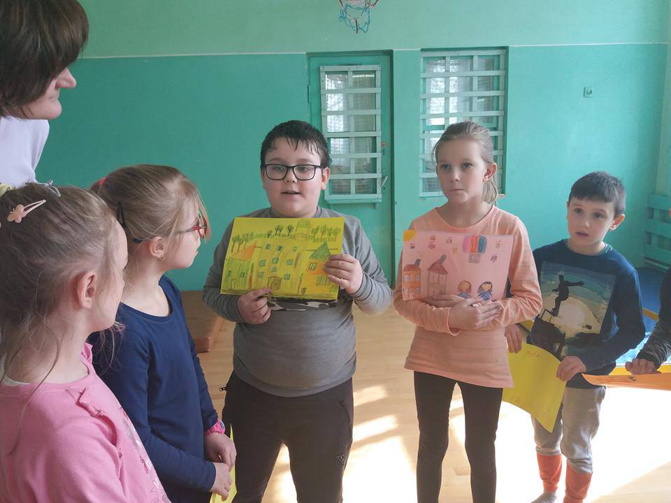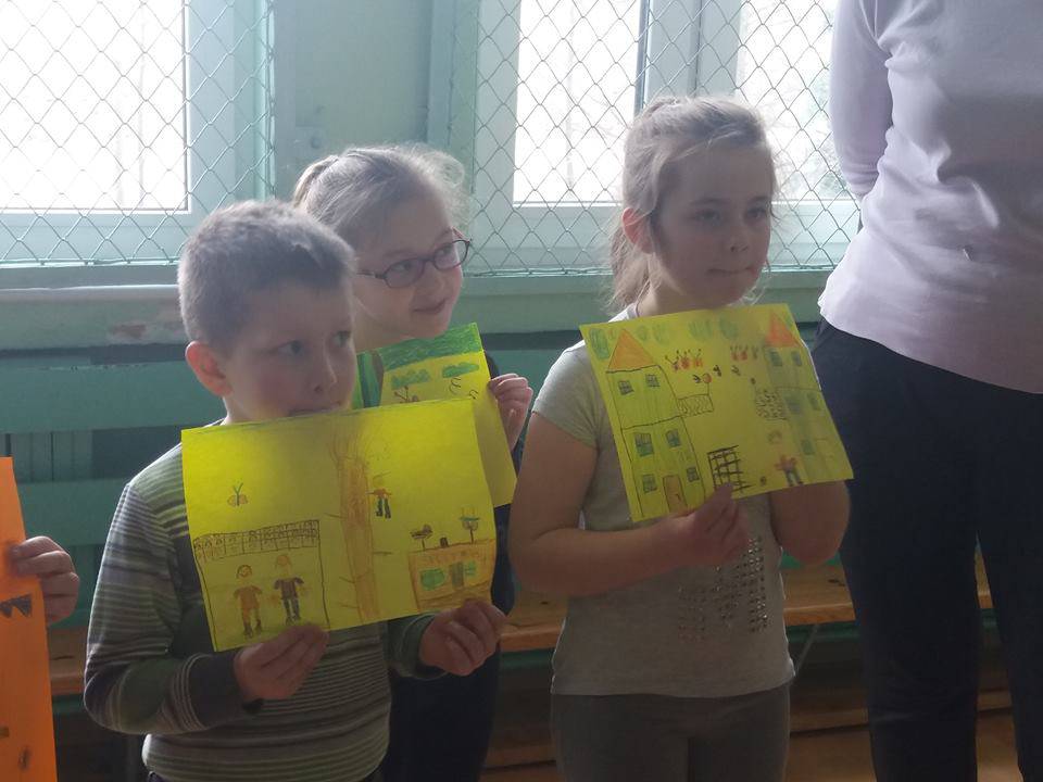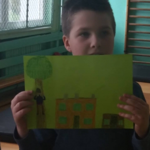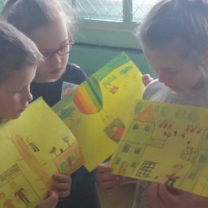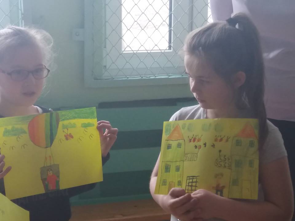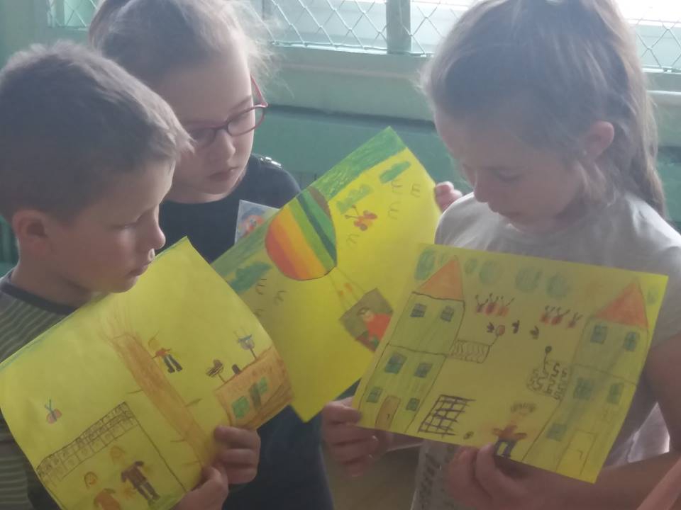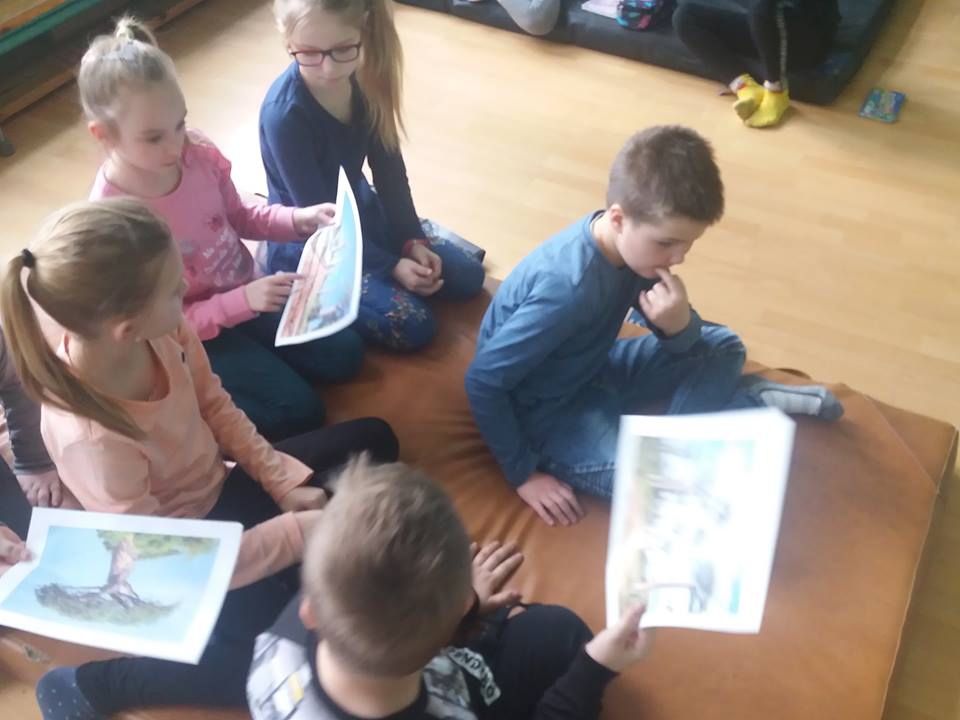 Po wysłuchaniu opowiadania, każde dziecko miało za zadanie narysować to co może jeszcze zobaczyć z wysokiego drzewa. Prace uczniów ukazały bogatą wyobraźnię, różnorodne spojrzenie na świat. Każda z prac została wnikliwie omówiona.