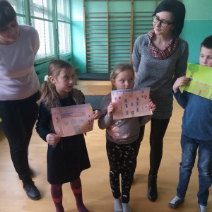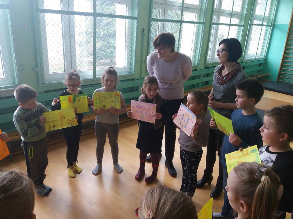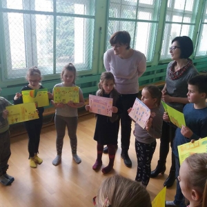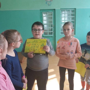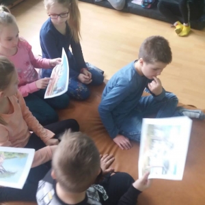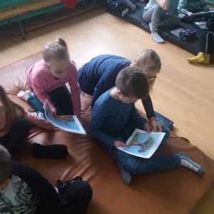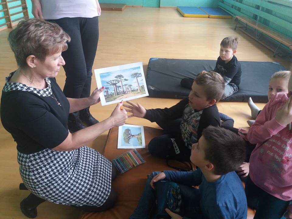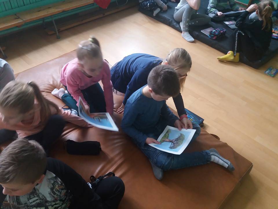 Podczas czwartkowego spotkania, bibliotekarki przeprowadziły lekcję biblioteczną wśród pierwszo i drugoklasistów. Przeczytały uczniom książkę „Drzewo do samego nieba” Marii Terlikowskiej. Słuchacze poznali historię dzieci mieszkającychw starej kamienicy, na których podwórzu rosło tytułowe drzewo. To na nim bohaterowie książki przeżywali różne przygody. W trakcie lektury słuchacze dowiedzieli się co to jest kuźnia, oficyna czy magiel, poznali największe drzewo świata – baobab.