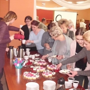 Oczywiście z okazji Dnia Kobiet nie mogło zabraknąć wspólnej kawy i domowych wypieków. Wszystkie panie w kuluarach wymieniały się uwagami i spostrzeżeniami. Marcowy wieczór upłynął w miłej i przyjaznej atmosferze z dużą dawką śmiechu.