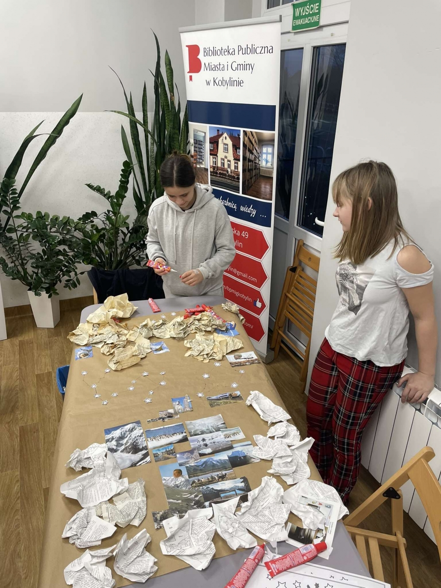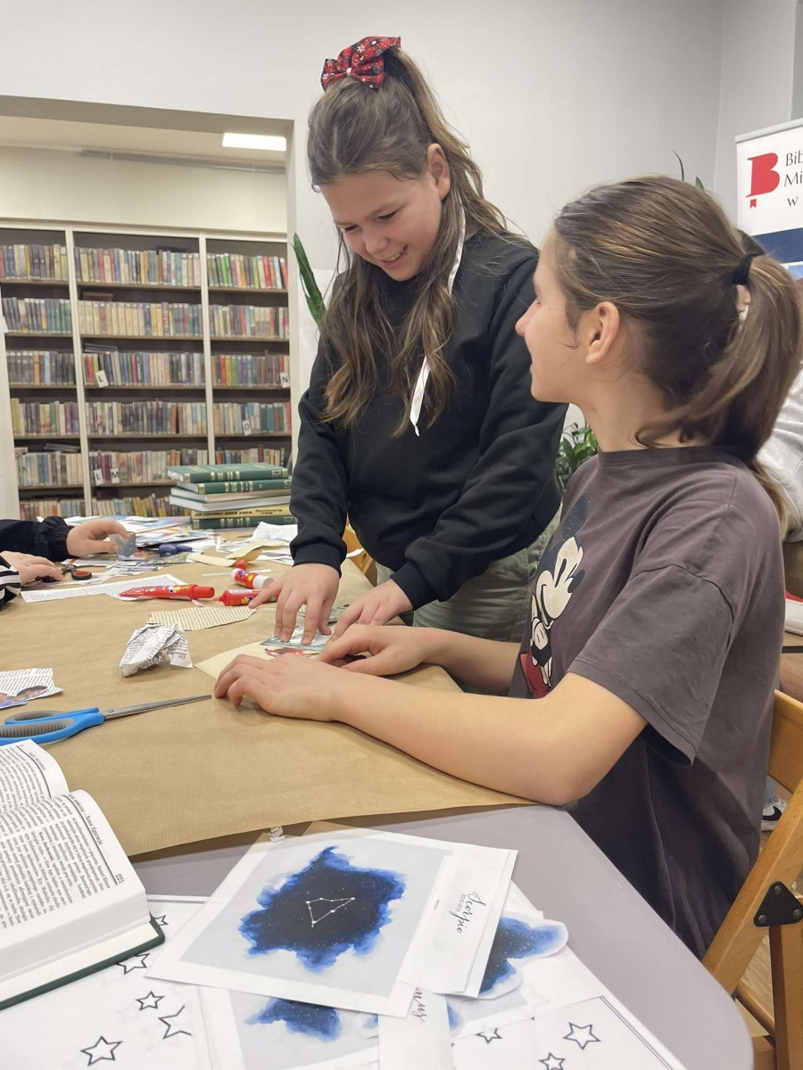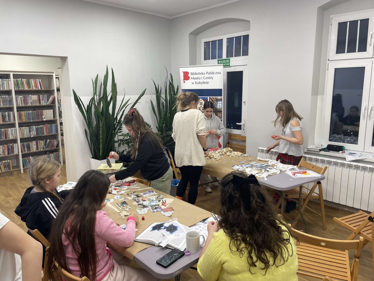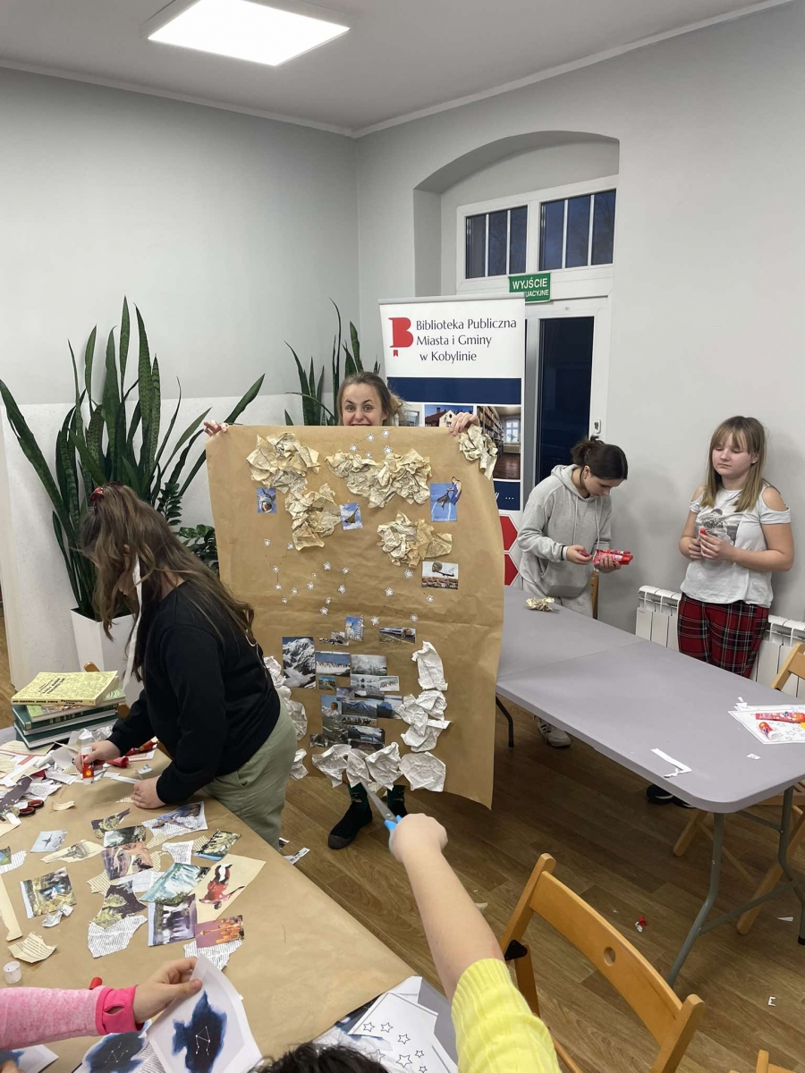 Zajęcia prowadziła animatorka Dorota Jagodzińska, która zabrała nas do świata gwiazdozbiorów oraz znaków zodiakalnych. Następnie przeszliśmy do części twórczej, w której wykorzystywaliśmy przeznaczone na makulaturę książki. Z wtórnych materiałów młodzież robiła zimowe kolaże. Ich wyobraźnia zachwycała!