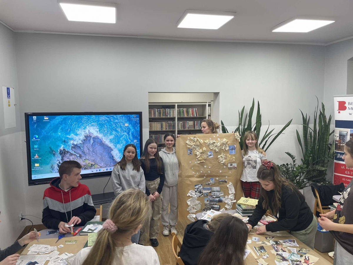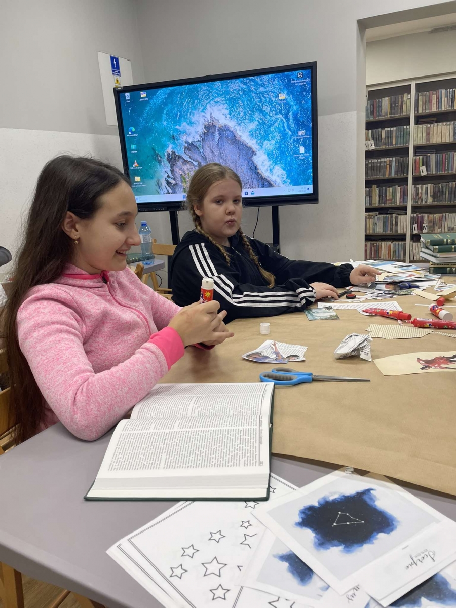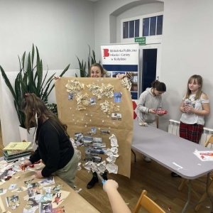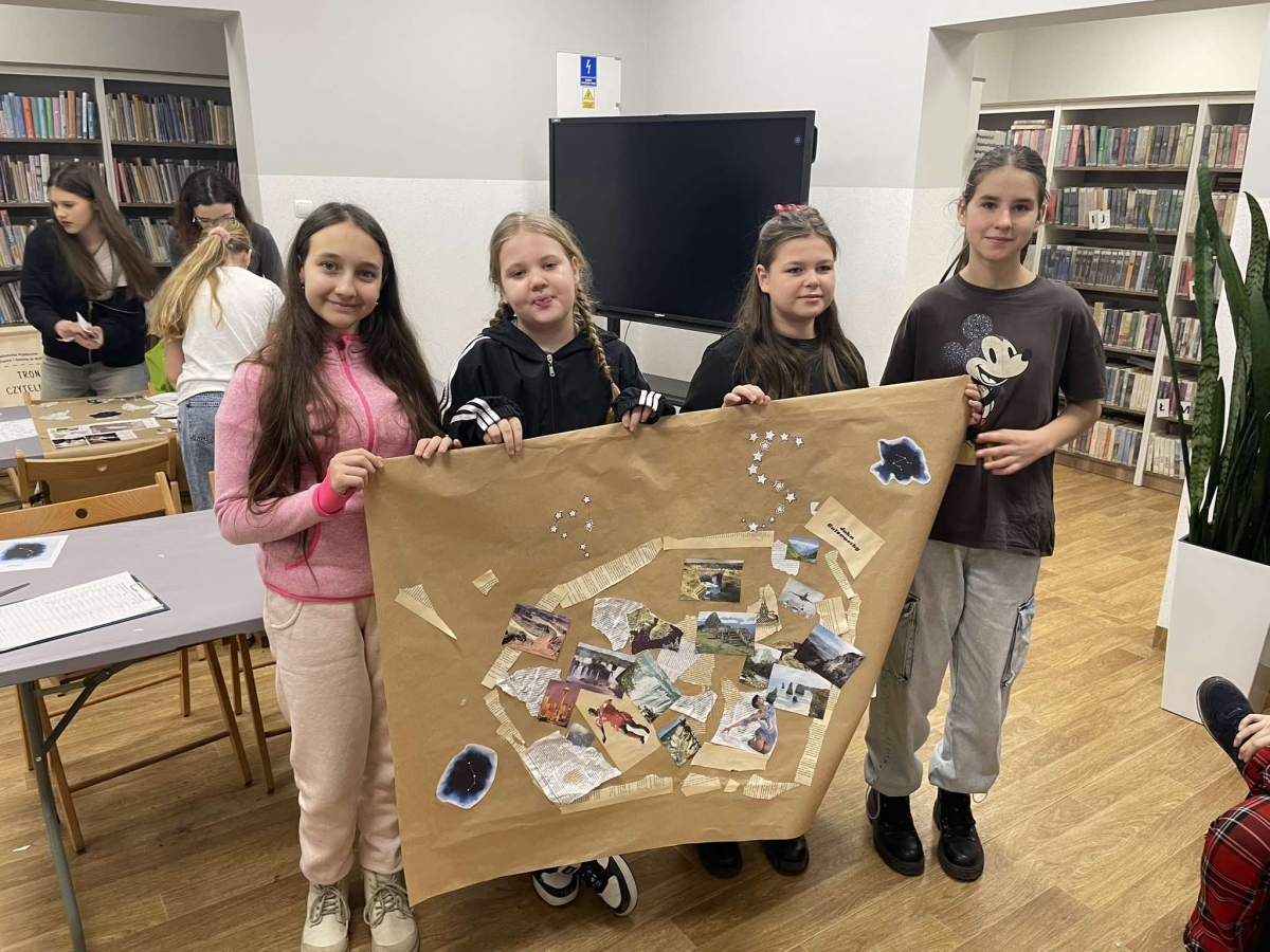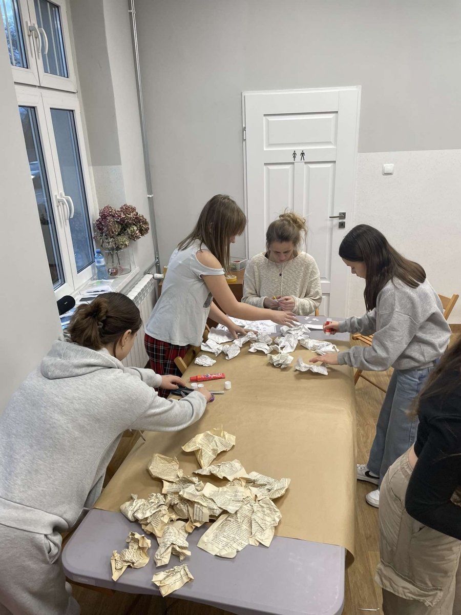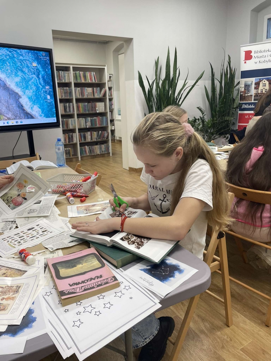Zajęcia prowadziła animatorka Dorota Jagodzińska, która zabrała nas do świata gwiazdozbiorów oraz znaków zodiakalnych. Następnie przeszliśmy do części twórczej, w której wykorzystywaliśmy przeznaczone na makulaturę książki. Z wtórnych materiałów młodzież robiła zimowe kolaże. Ich wyobraźnia zachwycała!