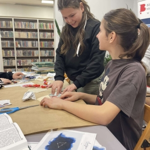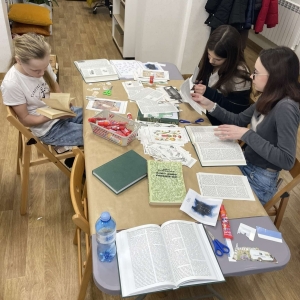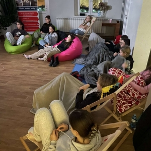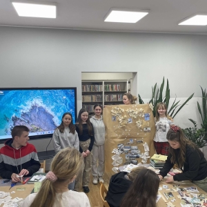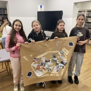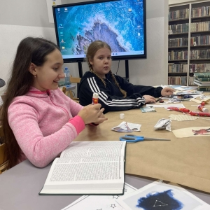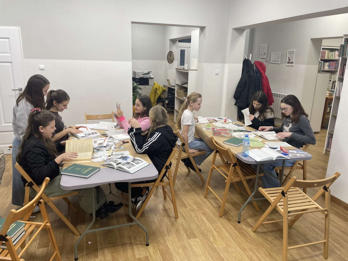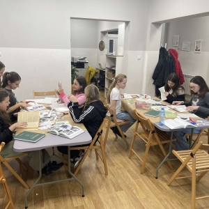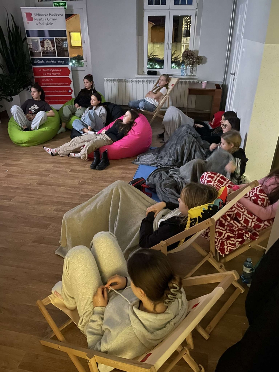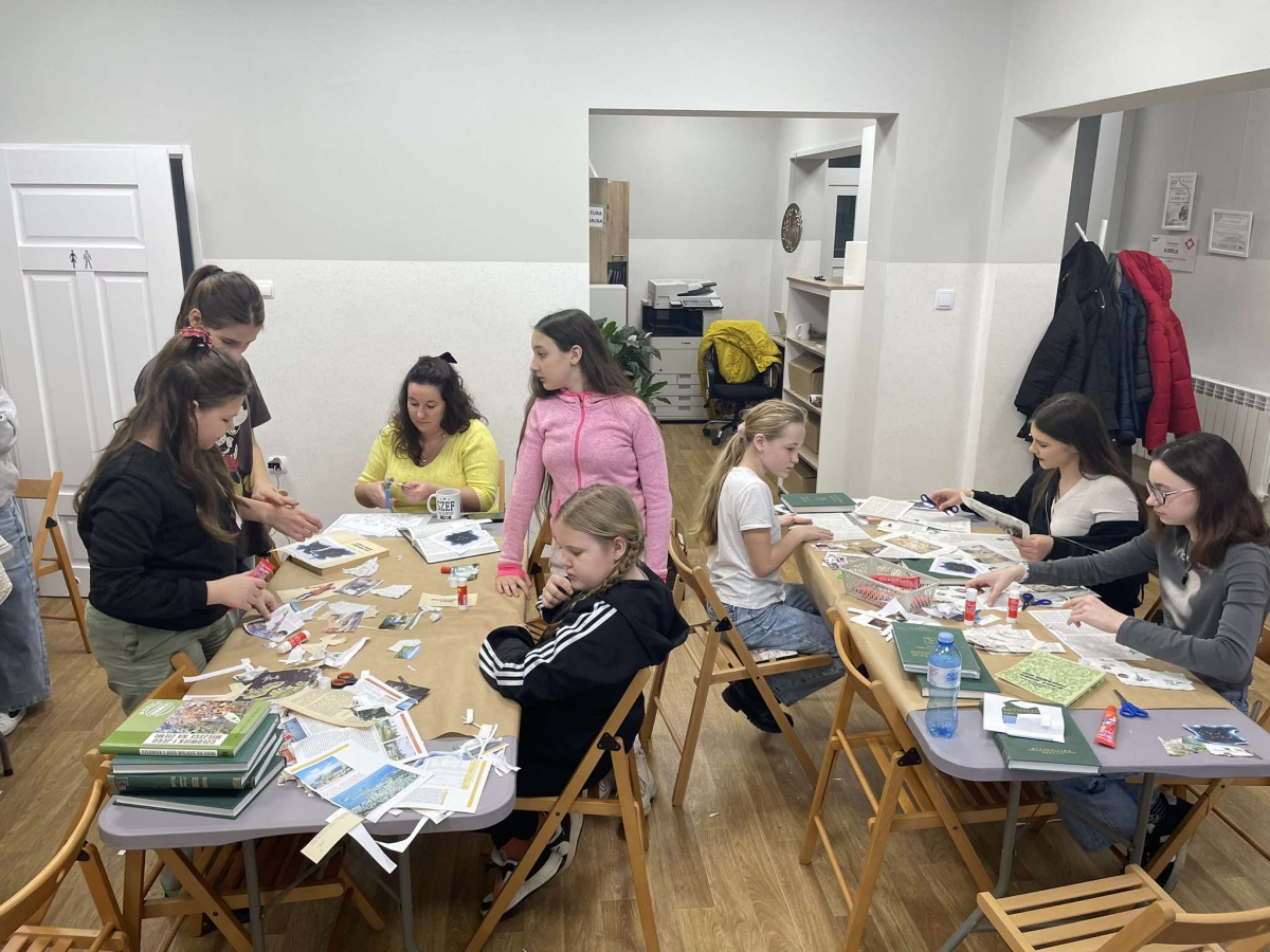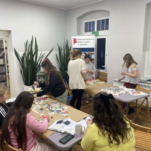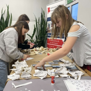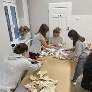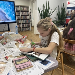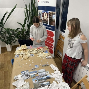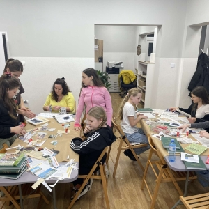 Zajęcia prowadziła animatorka Dorota Jagodzińska, która zabrała nas do świata gwiazdozbiorów oraz znaków zodiakalnych. Następnie przeszliśmy do części twórczej, w której wykorzystywaliśmy przeznaczone na makulaturę książki. Z wtórnych materiałów młodzież robiła zimowe kolaże. Ich wyobraźnia zachwycała!