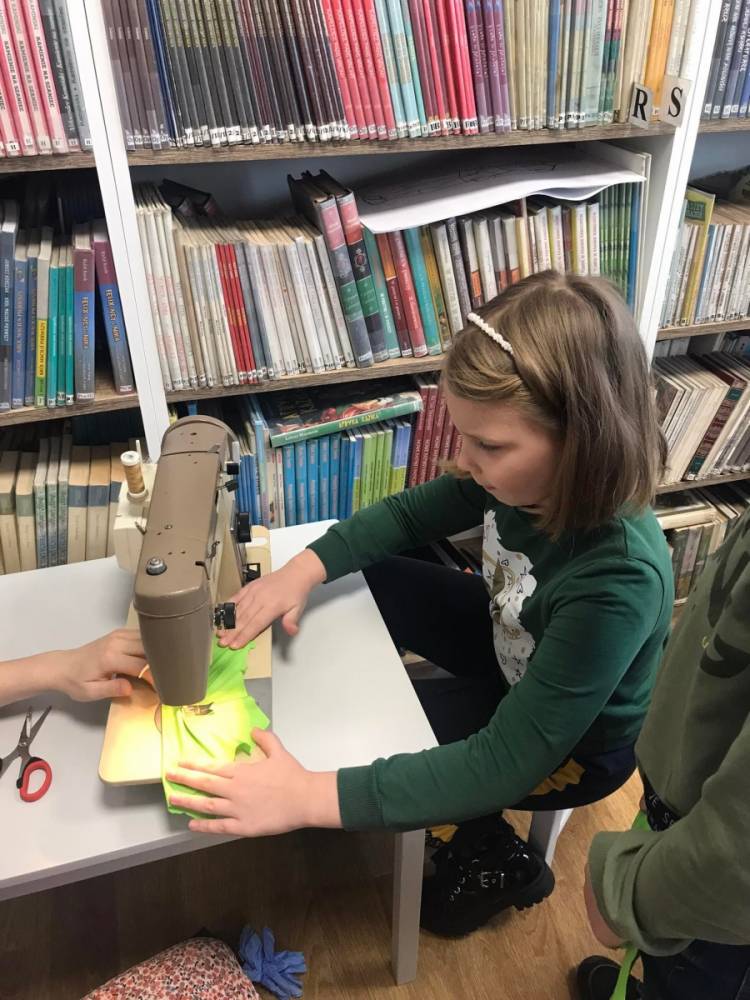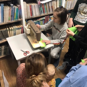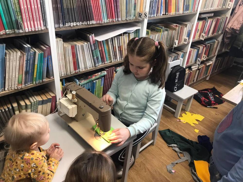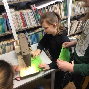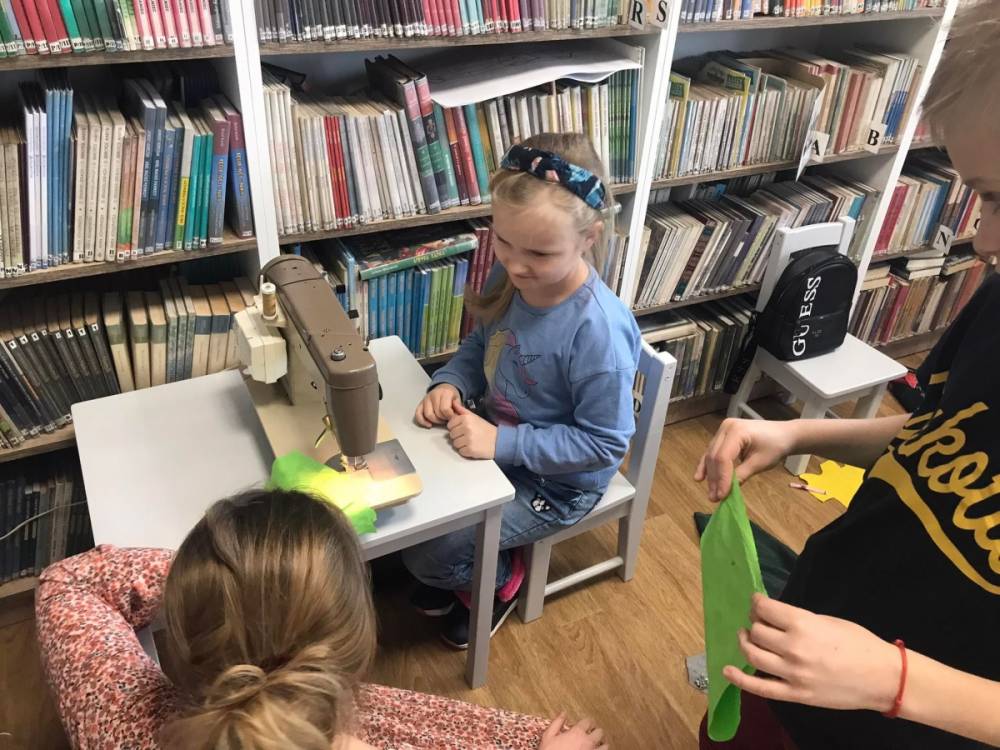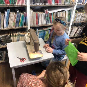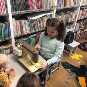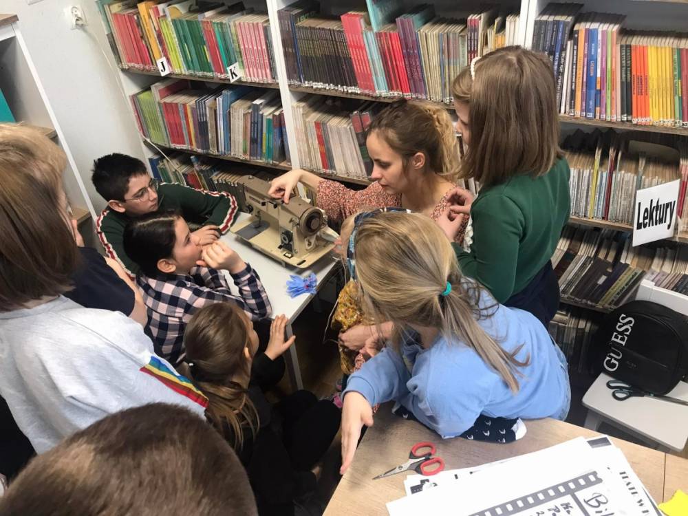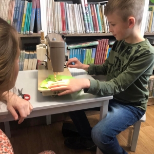 Dorota przygotowała także niespodziankę… Przyniosła swoją maszynę do szycia! Wyjaśniła ona mechanizm działania tego urządzenia oraz… uczyła dzieci szycia! Przecież do każdego spektaklu potrzebne są aktorom stroje, które należy zaprojektować i uszyć. :-)