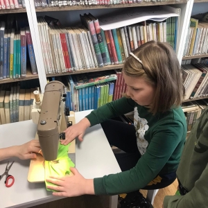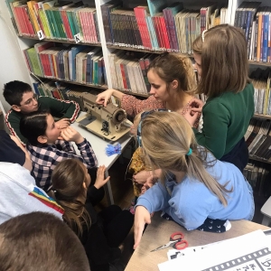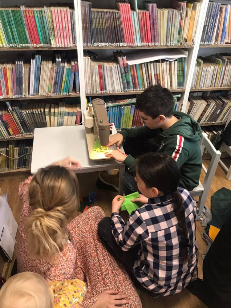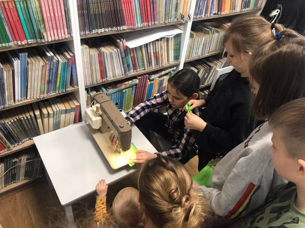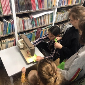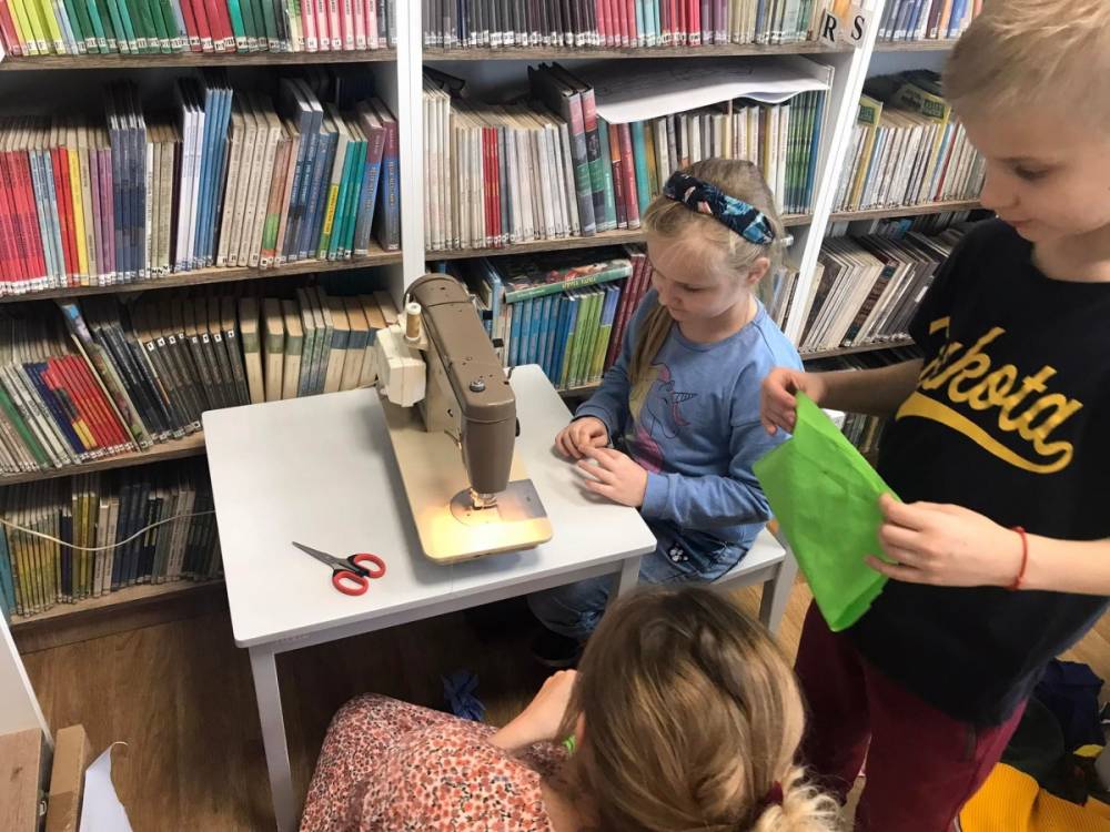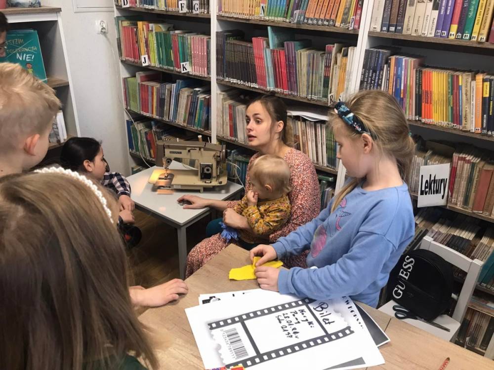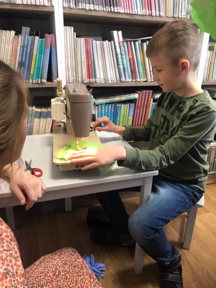 Dorota przygotowała także niespodziankę… Przyniosła swoją maszynę do szycia! Wyjaśniła ona mechanizm działania tego urządzenia oraz… uczyła dzieci szycia! Przecież do każdego spektaklu potrzebne są aktorom stroje, które należy zaprojektować i uszyć. :-)