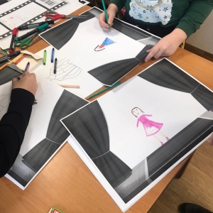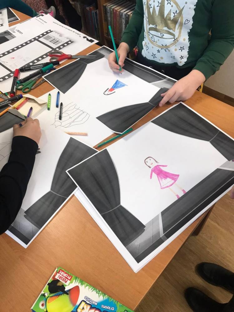 Jako, że był to finałowy dzień zajęć uczestnicy dopracowywali swoje pomysły teatralne. Tworzyli więc oni stroje dla bohaterów swoich historii, ozdabiali je kolorami, materiałami… Wymyślali oraz aranżowali scenę teatralną. Robili plakaty zapraszające na spektakl, nadając im tytuł, opis przedstawienia, miejsce, czas. Oczywiście nie zabrakło także biletów na każde widowisko teatralne, które opisywały dzieci.