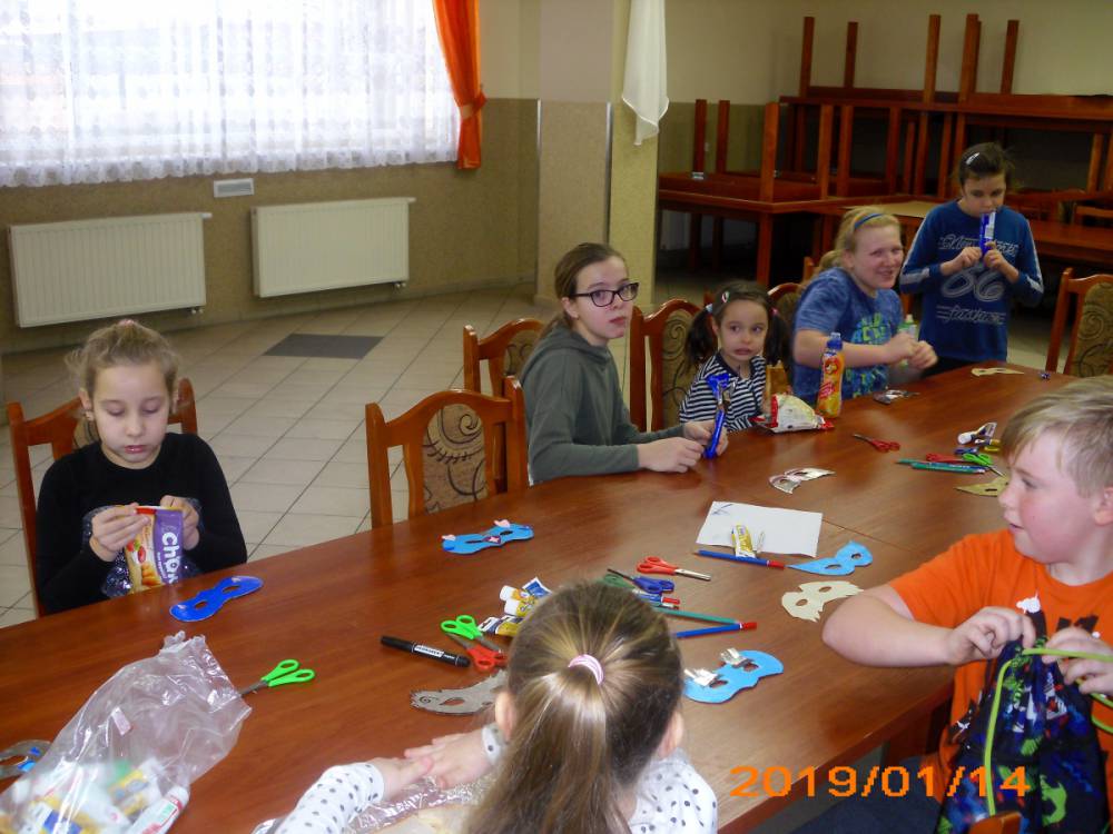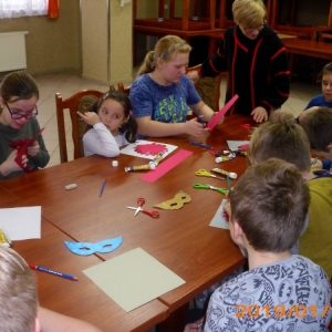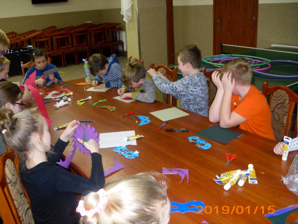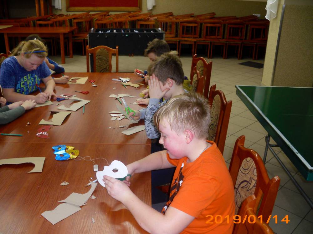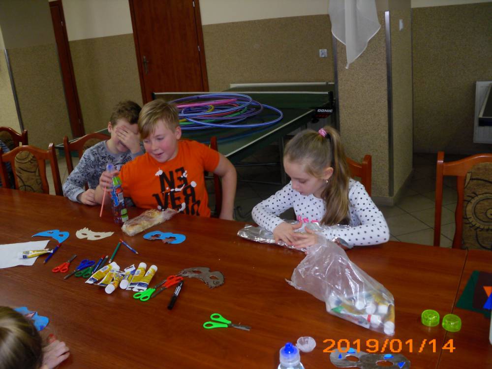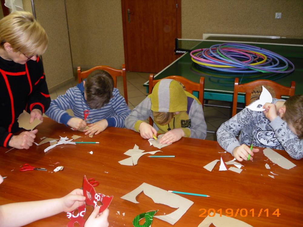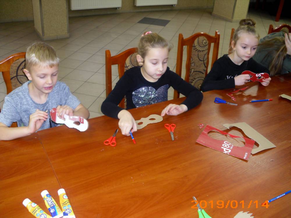W kolejnym dniu dzieci wykonywały prace manualne. Ponieważ jest czas karnawału, nie mogło zabraknąć masek karnawałowych. Dzieci wycinały je, a następnie ozdabiały według własnego pomysłu. Powstały bardzo kolorowe dzieła, często przedstawiające postacie z bajek. W drugiej części spotkania uczestnicy robili koszyczki na cukierki dla babci i dziadka, które idealnie nadawały się na prezent.