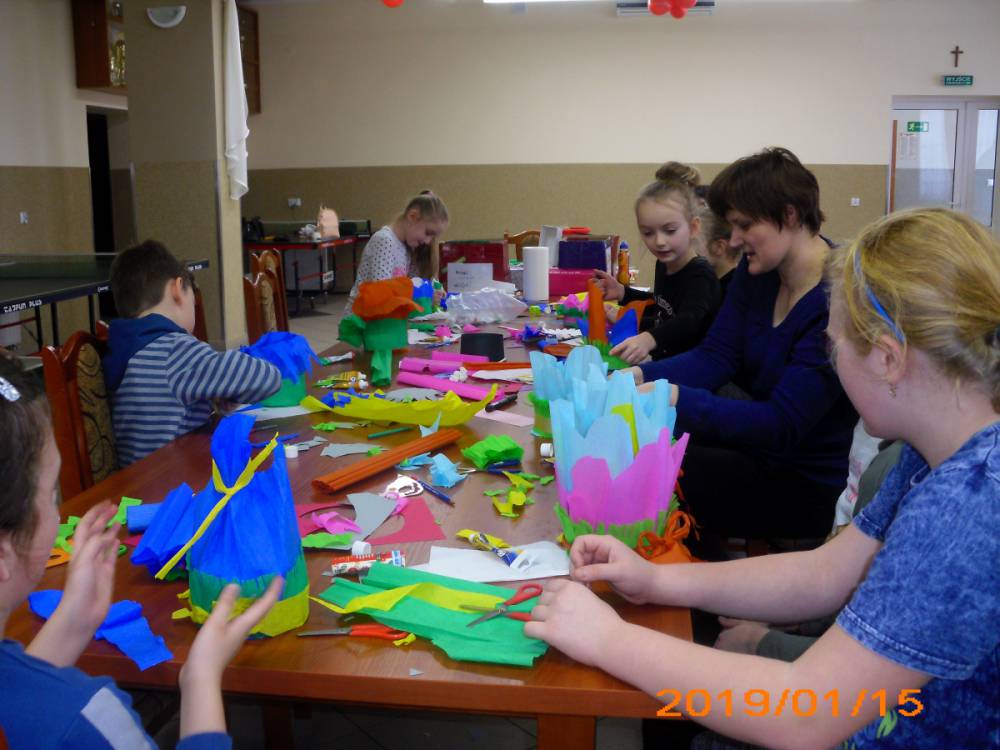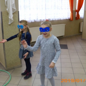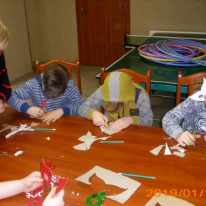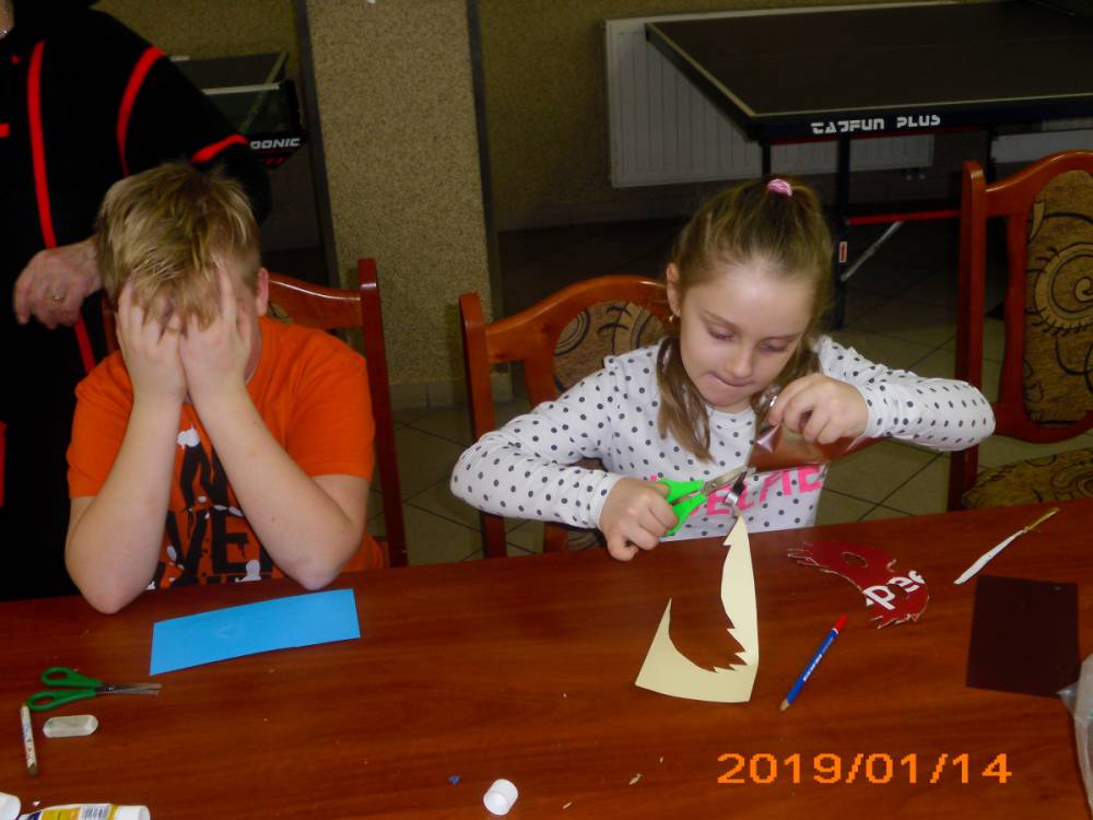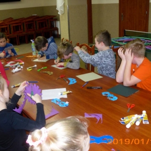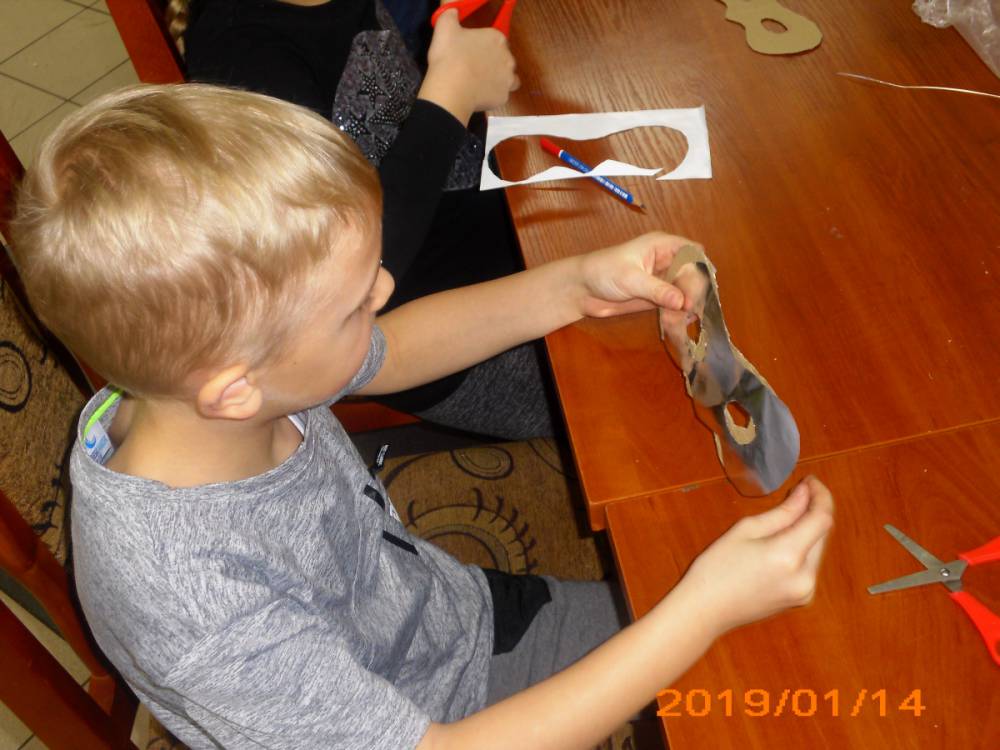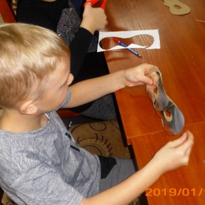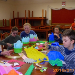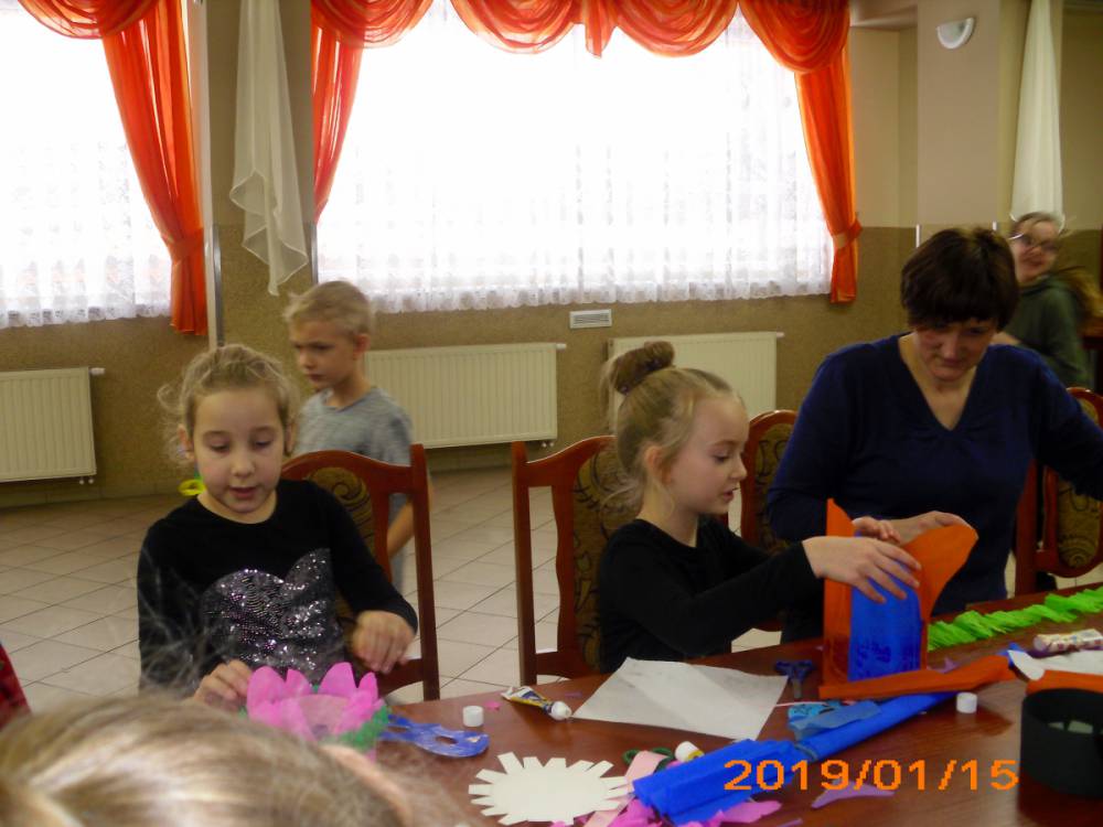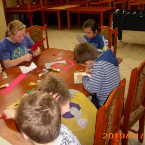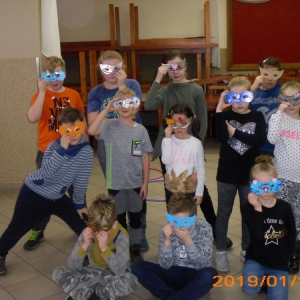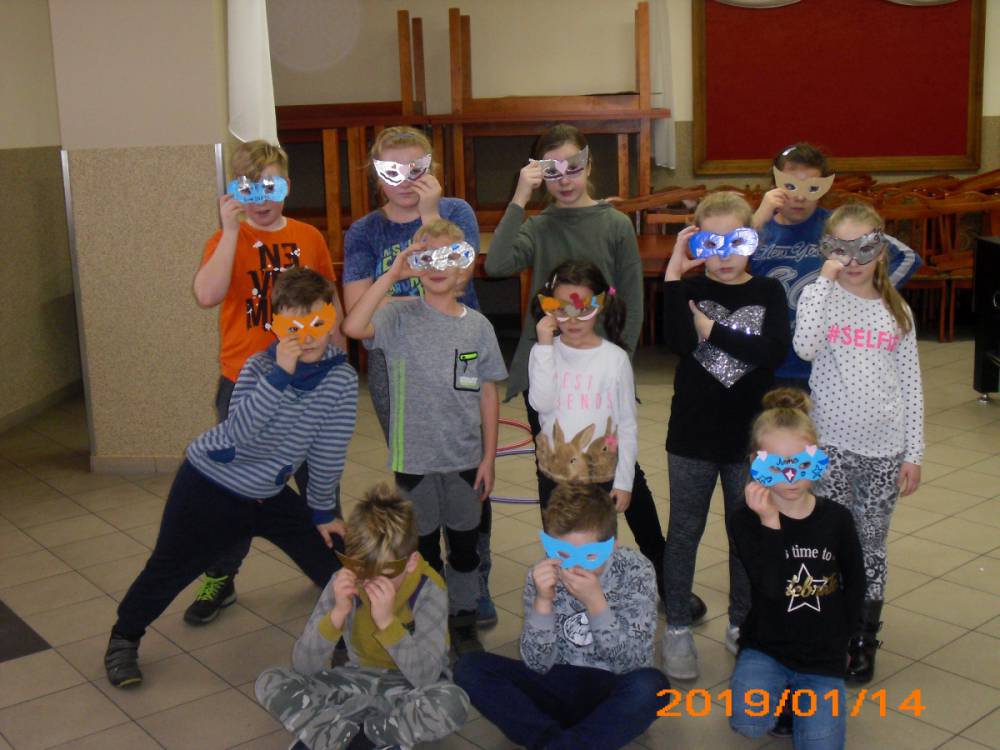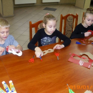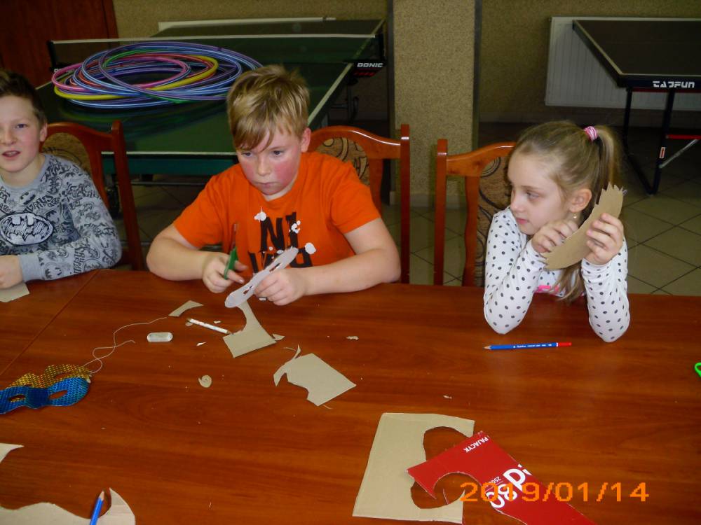 W kolejnym dniu dzieci wykonywały prace manualne. Ponieważ jest czas karnawału, nie mogło zabraknąć masek karnawałowych. Dzieci wycinały je, a następnie ozdabiały według własnego pomysłu. Powstały bardzo kolorowe dzieła, często przedstawiające postacie z bajek. W drugiej części spotkania uczestnicy robili koszyczki na cukierki dla babci i dziadka, które idealnie nadawały się na prezent.