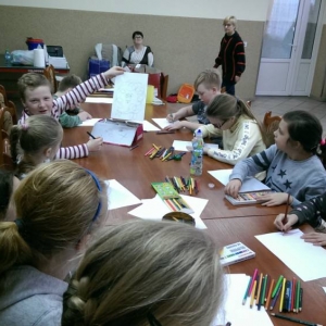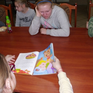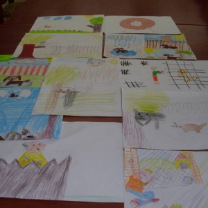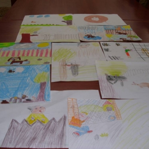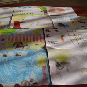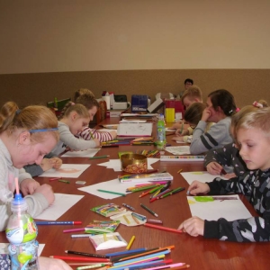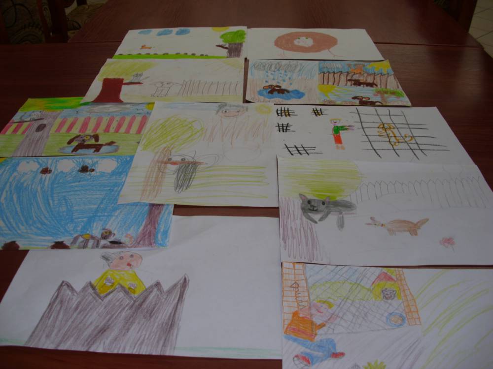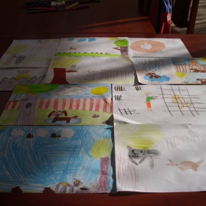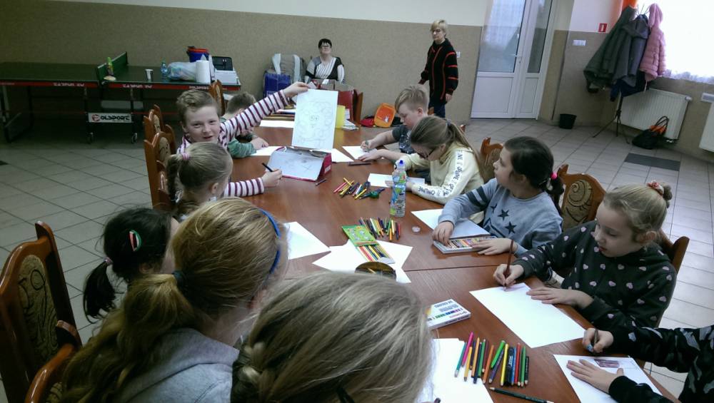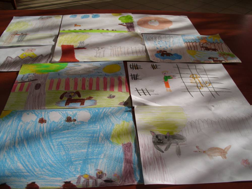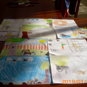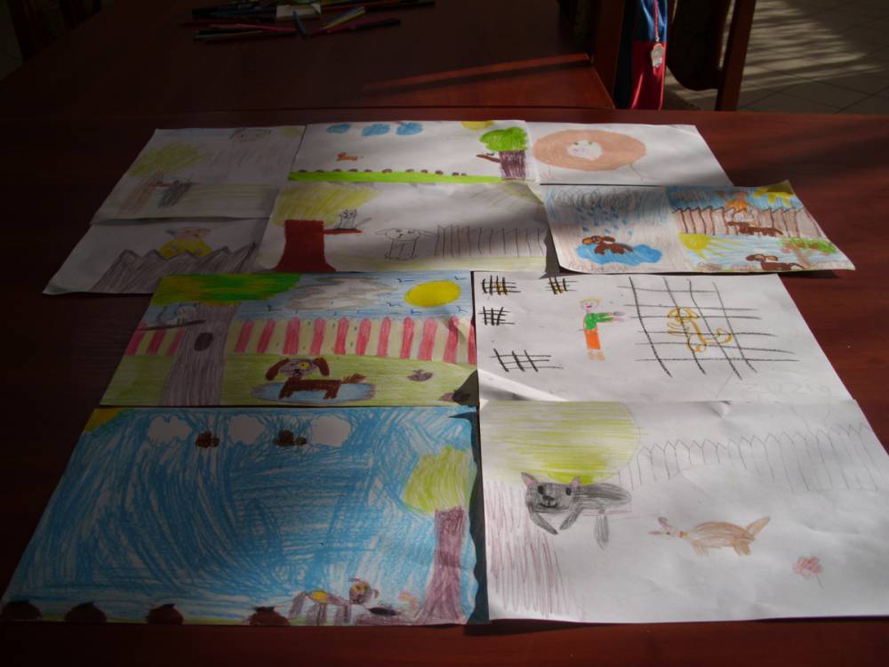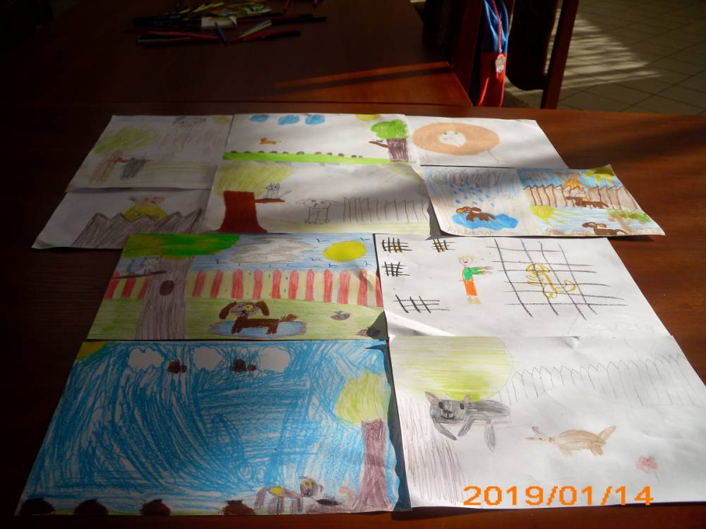 Dla zaczerpnięcia tchu, między dyscyplinami, uczestnicy wysłuchali bajki „Mój przyjaciel piesek”, następnie wykonali do niej ilustracje. Każdemu ze słuchaczy zapadła w pamięć inna scena z przeczytanej książki.