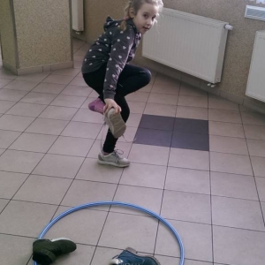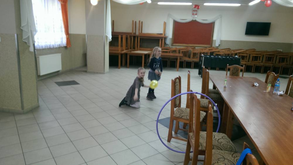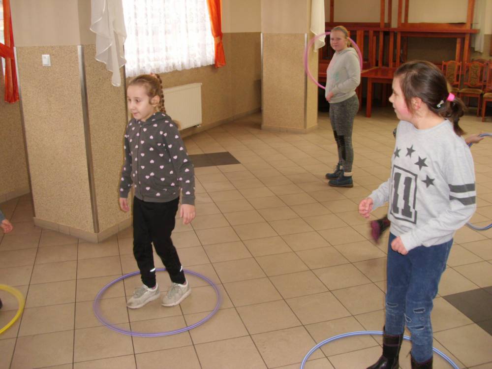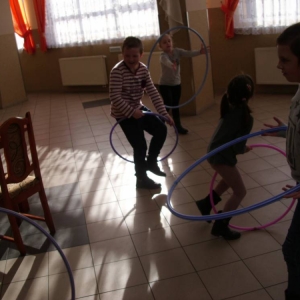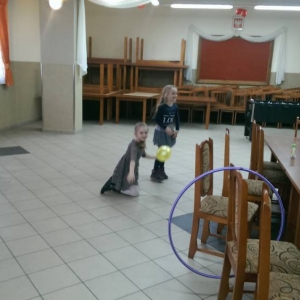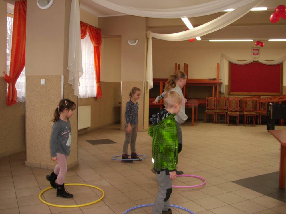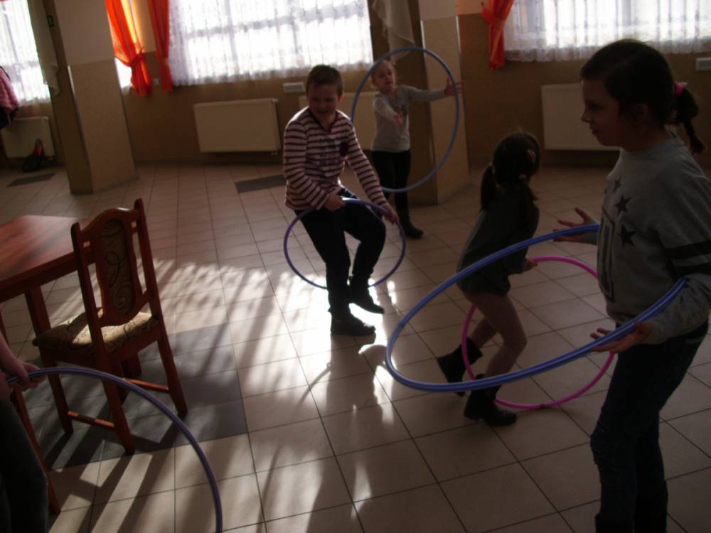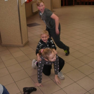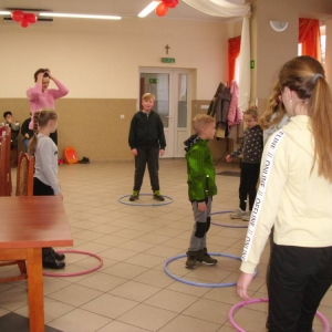 Dużym zainteresowaniem cieszyła się zabawa wiewiórki w dziupli. Dzieci swobodnie biegały po sali, a na zawołanie „ wiewiórki do dziupli lis idzie” każda wiewiórka wskakiwała do dziupli(koła). Ta dla której nie starczyło obręczy, odpadała z gry.