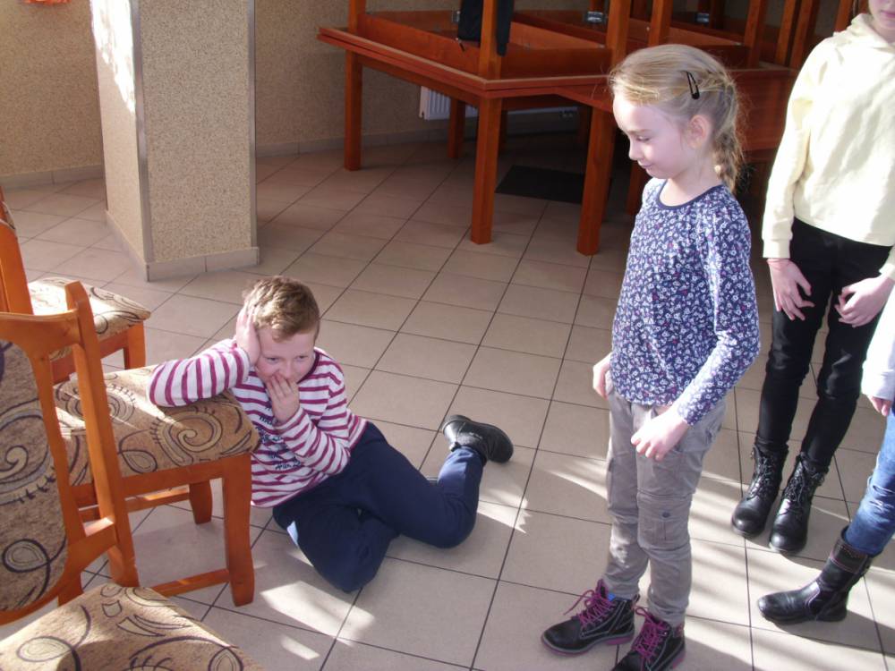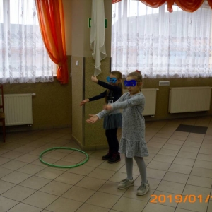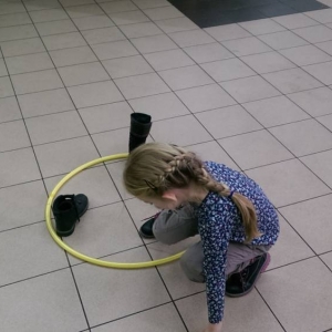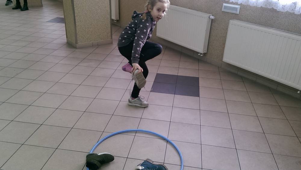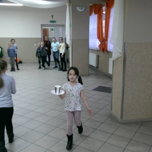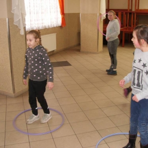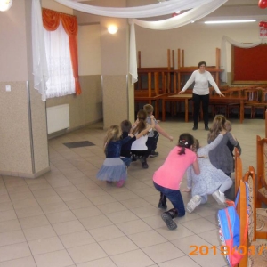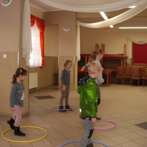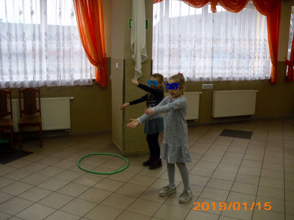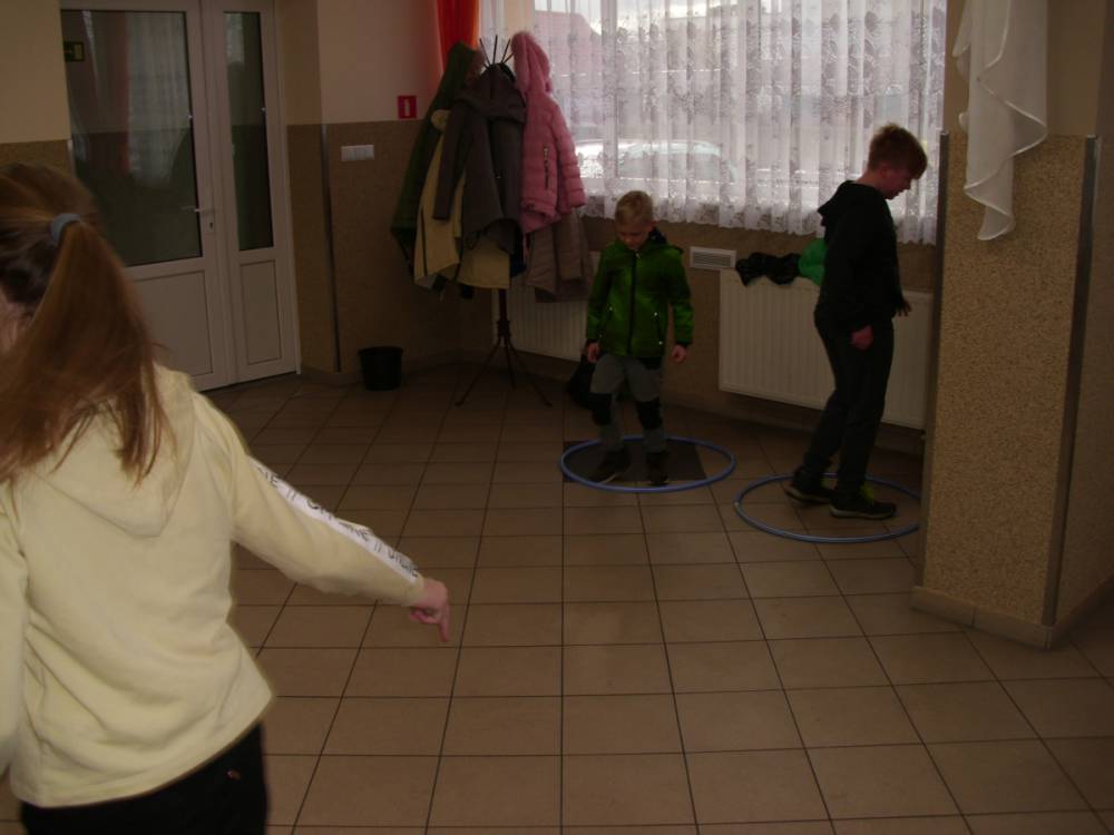 Dużym zainteresowaniem cieszyła się zabawa wiewiórki w dziupli. Dzieci swobodnie biegały po sali, a na zawołanie „ wiewiórki do dziupli lis idzie” każda wiewiórka wskakiwała do dziupli(koła). Ta dla której nie starczyło obręczy, odpadała z gry.