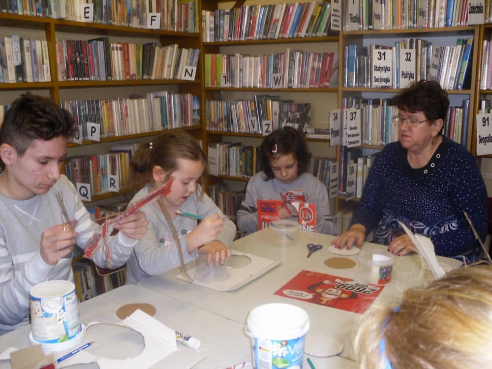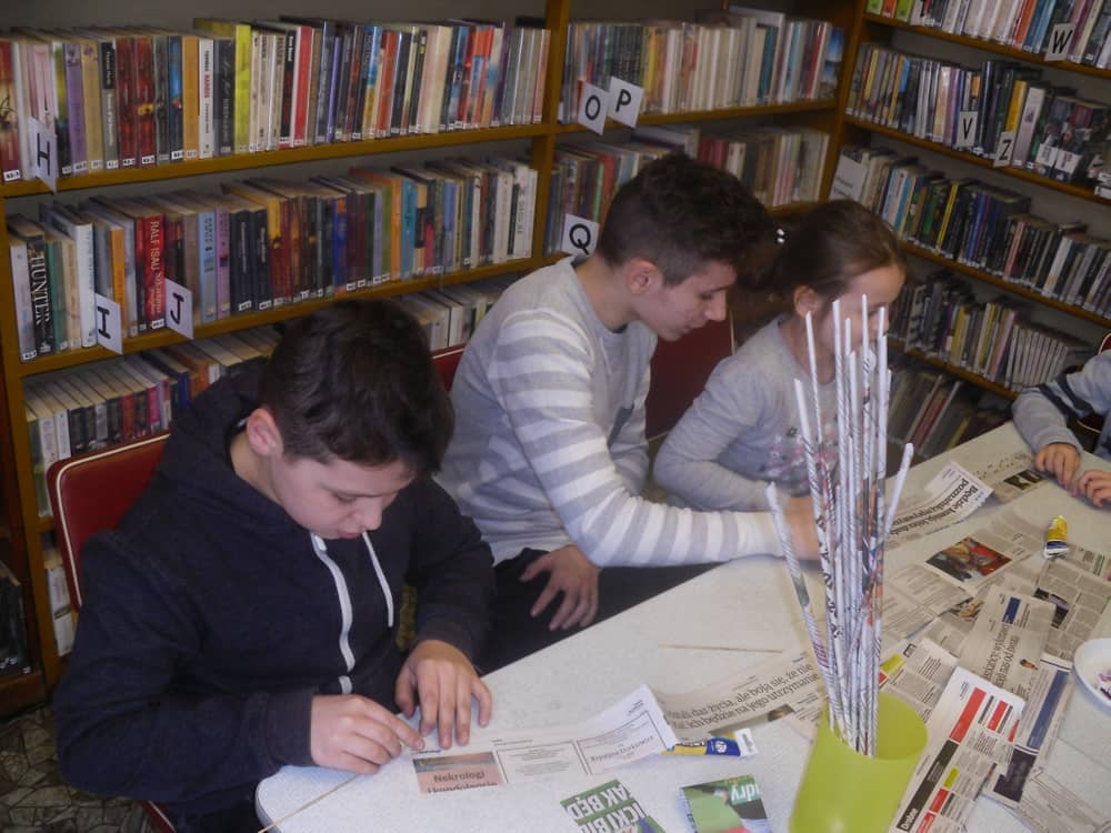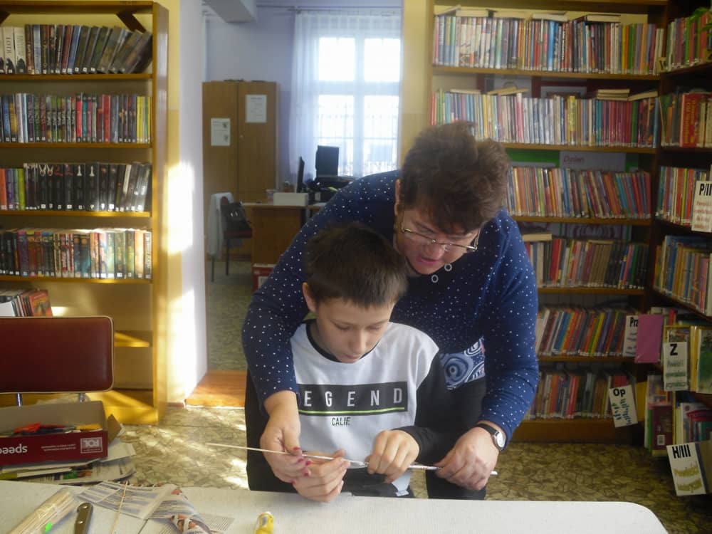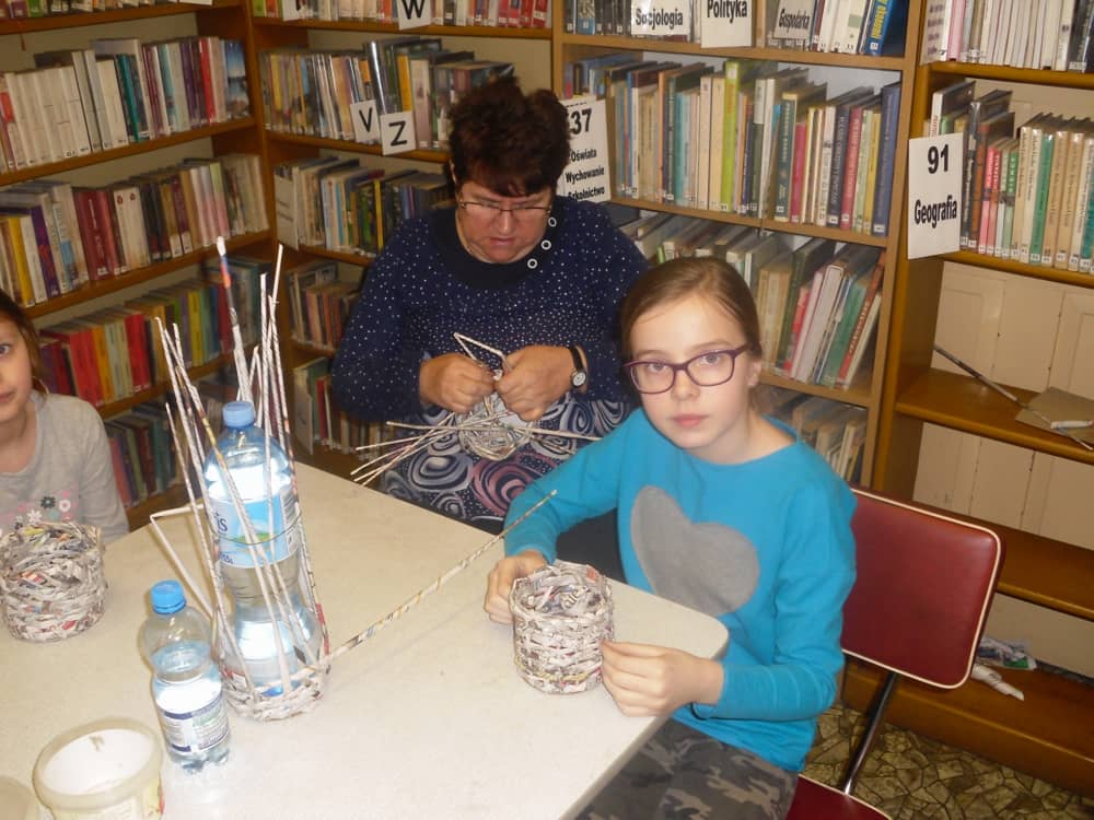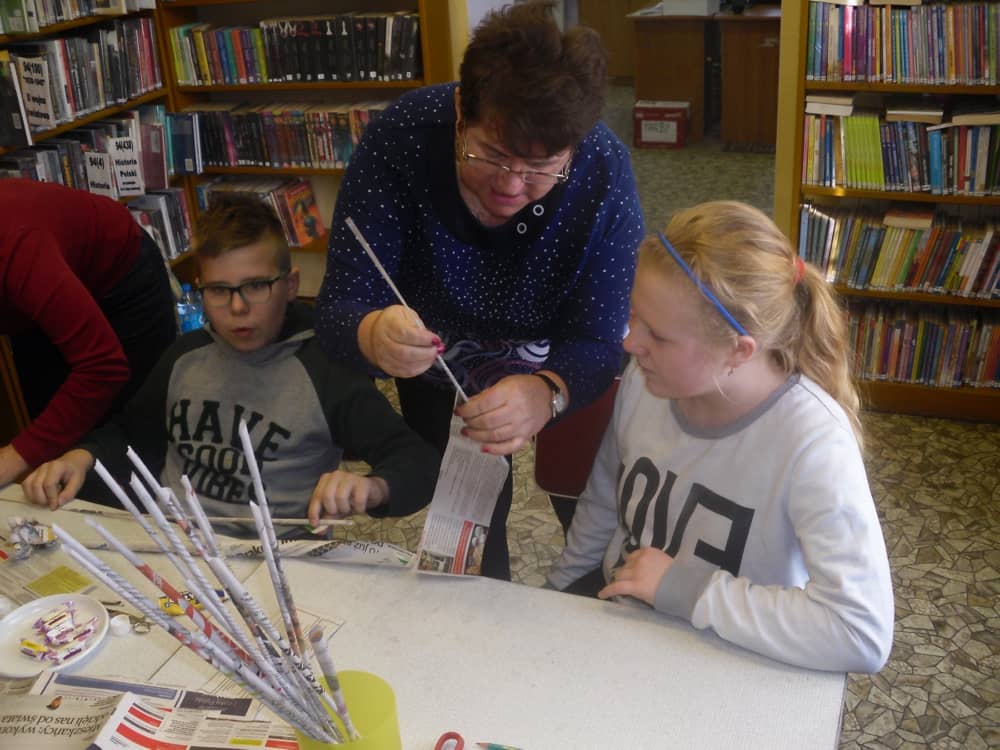 Jak co roku Filia Biblioteczna w Łagiewnikach zorganizowała ferie dla dzieci. W pierwszym dniu tj. 12 lutego dzieci gościły panią Marię Pomogier z Łagiewnik, której pasją jest rękodzieło. Pani Maria pokazała jak z gazet można zrobić koszyki z papierowej wikliny. Do ich wykonania potrzebne były rurki zwijane z papieru. Po wykonaniu 220 sztuk rurek według wskazówek instruktorki, dzieci przystąpiły do dalszej pracy. Pod czujnym okiem pani Marii i przy niewielkiej pomocy pań bibliotekarek uczestnicy rozpoczęli wyplatanie koszyczków. Młodzi adepci sztuki ludowej przekonali się, że do tworzenia wiklinowych cudów trzeba dużo czasu, dokładności, a zwłaszcza cierpliwości. Gdy koszyk był już wypleciony, pani Maria pokazała, w jaki sposób należy zakończyć dzieło, co okazało się najtrudniejszą rzeczą w całym jego wykonaniu. Po zakończeniu warsztatów dzieci podziękowały instruktorce za wyjątkowo ciekawe i twórcze zajęcia. Organizatorzy również przyłączają się do tych podziękowań.