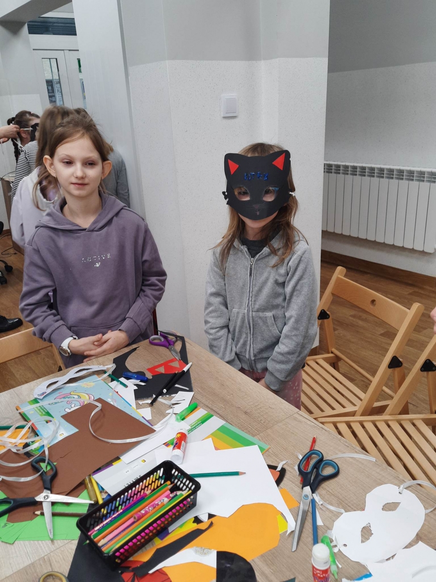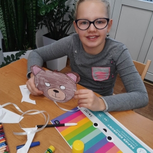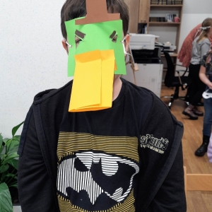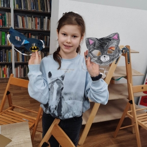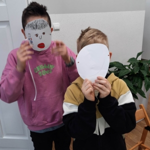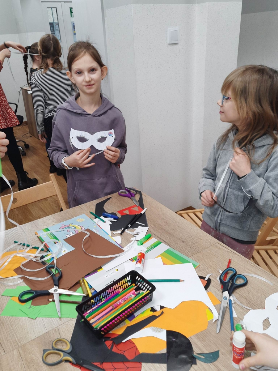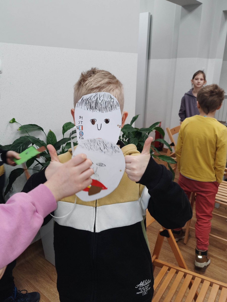 „Filmowy poniedziałek” – taki był tytuł przewodni pierwszego dnia warsztatów. Dlatego na początku złapaliśmy kartki i nożyczki w ręce, tworząc… maski ulubionych bohaterów filmowych! Uczestnicy zadziwili nas kreatywnością, tworząc maski przedstawiające Wednesday Addams, Pepe Pana Dziobaka z serialu animowanego „Fineasz i Ferb”, Kubusia Puchatka, Batmana i wiele, wiele innych.