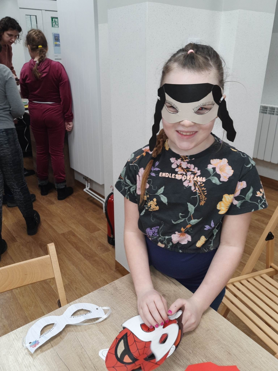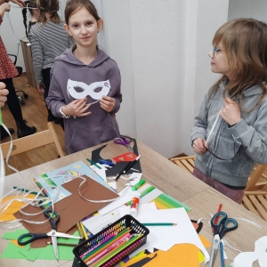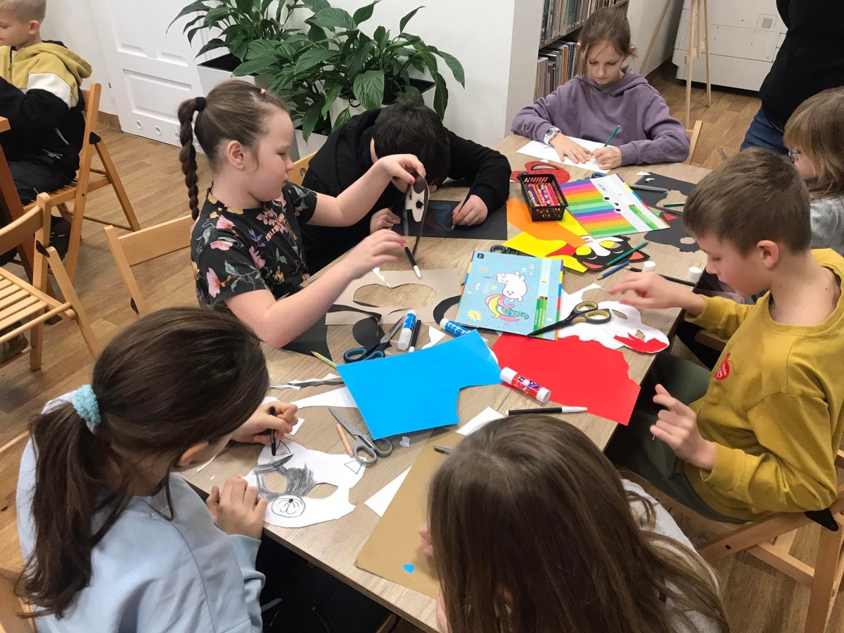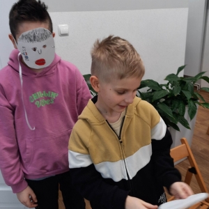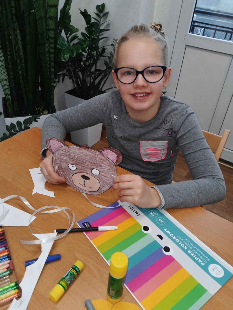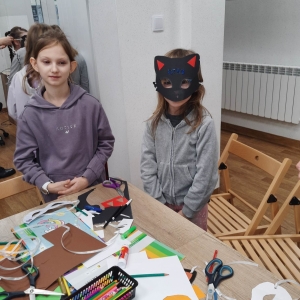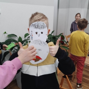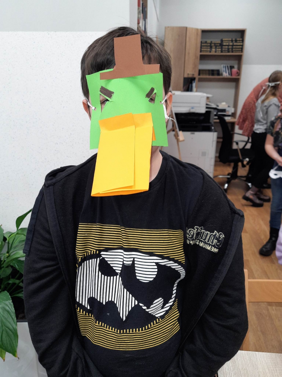 „Filmowy poniedziałek” – taki był tytuł przewodni pierwszego dnia warsztatów. Dlatego na początku złapaliśmy kartki i nożyczki w ręce, tworząc… maski ulubionych bohaterów filmowych! Uczestnicy zadziwili nas kreatywnością, tworząc maski przedstawiające Wednesday Addams, Pepe Pana Dziobaka z serialu animowanego „Fineasz i Ferb”, Kubusia Puchatka, Batmana i wiele, wiele innych.