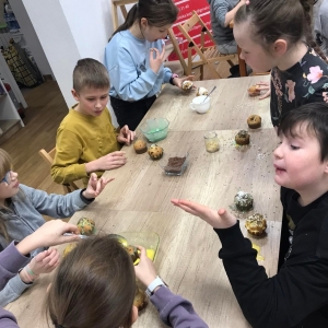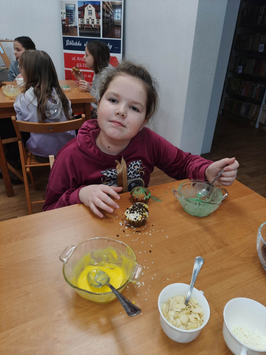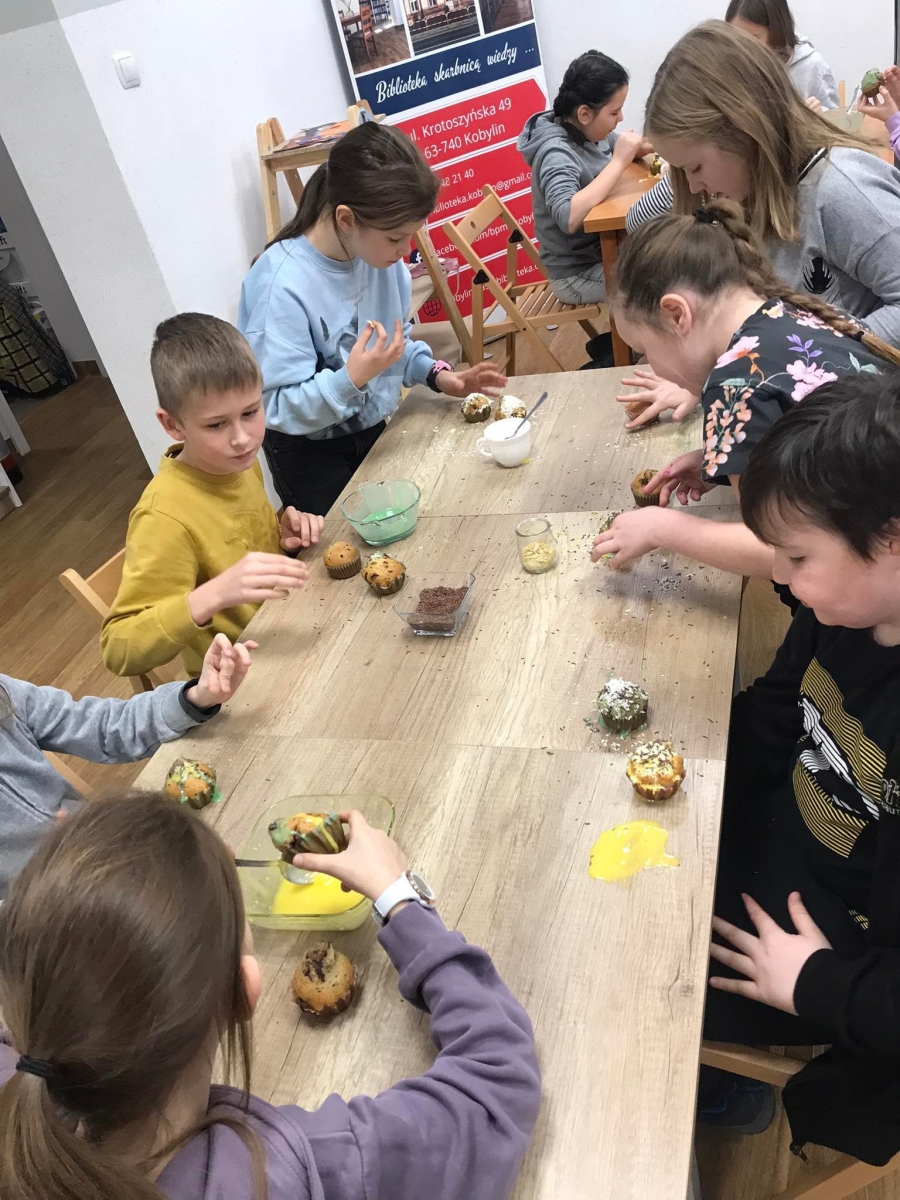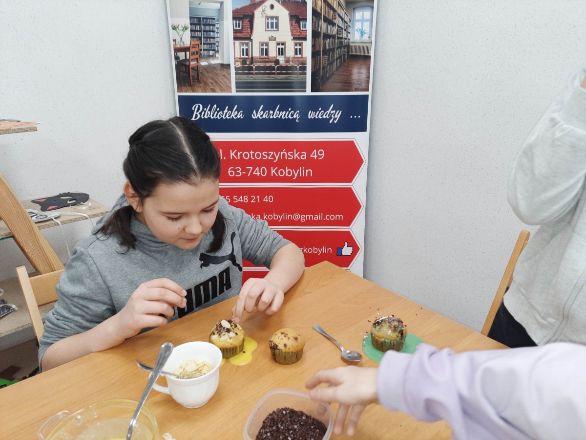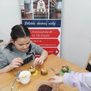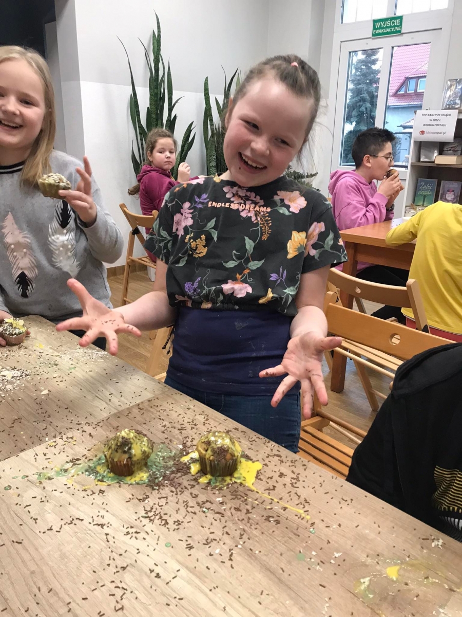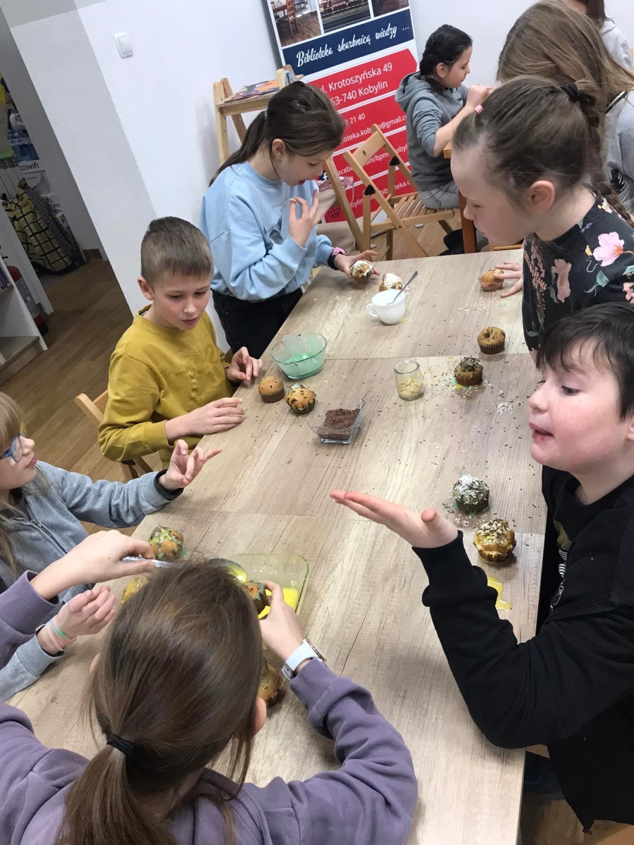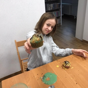 Trochę zgłodnieliśmy po papierowych warsztatach, dlatego… na stołach pojawiły się muffinki! Obok nich znajdowały się lukry w kolorach zielonym i żółtym, czekoladowe posypki, wiórki kokosowe, płatki migdałów… Zadaniem uczestników było ozdobienie swoich babeczek słodkimi polewami i posypkami. Zabawy było co nie miara! Jednak najprzyjemniejszy był koniec zdobienia – gdyż był to czas na smakowanie swoich muffinek. Mniam!
