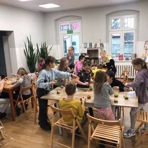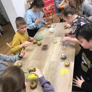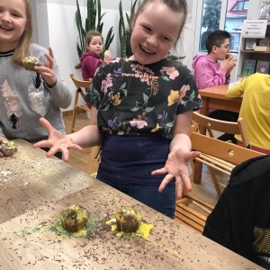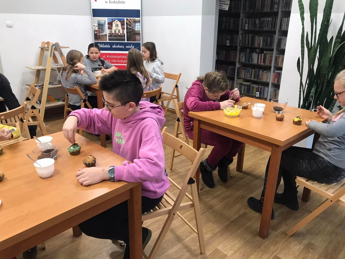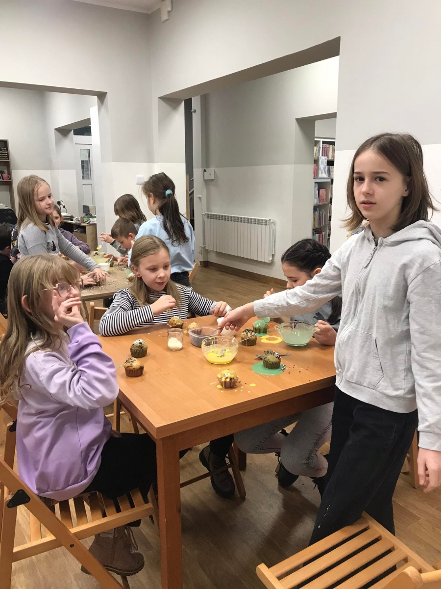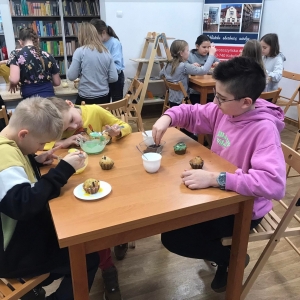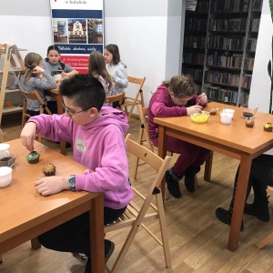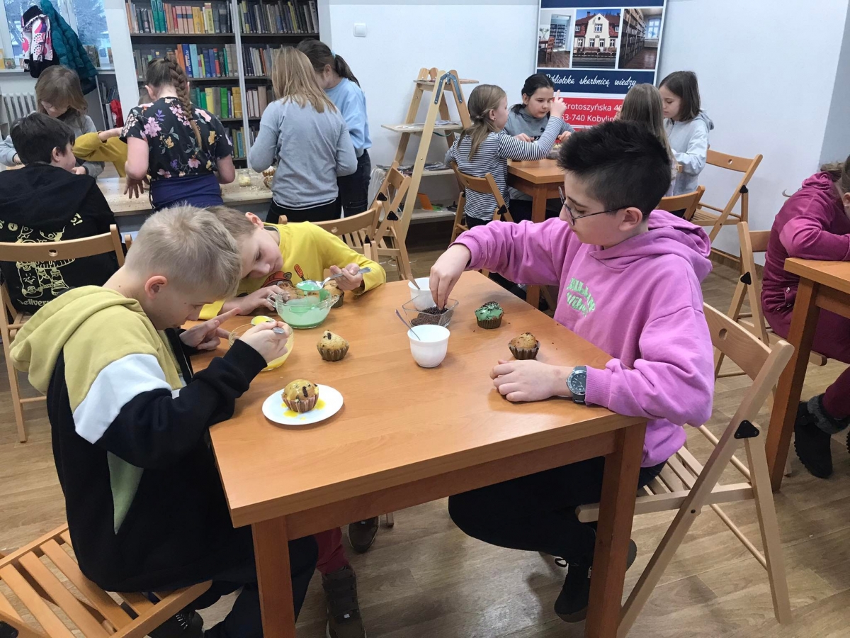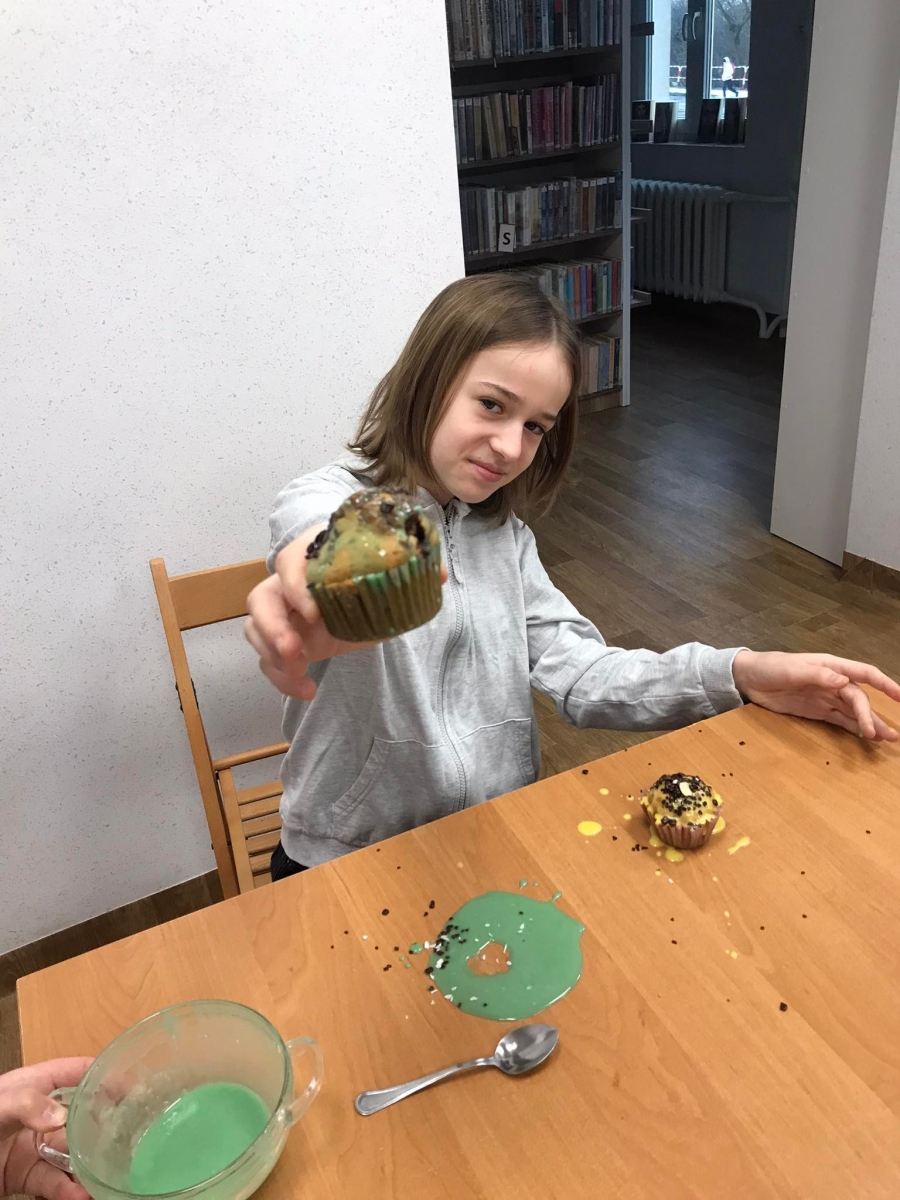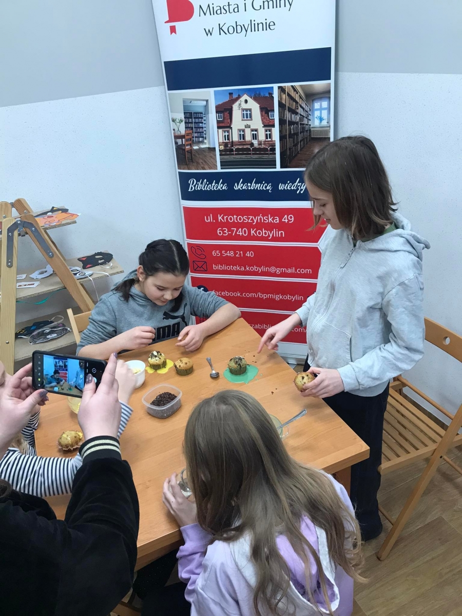 Trochę zgłodnieliśmy po papierowych warsztatach, dlatego… na stołach pojawiły się muffinki! Obok nich znajdowały się lukry w kolorach zielonym i żółtym, czekoladowe posypki, wiórki kokosowe, płatki migdałów… Zadaniem uczestników było ozdobienie swoich babeczek słodkimi polewami i posypkami. Zabawy było co nie miara! Jednak najprzyjemniejszy był koniec zdobienia – gdyż był to czas na smakowanie swoich muffinek. Mniam!