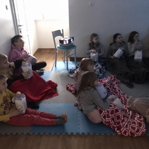Skoro był to „Filmowy poniedziałek” nie mogło zabraknąć… czegoś do obejrzenia! Przenieśliśmy się na piętro, gdzie czekała na uczestników specjalnie przygotowana sala filmowa. Zajadając się popcornem, otulając kocem, dzieci wczuwały się w kinowy klimat, oglądając przygotowane dla nich wideo.