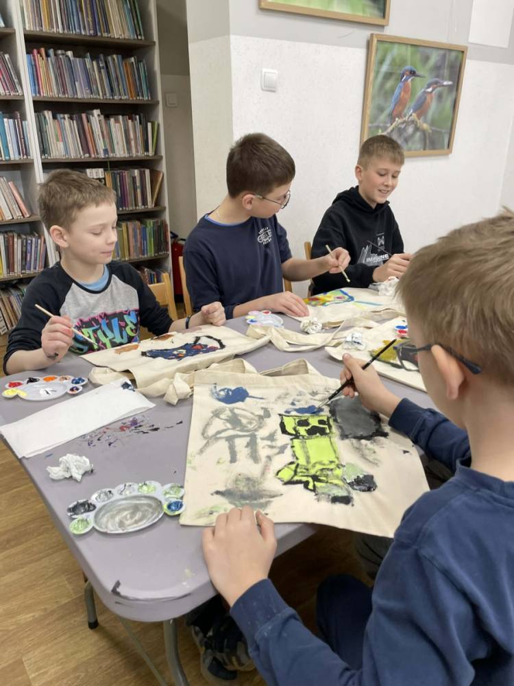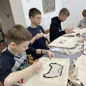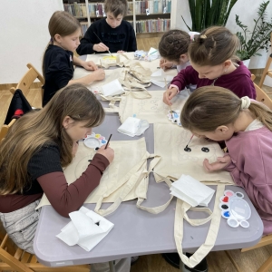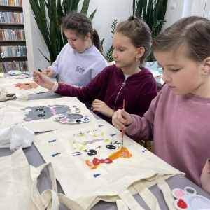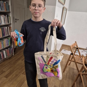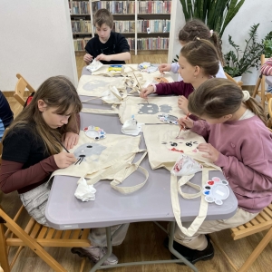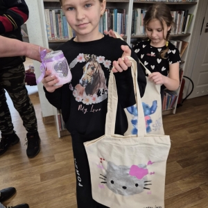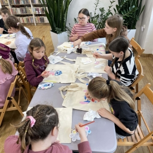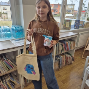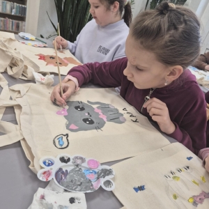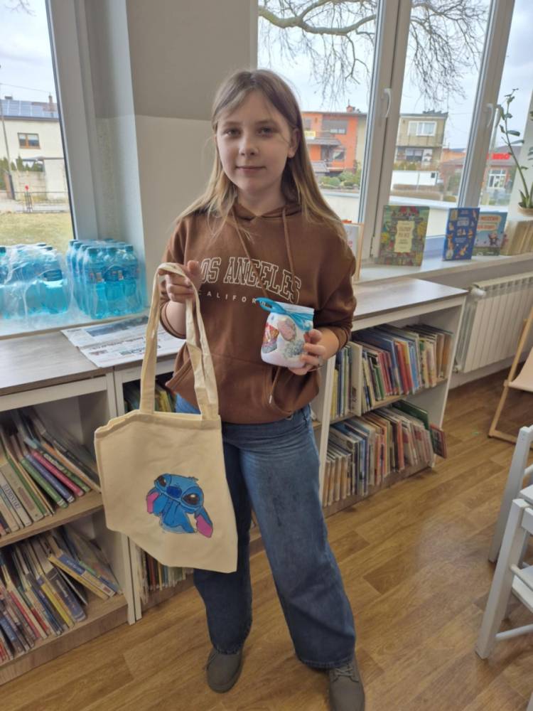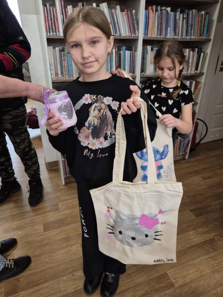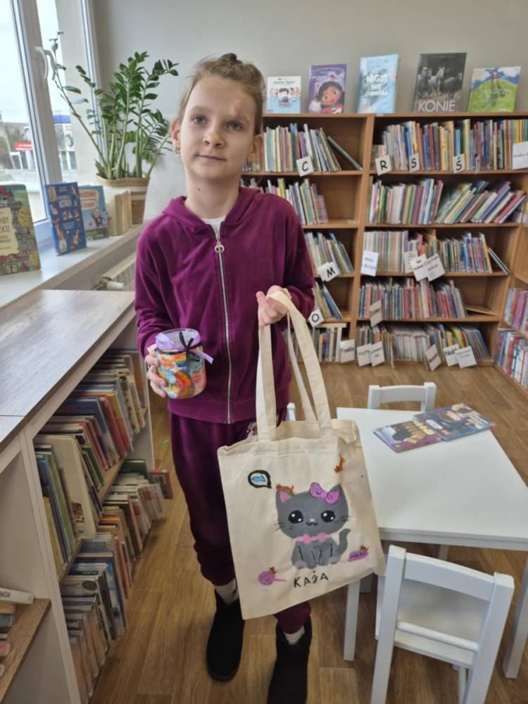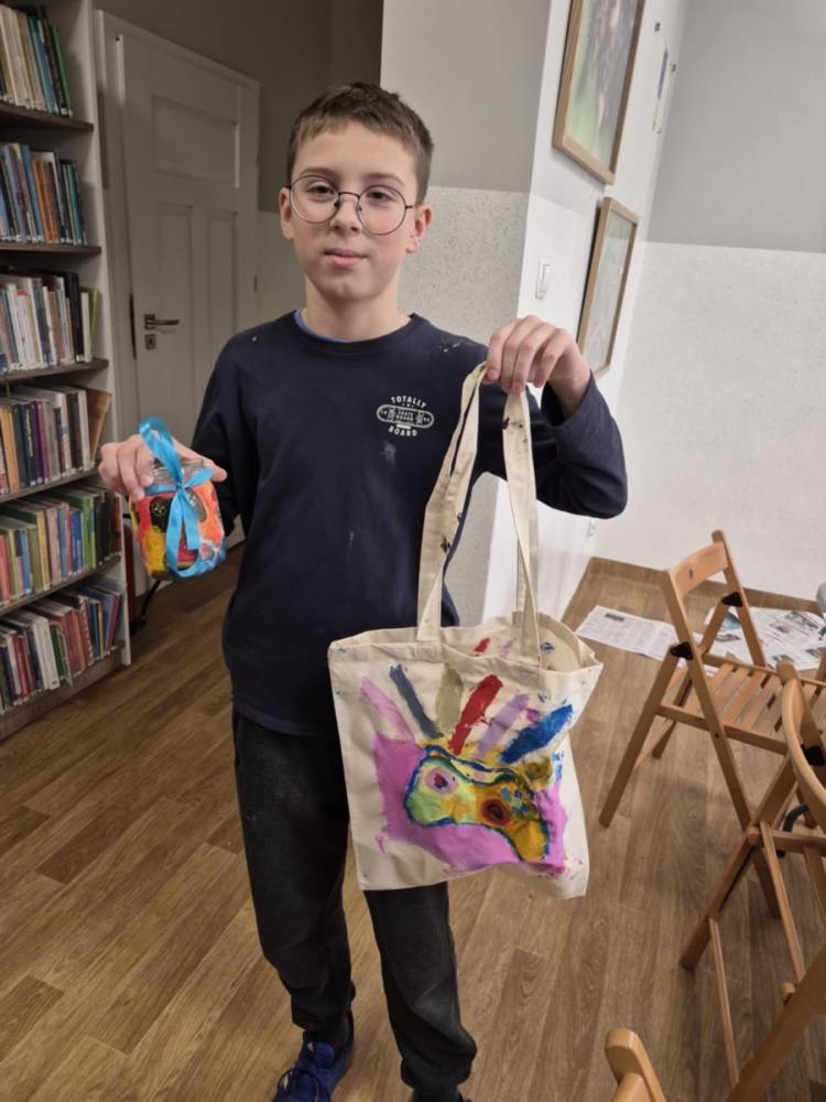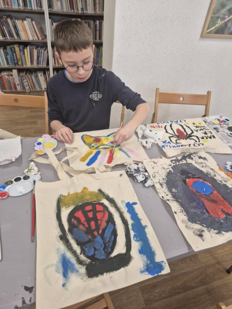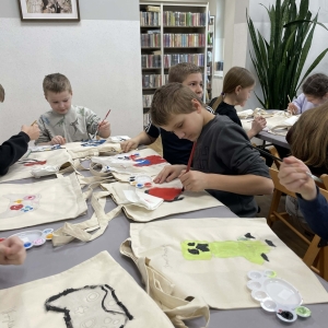 Pierwszym zadaniem naszych małych czytelników było ozdobienie bawełnianych toreb. Dzieci z entuzjazmem chwyciły za pędzle, dając upust swojej wyobraźni. Na torbach szybko zaczęły pojawiać się uśmiechnięte słońca, tęcze oraz fantazyjne zwierzęta. Malowanie bawełnianych toreb było dla dzieci niezwykle angażującą i radosną przygodą. Po zakończeniu pracy mali artyści z dumą prezentowali swoje gotowe ekotorby. Cieszyli się również, że od teraz będą mogli w nich nosić książki. Oczywiście te, które wypożyczą w naszej bibliotece.