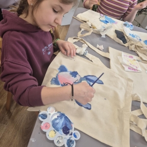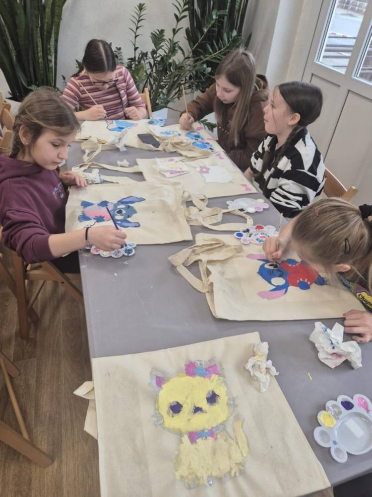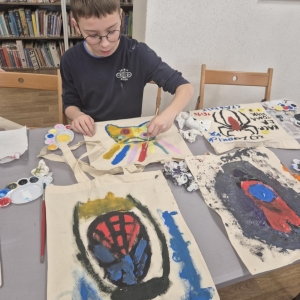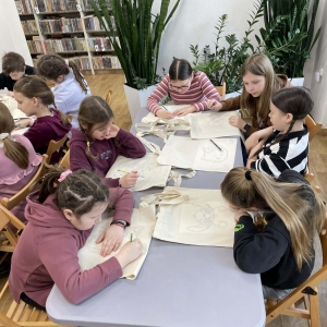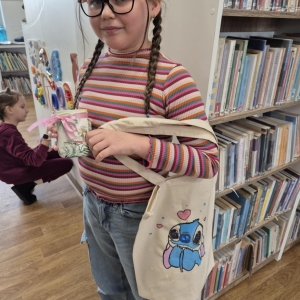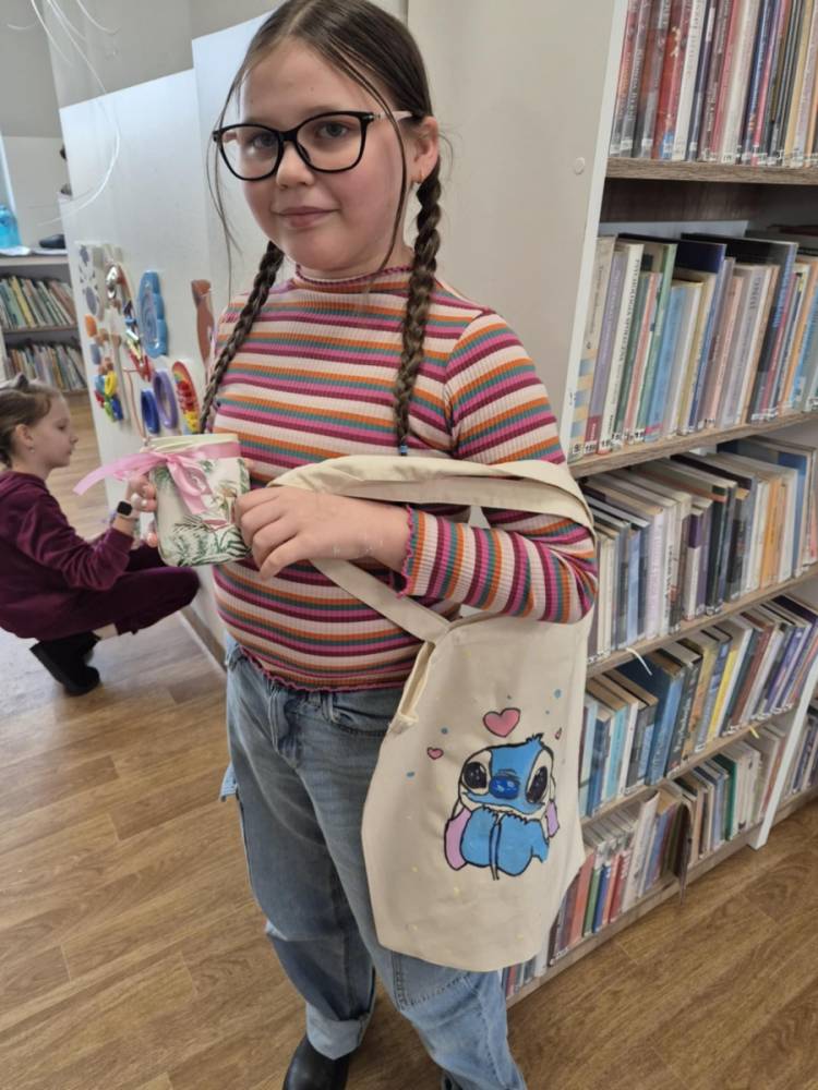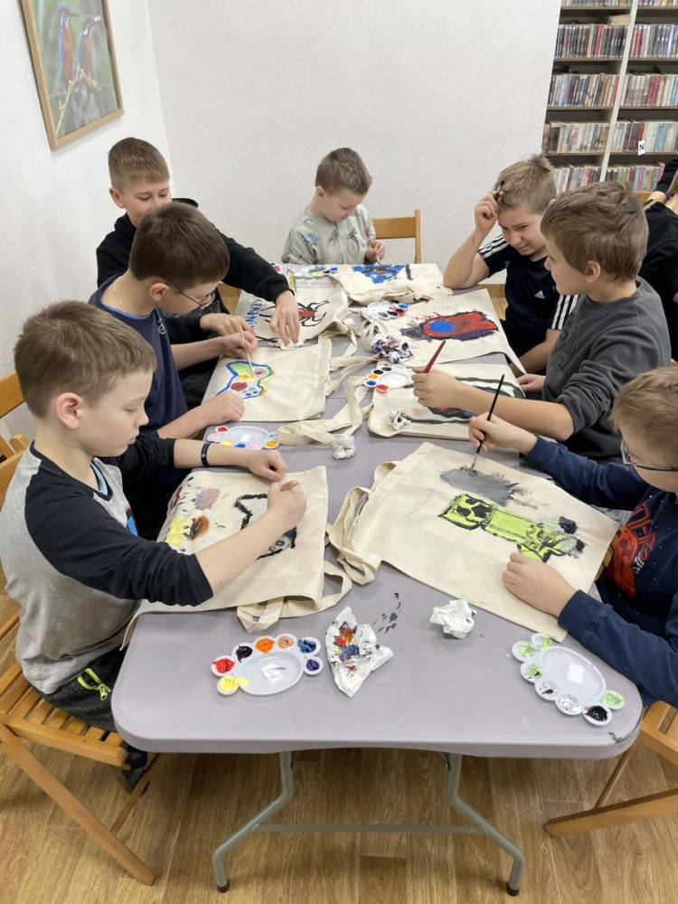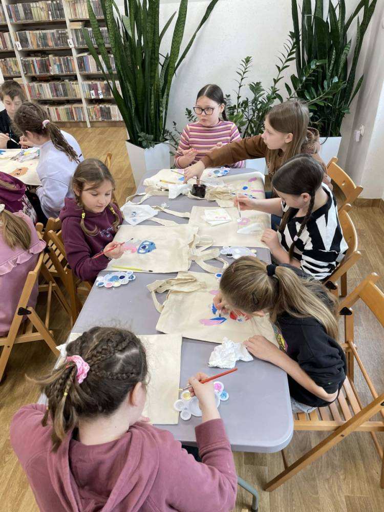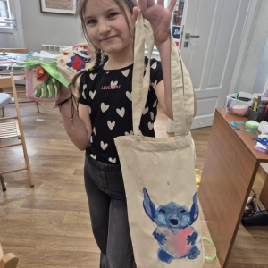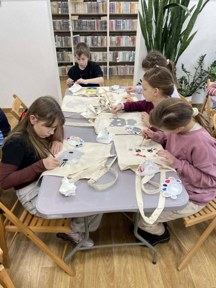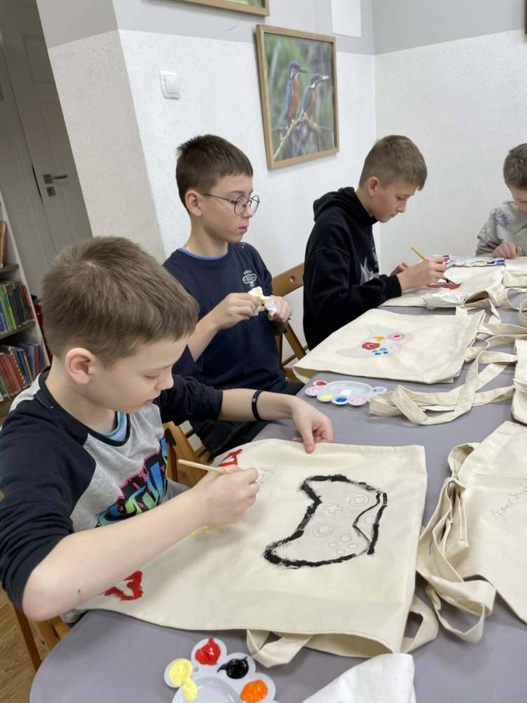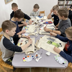 Pierwszym zadaniem naszych małych czytelników było ozdobienie bawełnianych toreb. Dzieci z entuzjazmem chwyciły za pędzle, dając upust swojej wyobraźni. Na torbach szybko zaczęły pojawiać się uśmiechnięte słońca, tęcze oraz fantazyjne zwierzęta. Malowanie bawełnianych toreb było dla dzieci niezwykle angażującą i radosną przygodą. Po zakończeniu pracy mali artyści z dumą prezentowali swoje gotowe ekotorby. Cieszyli się również, że od teraz będą mogli w nich nosić książki. Oczywiście te, które wypożyczą w naszej bibliotece.