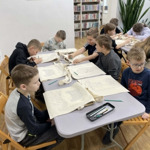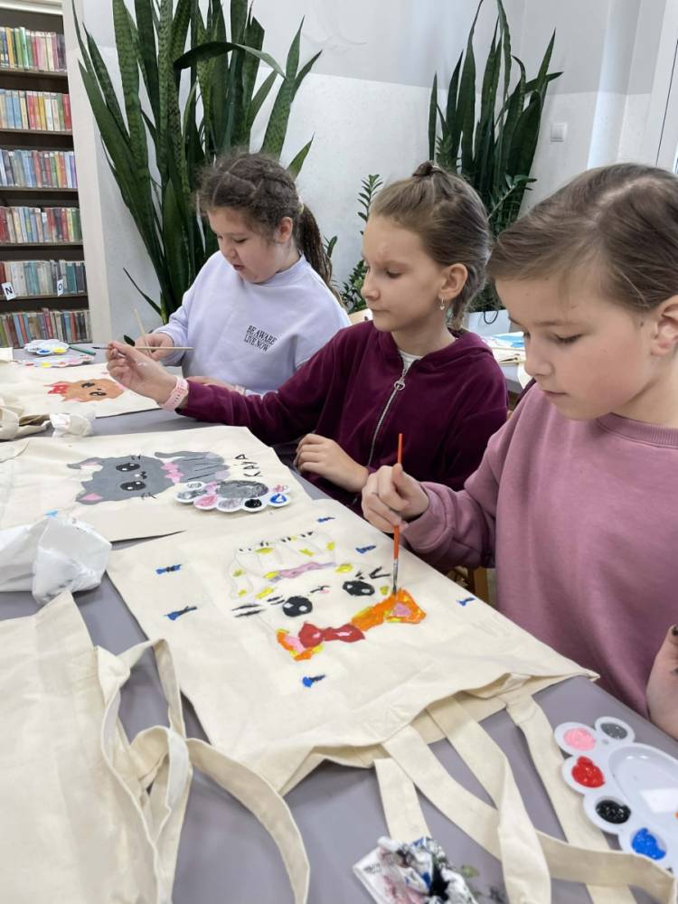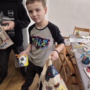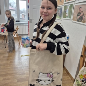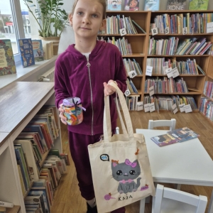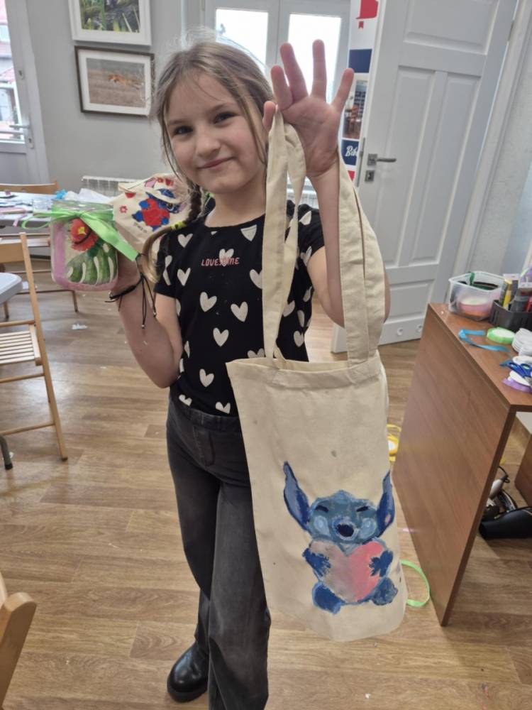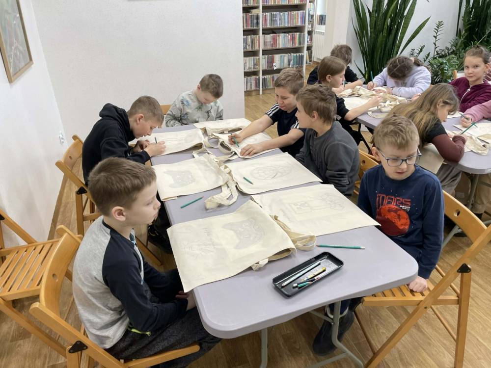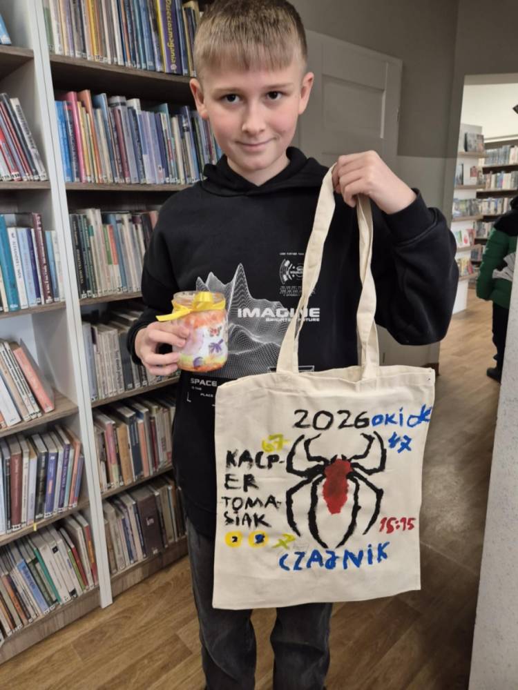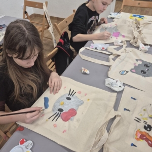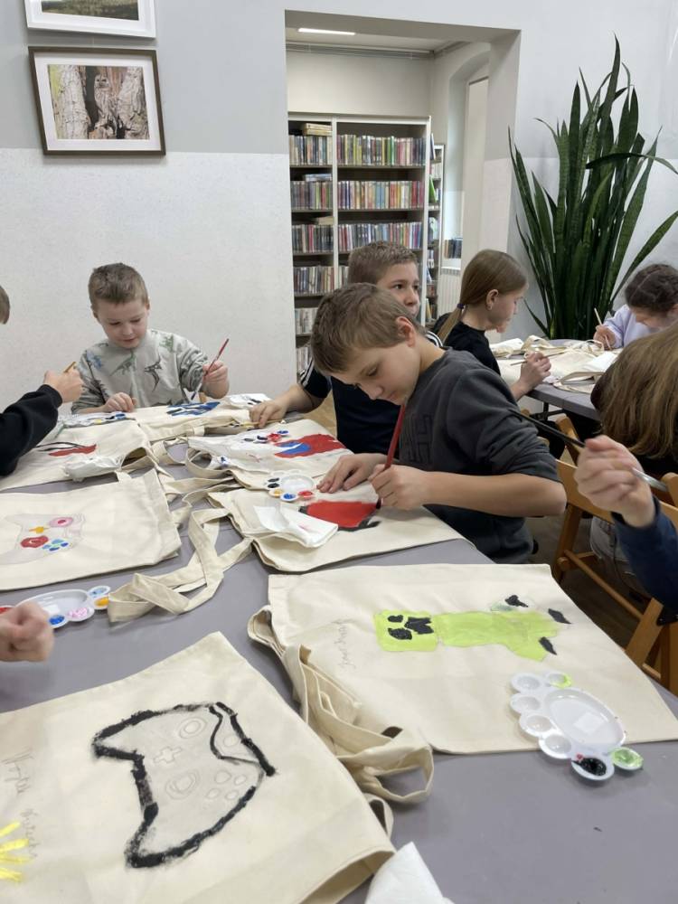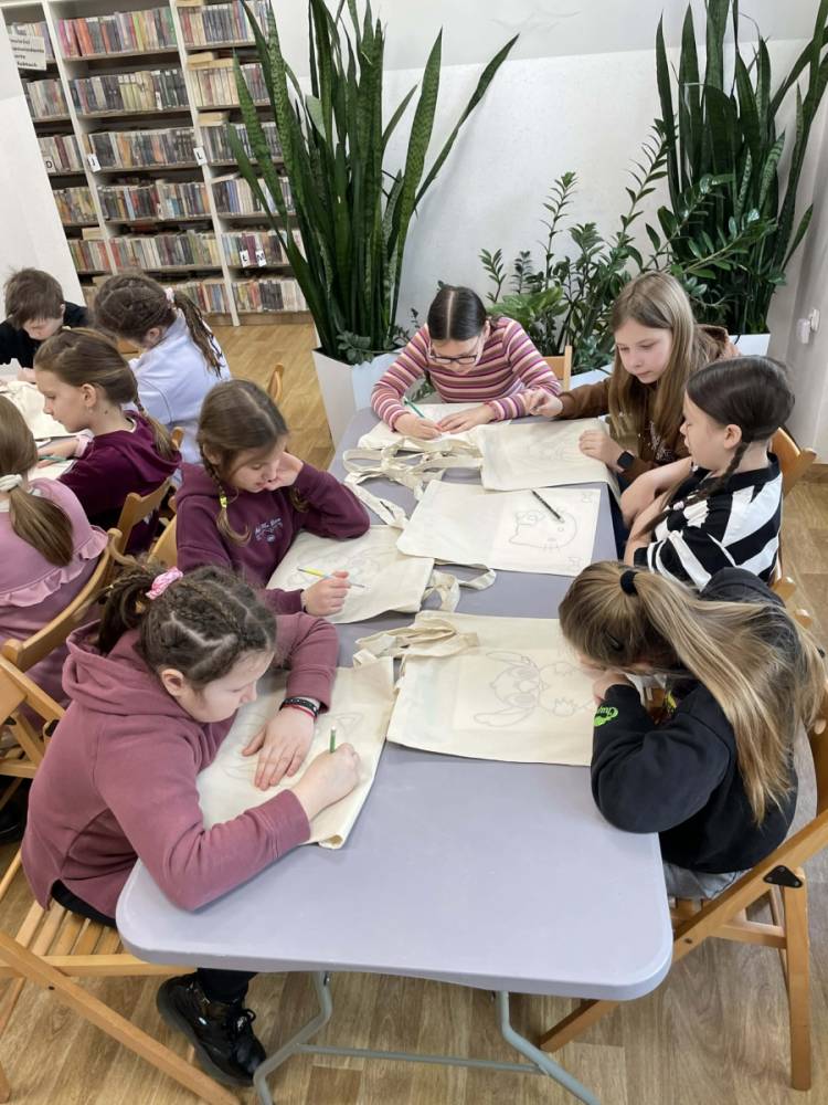 Pierwszym zadaniem naszych małych czytelników było ozdobienie bawełnianych toreb. Dzieci z entuzjazmem chwyciły za pędzle, dając upust swojej wyobraźni. Na torbach szybko zaczęły pojawiać się uśmiechnięte słońca, tęcze oraz fantazyjne zwierzęta. Malowanie bawełnianych toreb było dla dzieci niezwykle angażującą i radosną przygodą. Po zakończeniu pracy mali artyści z dumą prezentowali swoje gotowe ekotorby. Cieszyli się również, że od teraz będą mogli w nich nosić książki. Oczywiście te, które wypożyczą w naszej bibliotece.
