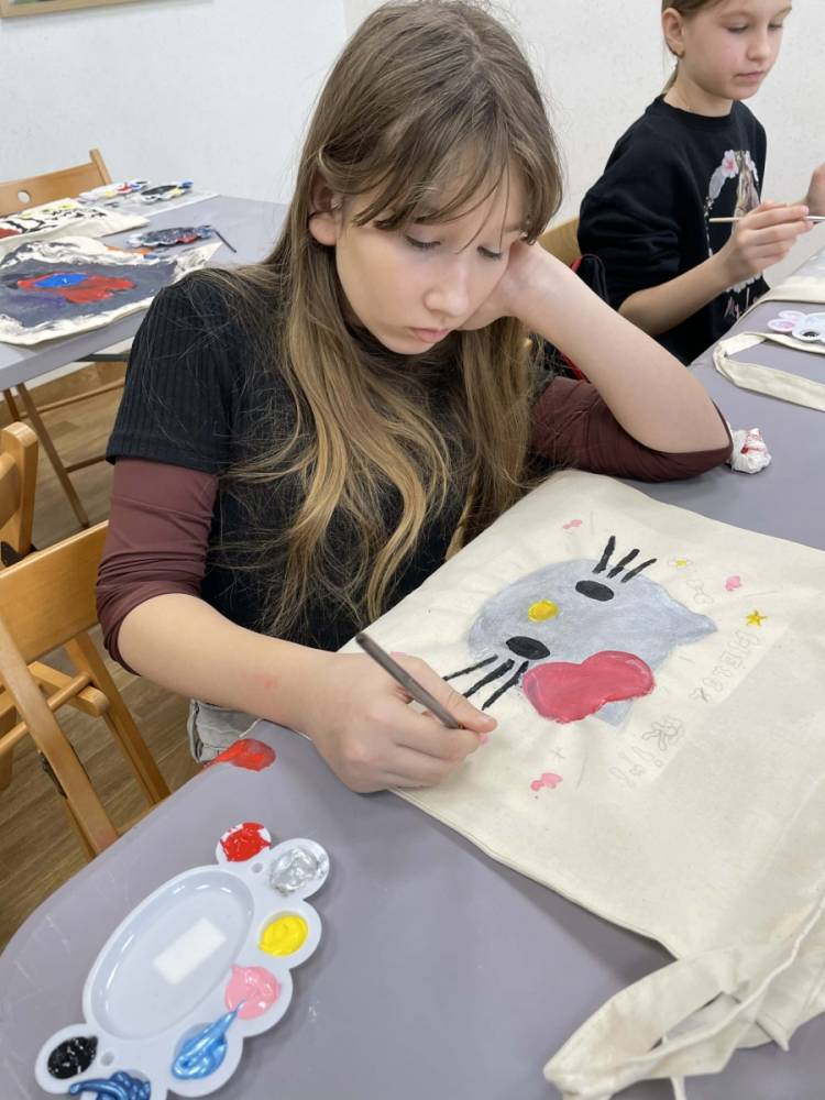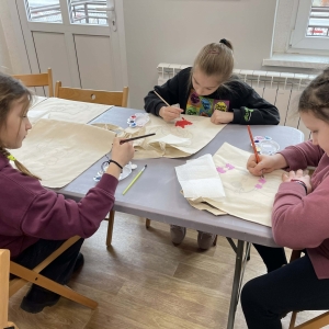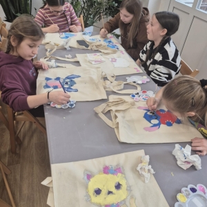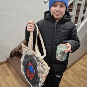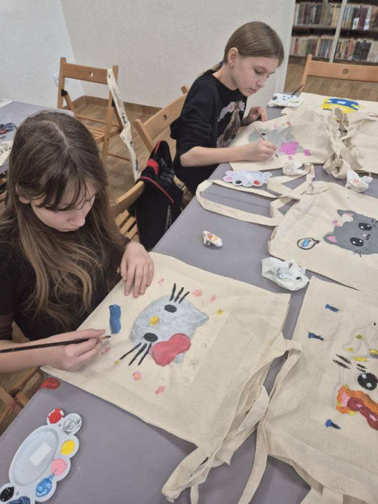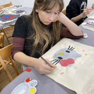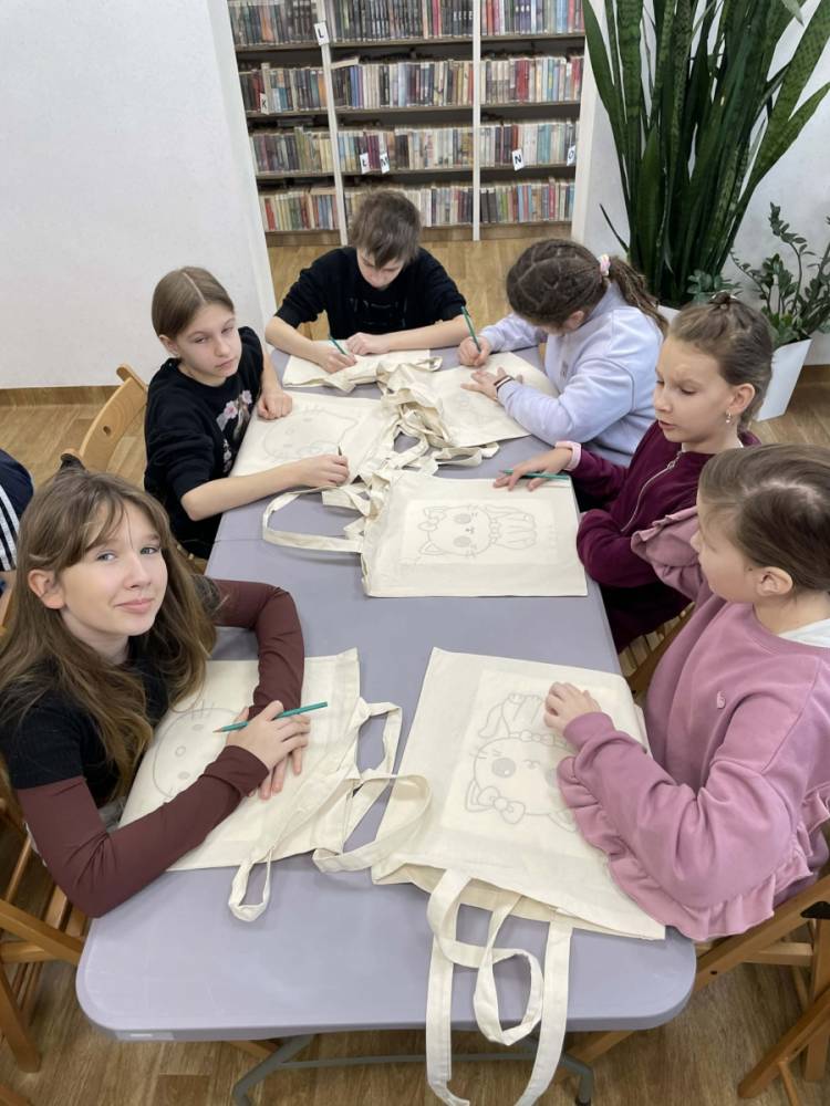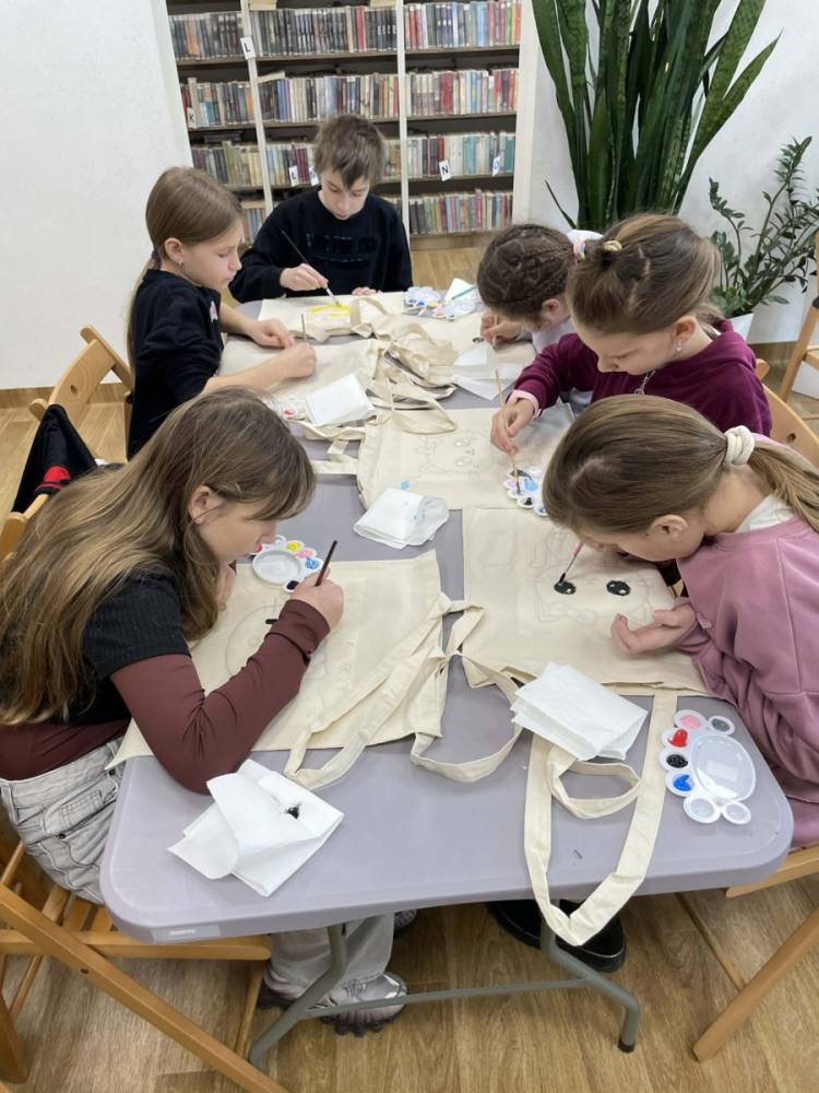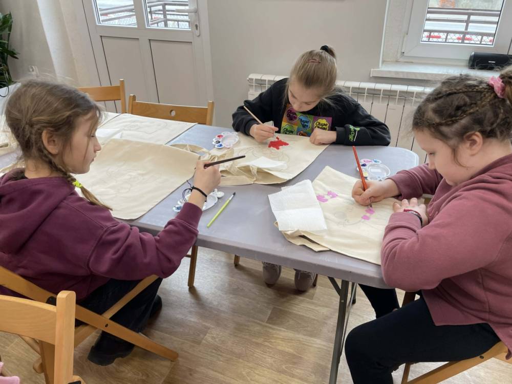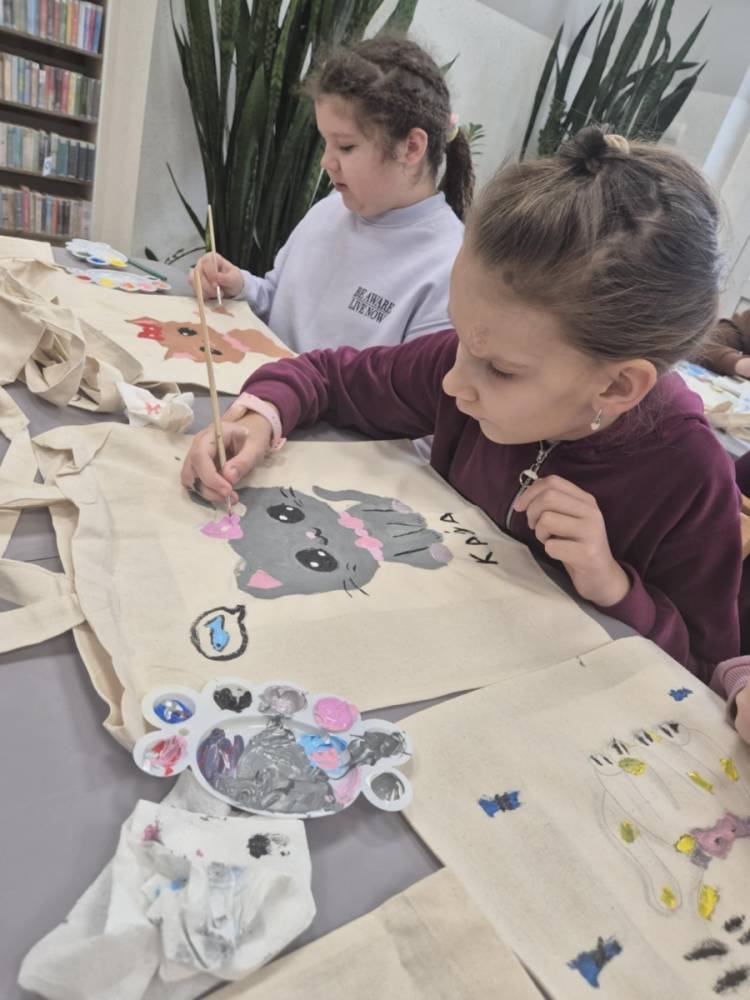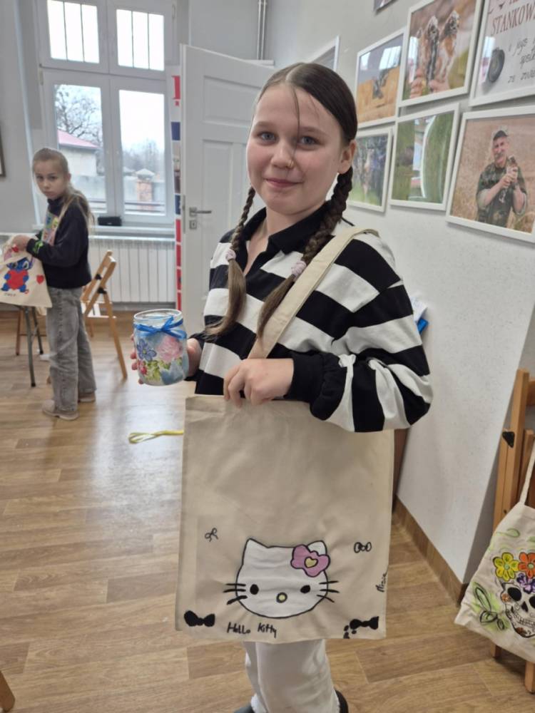 Pierwszym zadaniem naszych małych czytelników było ozdobienie bawełnianych toreb. Dzieci z entuzjazmem chwyciły za pędzle, dając upust swojej wyobraźni. Na torbach szybko zaczęły pojawiać się uśmiechnięte słońca, tęcze oraz fantazyjne zwierzęta. Malowanie bawełnianych toreb było dla dzieci niezwykle angażującą i radosną przygodą. Po zakończeniu pracy mali artyści z dumą prezentowali swoje gotowe ekotorby. Cieszyli się również, że od teraz będą mogli w nich nosić książki. Oczywiście te, które wypożyczą w naszej bibliotece.