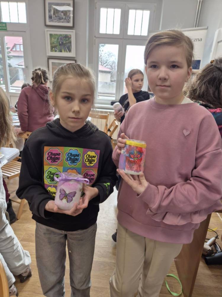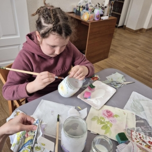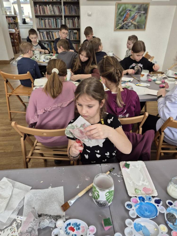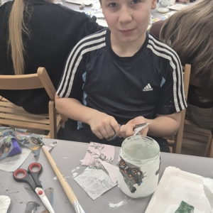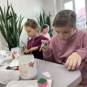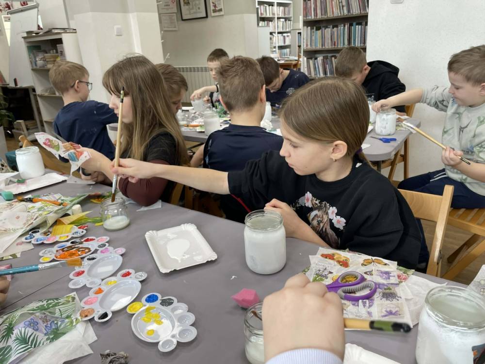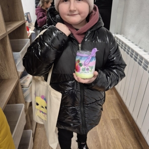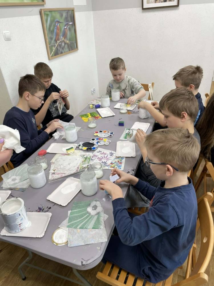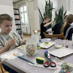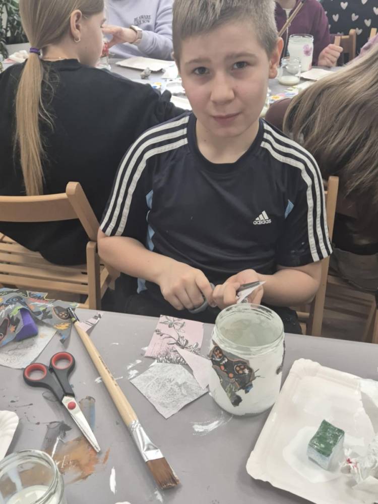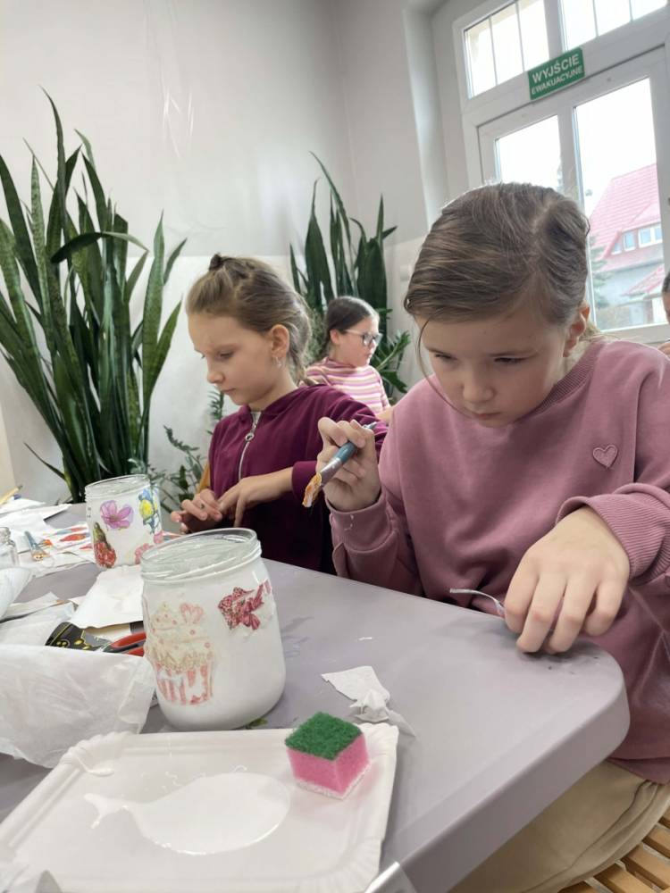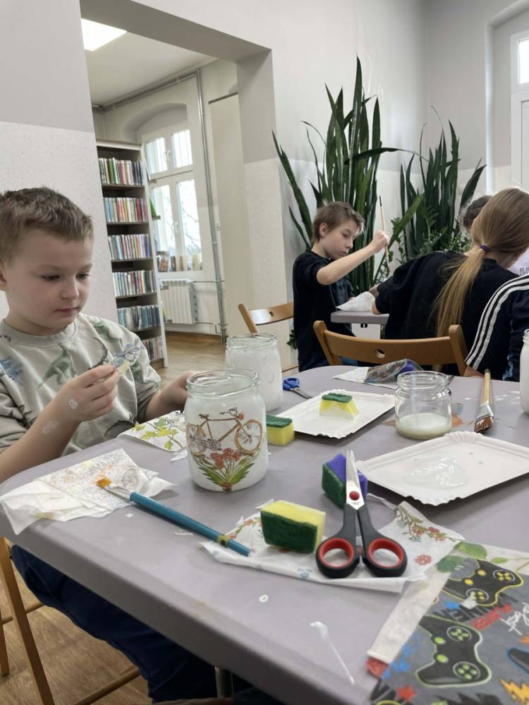 Po krótkiej przerwie na posiłek, dzieci wzięły na warsztat słoiki i farby. Zaczęli ozdabiać szklane pojemniki metodą decoupage. Była to dla nich niesamowita frajda, która łączyła zabawę w „wyklejankę” z nauką recyklingu. Było to również zajęcie, które uczyło ich cierpliwości i uważności. Praca z cienką serwetką wymaga skupienia, a planowanie kompozycji rozwija wyobraźnię przestrzenną. Gotowe (ozdobione) słoiki stały się lampionami, przybornikami na biurko, a nawet prezentami dla najbliższych.