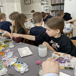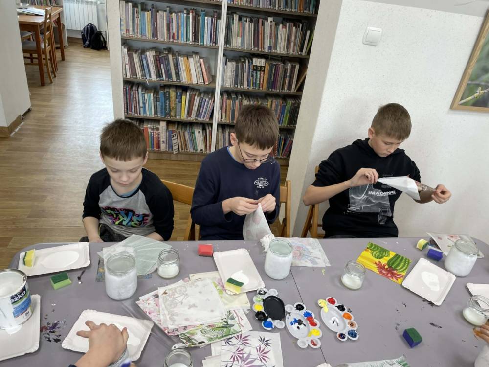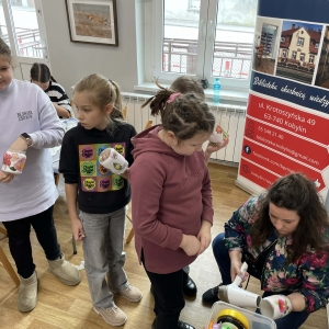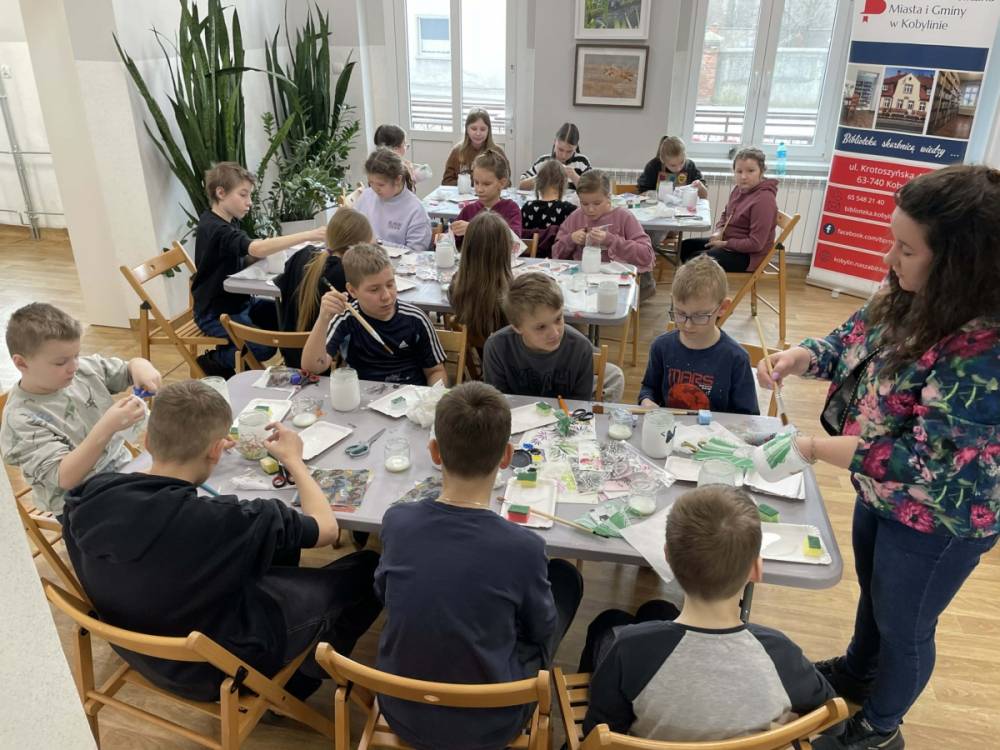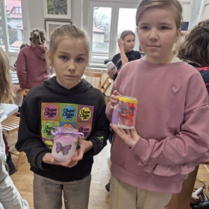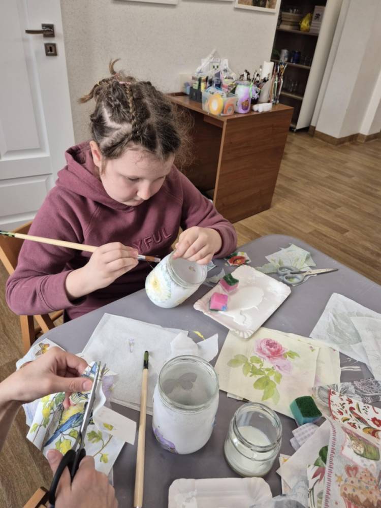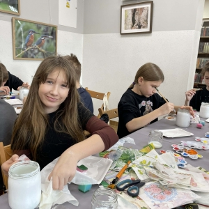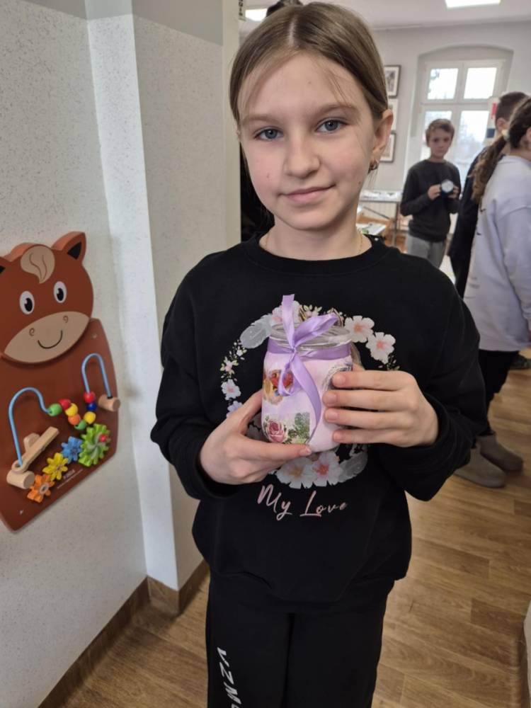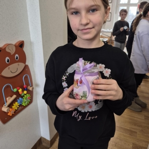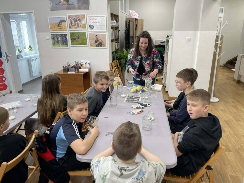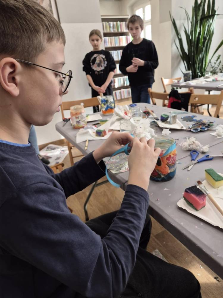 Po krótkiej przerwie na posiłek, dzieci wzięły na warsztat słoiki i farby. Zaczęli ozdabiać szklane pojemniki metodą decoupage. Była to dla nich niesamowita frajda, która łączyła zabawę w „wyklejankę” z nauką recyklingu. Było to również zajęcie, które uczyło ich cierpliwości i uważności. Praca z cienką serwetką wymaga skupienia, a planowanie kompozycji rozwija wyobraźnię przestrzenną. Gotowe (ozdobione) słoiki stały się lampionami, przybornikami na biurko, a nawet prezentami dla najbliższych.