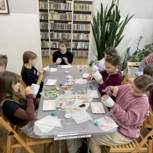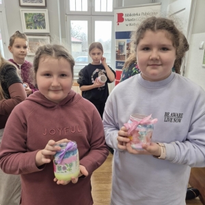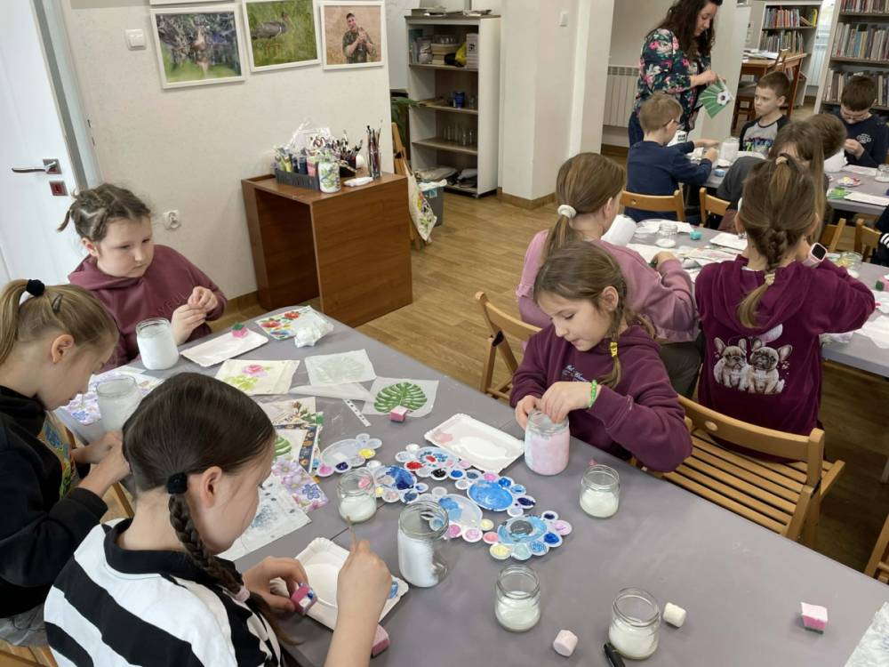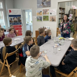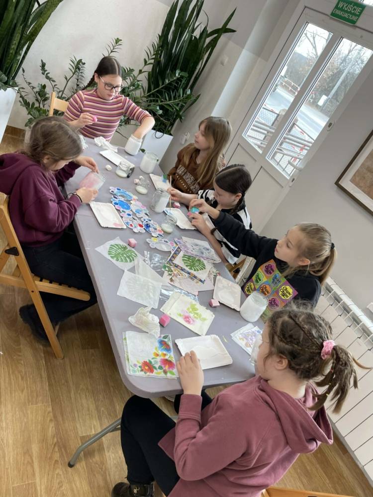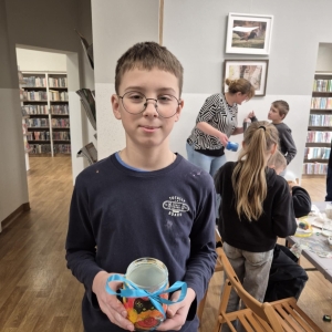 Poniedziałkowe warsztaty z farbami były nie tylko lekcją plastyki, ale też świetną okazją do integracji. Dzieci nawzajem inspirowały się swoimi pomysłami i pomagały sobie. Każde spotkanie w bibliotece to również wspaniała okazja, aby wypożyczyć książkę. Tak było i tym razem. Uczestnicy Ferii z Biblioteką wychodzili z książnicy, z pięknymi pracami plastycznymi własnego autorstwa oraz z książką pod pachą.