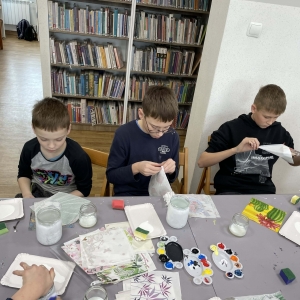 Galeria przedstawia grupę dzieci- uczestników Ferii z Biblioteką. Dzieci malują farbami torby bawełniane. W drugiej części zajęci malują obklejają słoiki. Dekorowali słoiki metodą decoupage.
