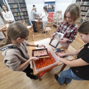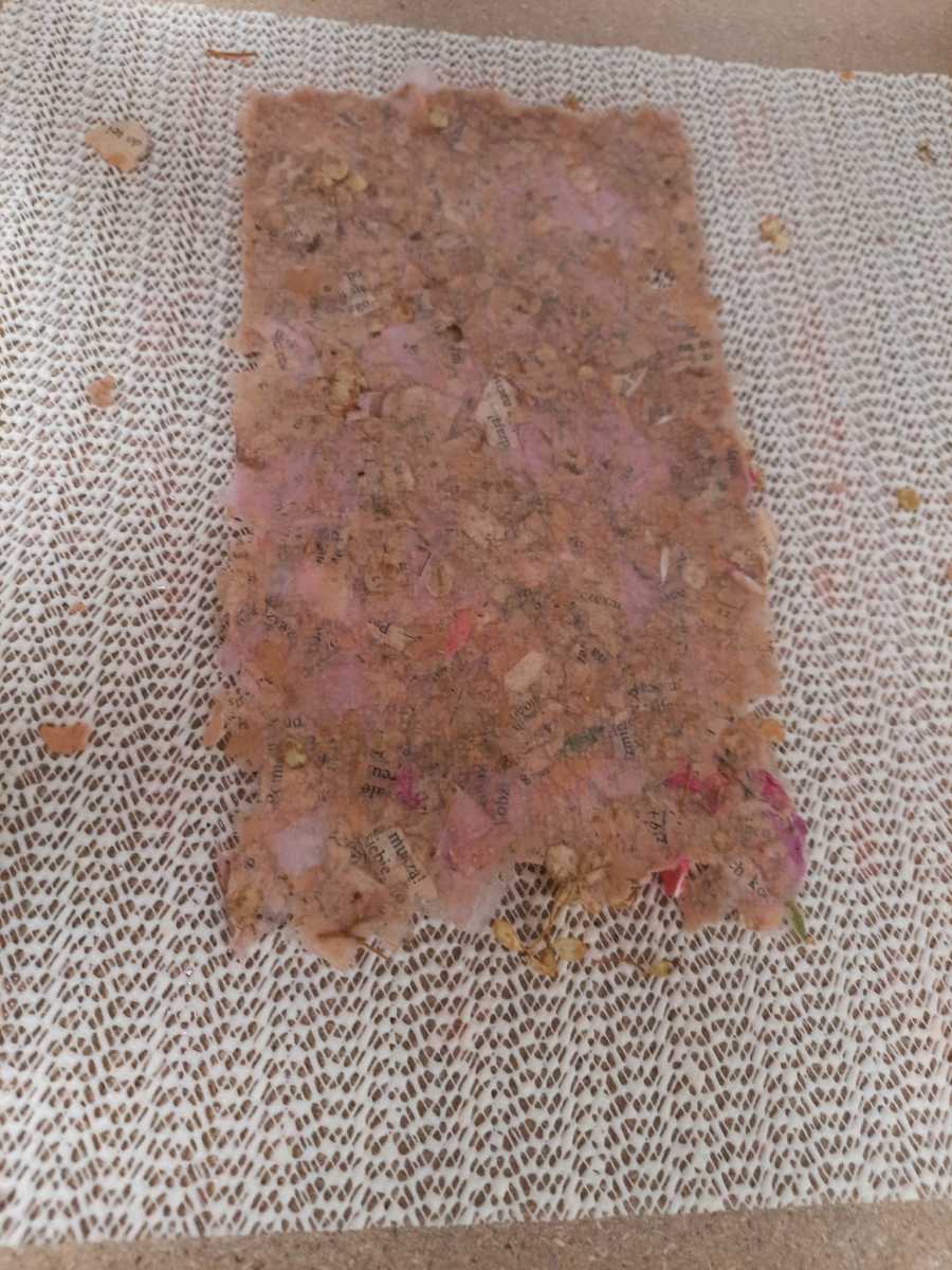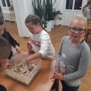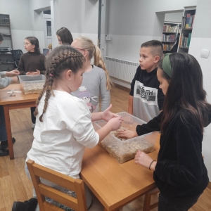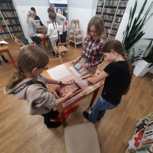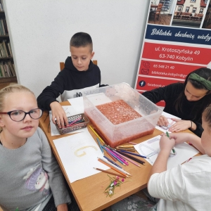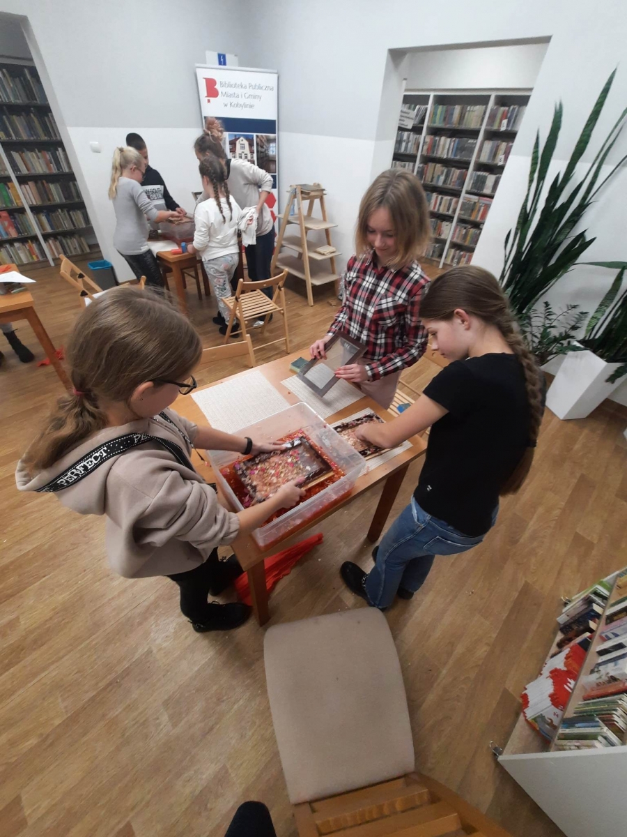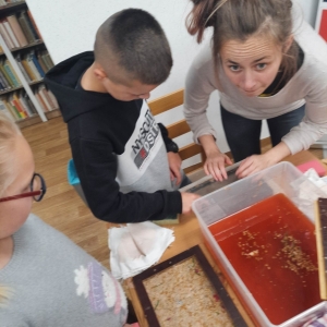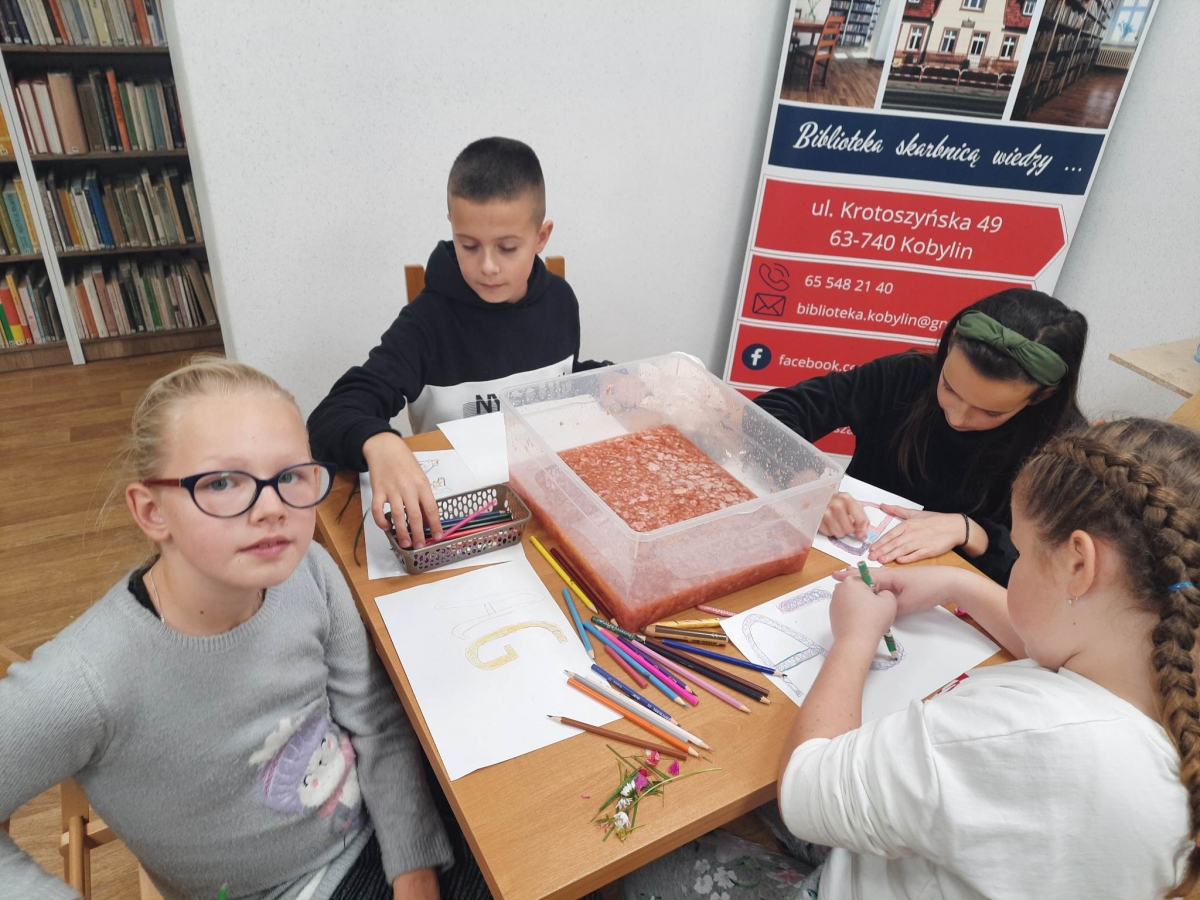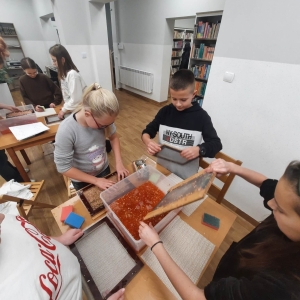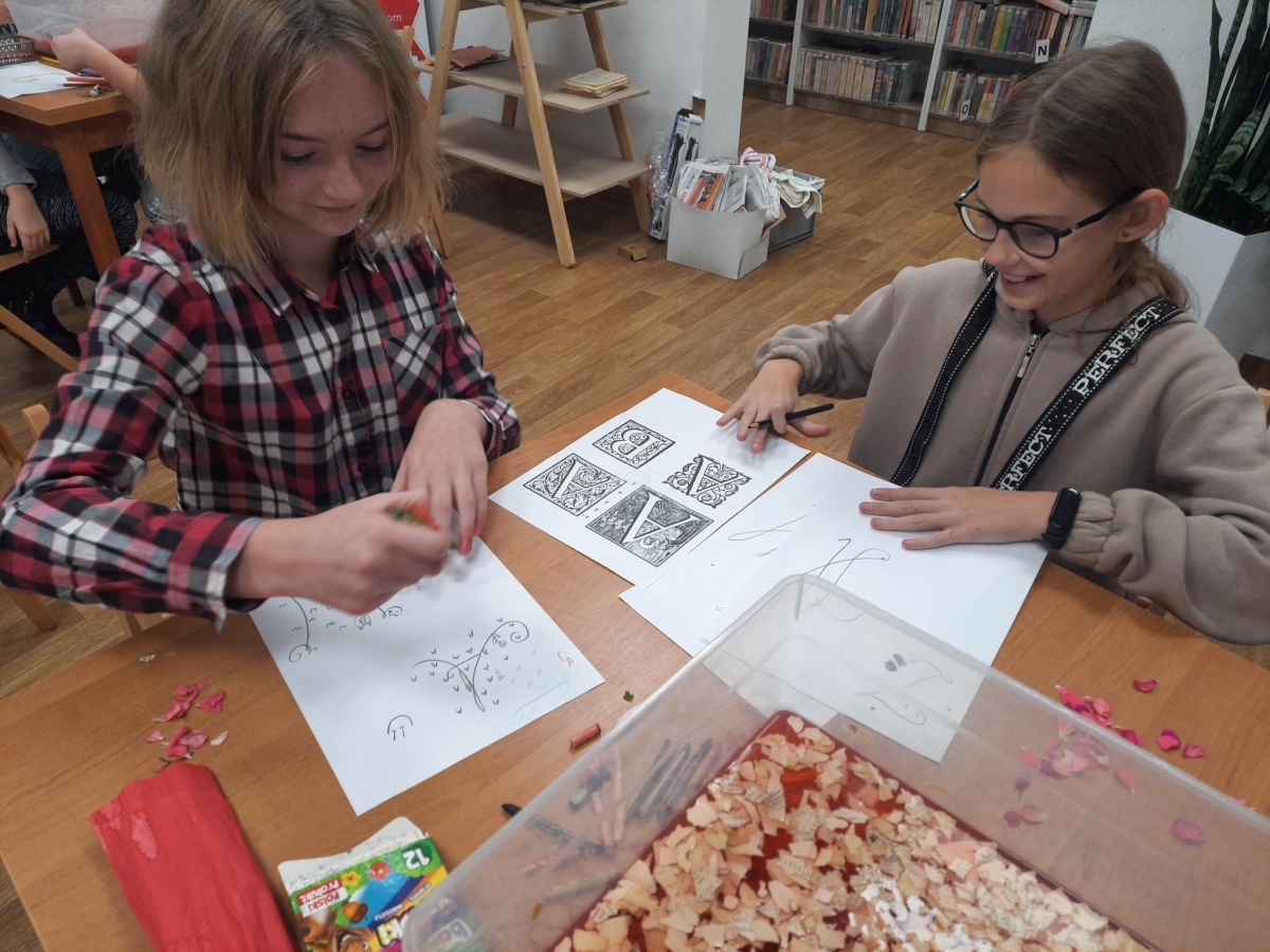 Stare gazety, zniszczone książki znalazły nowe zastosowanie. Podarte na maluteńkie kawałki zostały zamoczone w pojemnikach z wodą, a następnie zmiksowane. Były także barwione i dekorowane. Kolejnym etapem było czerpanie, czyli nabieranie masy papierowej na sita i odsączanie. Efektem finalnym był kolorowy ekologiczny papier. Podczas warsztatów z czerpania papieru wspomnieliśmy także o niezwykłej historii inicjału, czyli pierwszej literze, która rozpoczyna utwór (rozdział, akapit). Historia inicjału sięga średniowiecza. Każdy z uczestników mógł stworzyć własny inicjał. Wszyscy mogą być dumni ze swoich prac (czerpanych papierów oraz inicjałów) ! Serdecznie dziękujemy młodym ekologom oraz prowadzącej !!!