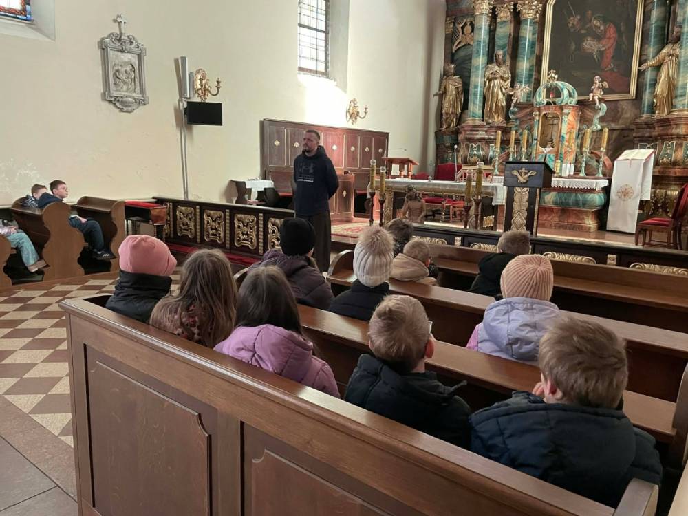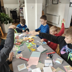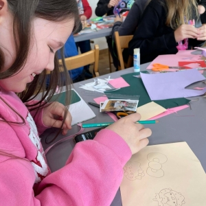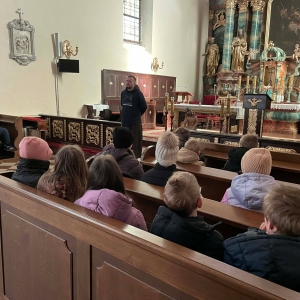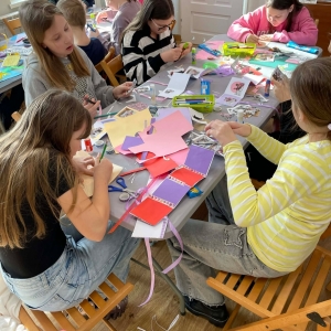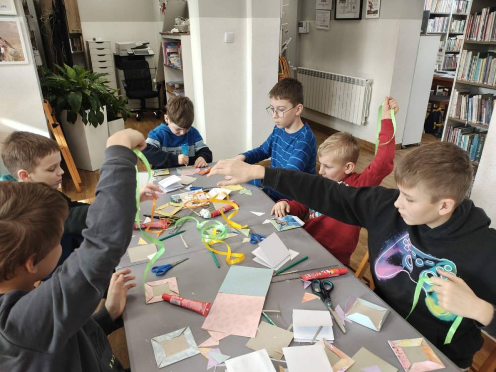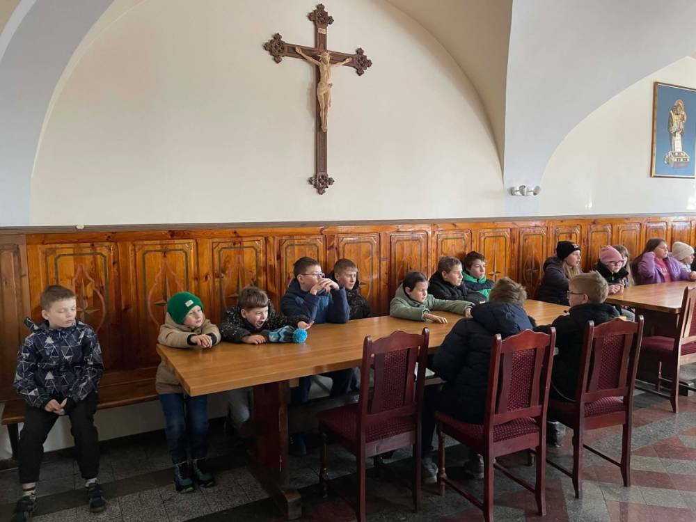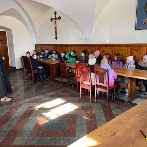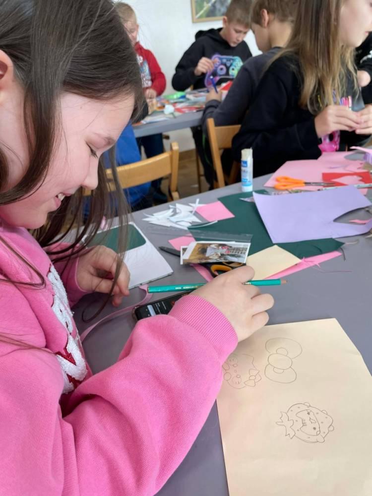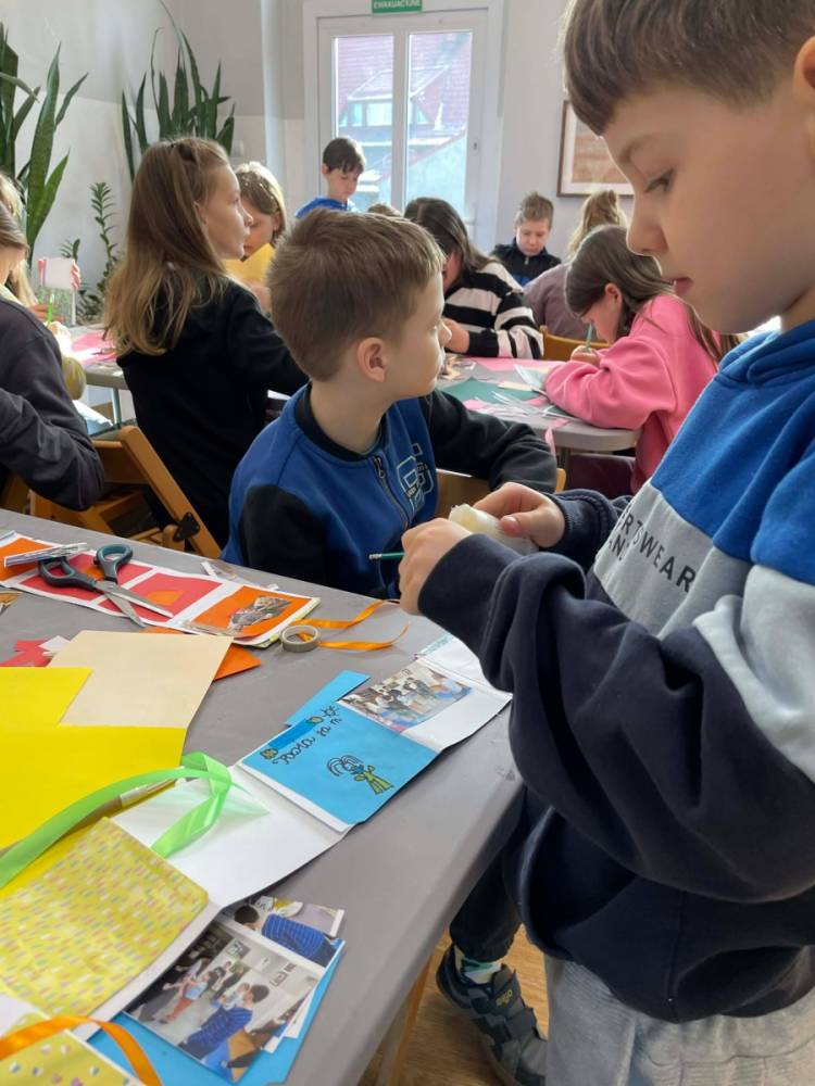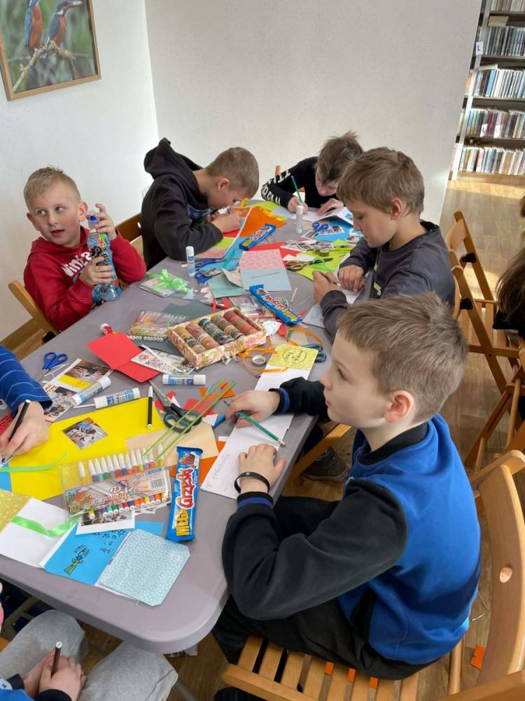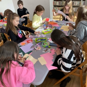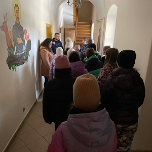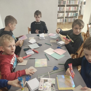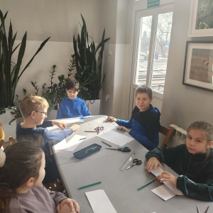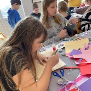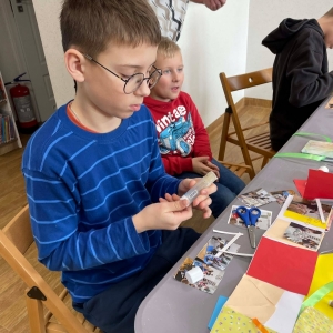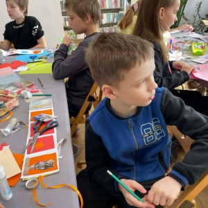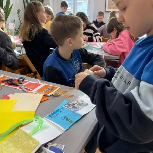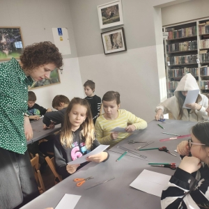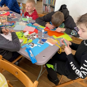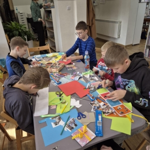 Galeria przedstawię grupę dzieci, które tworzą pamiątkowe książeczki z zajęć w bibliotece metodą leporello. W drugiej części spotkania dzieci zwiedzały Klasztor Ojców Franciszkanów w Kobylinie, który znajduje się naprzeciwko biblioteki.