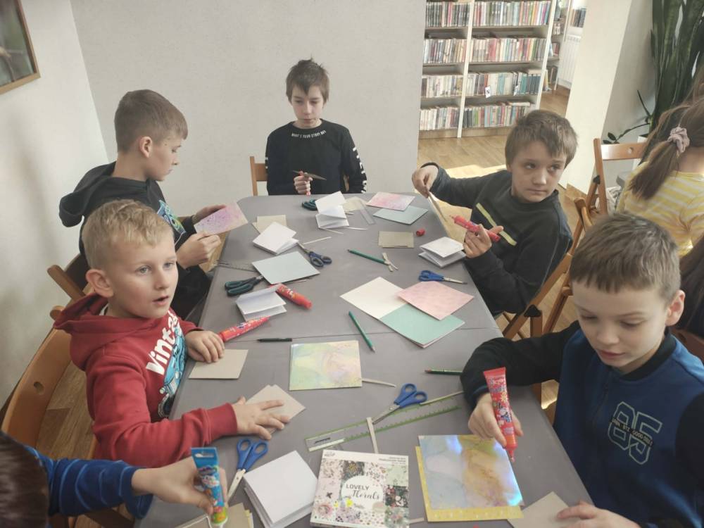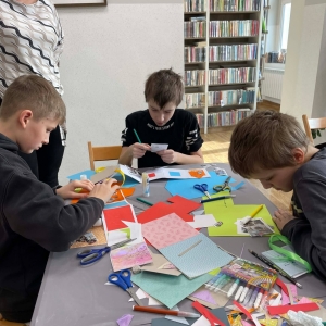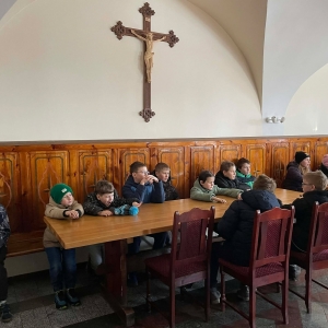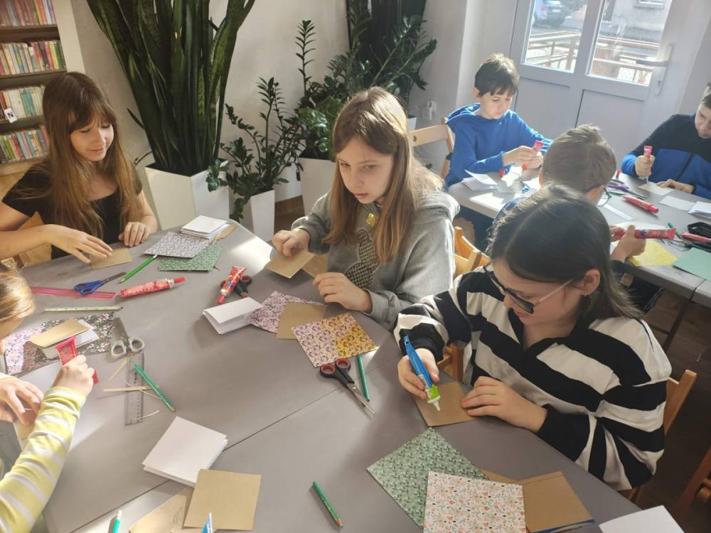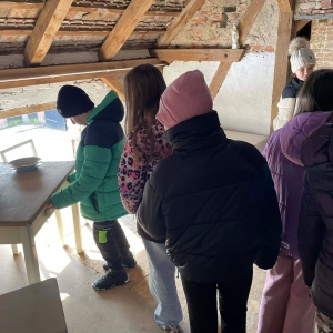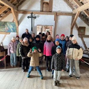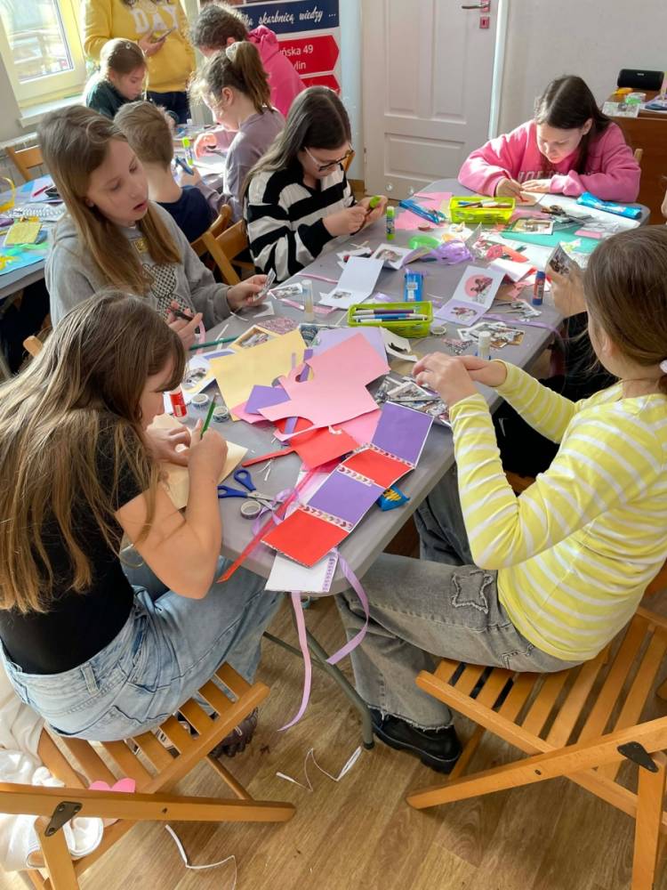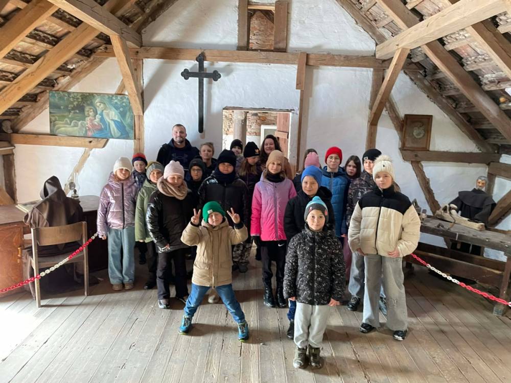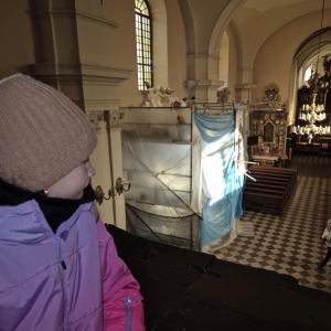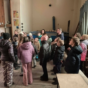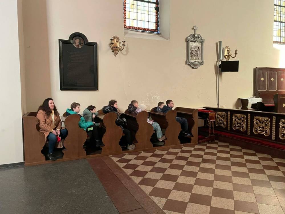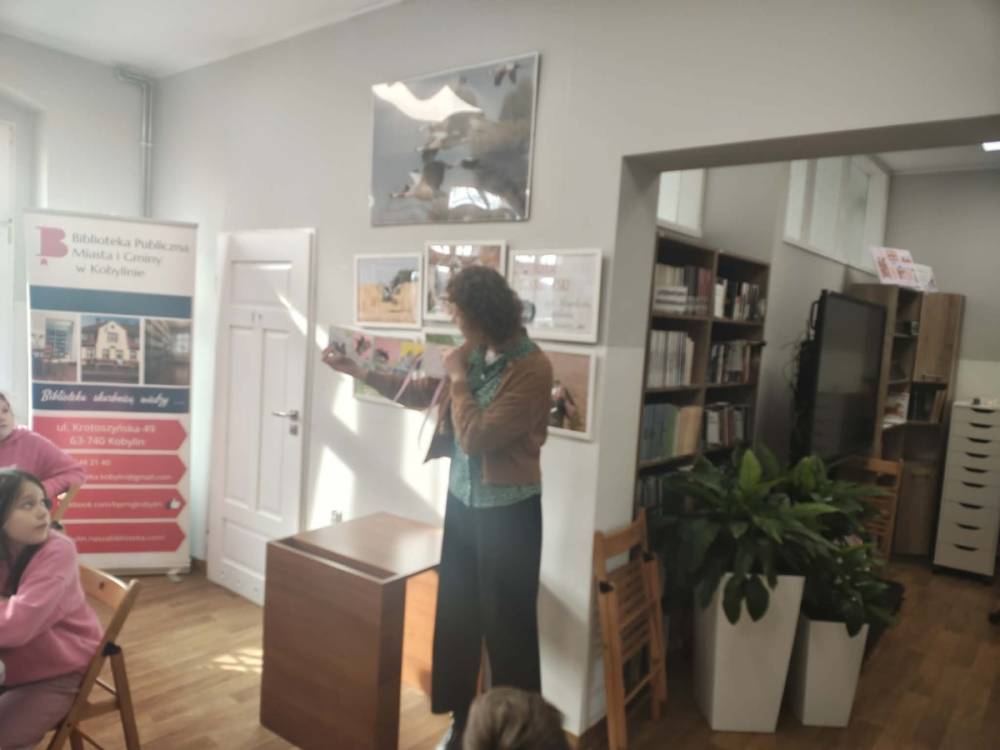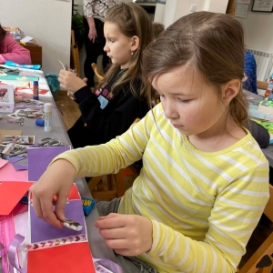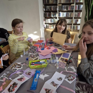 Galeria przedstawię grupę dzieci, które tworzą pamiątkowe książeczki z zajęć w bibliotece metodą leporello. W drugiej części spotkania dzieci zwiedzały Klasztor Ojców Franciszkanów w Kobylinie, który znajduje się naprzeciwko biblioteki.