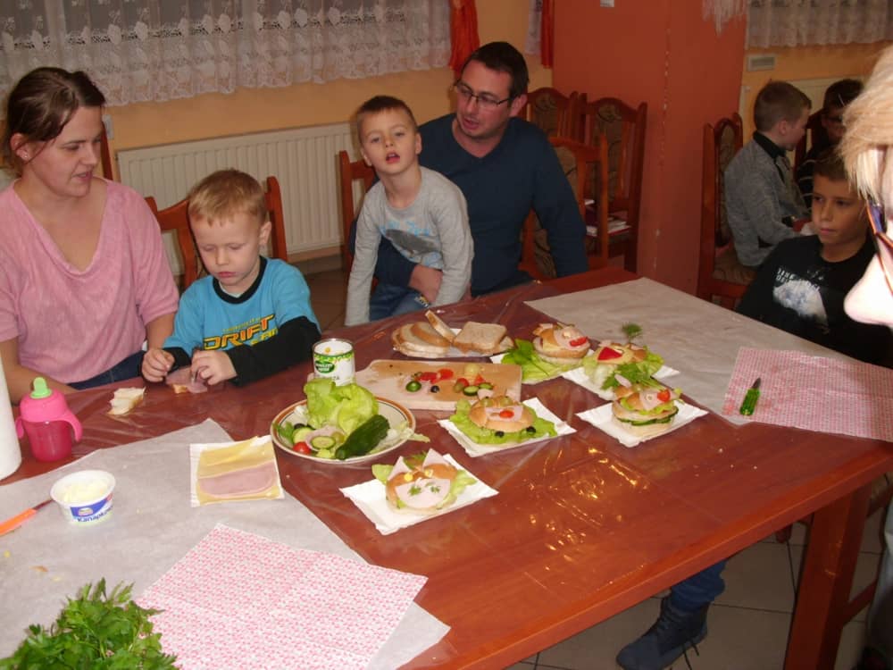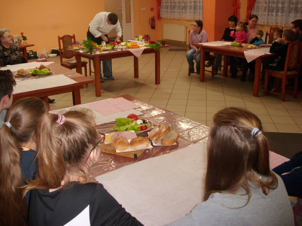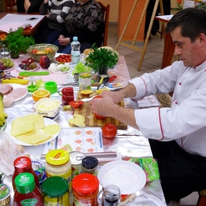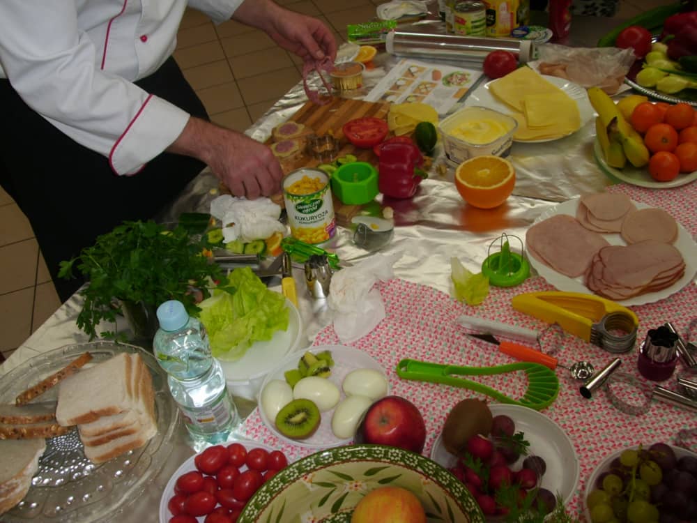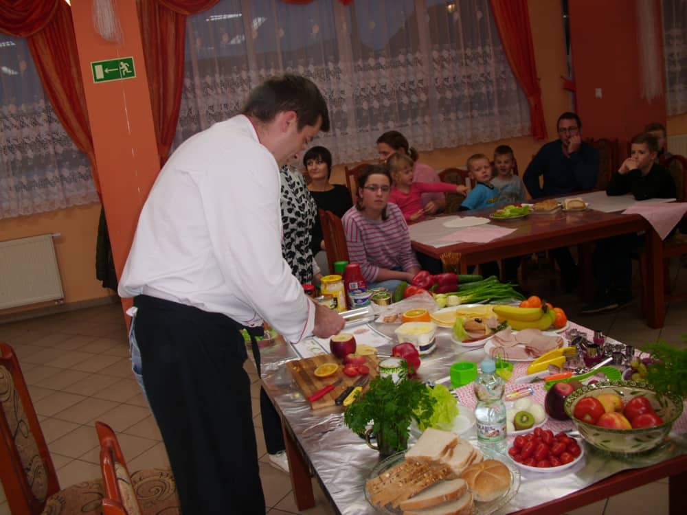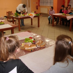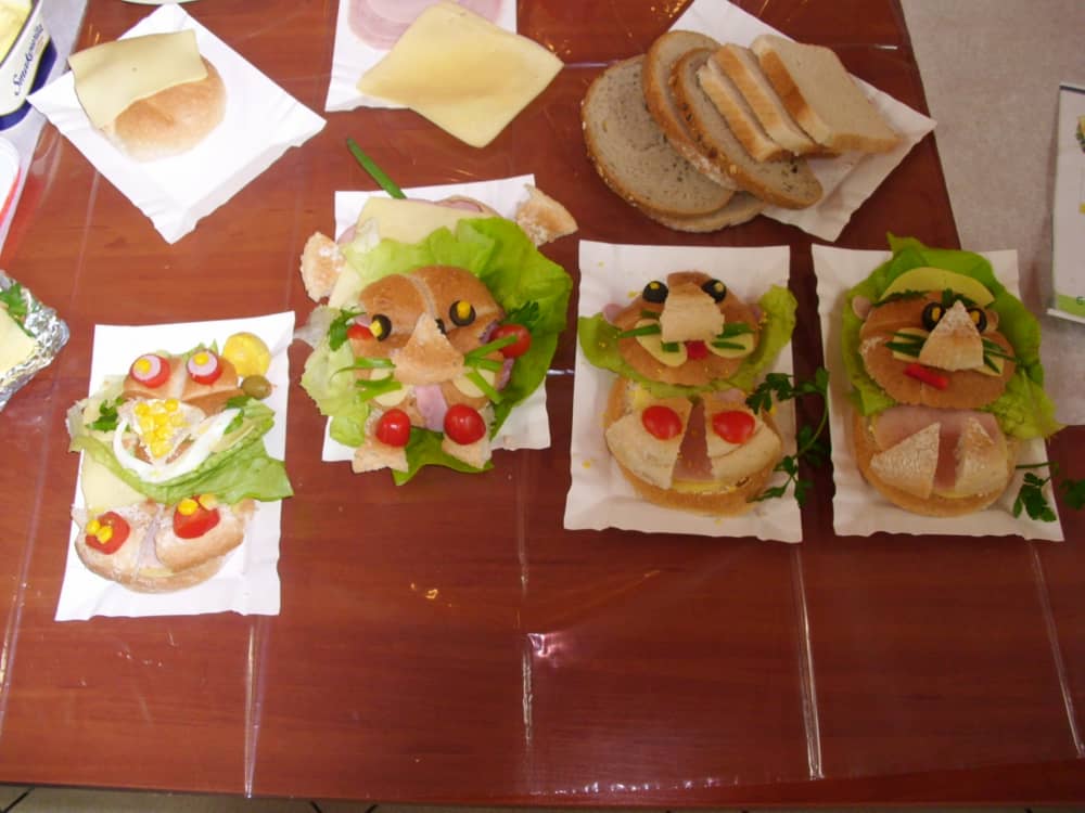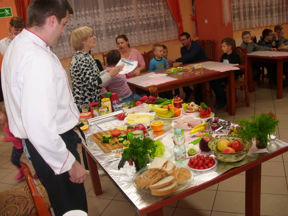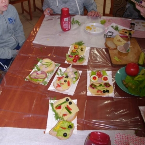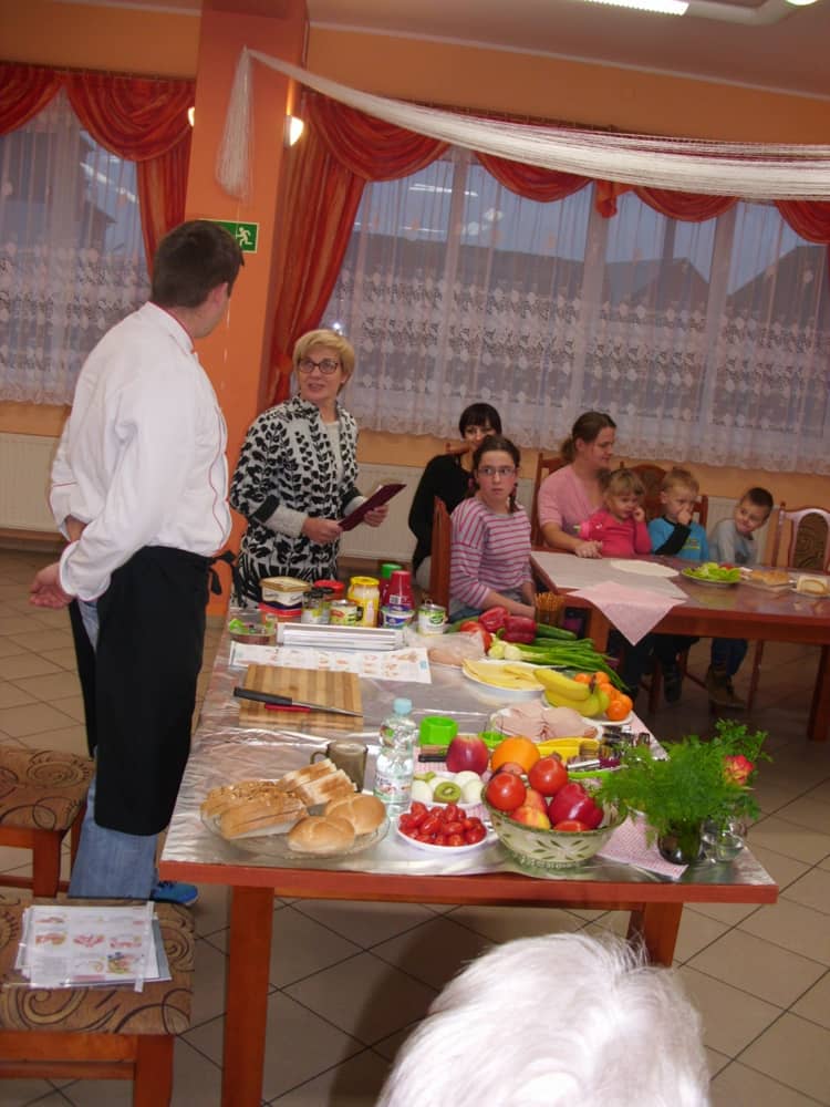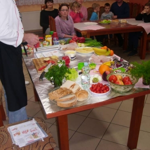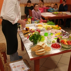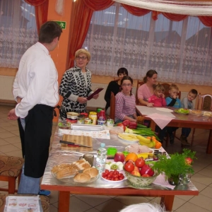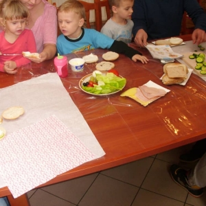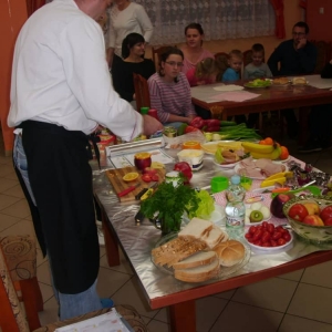 Honorowym gościem, a jednocześnie prowadzącym był zawodowy kucharz Tomasz Brzykcy. Opowiedział uczestnikom o zdrowych produktach, zademonstrował przyrządy służące do ozdabiania potraw, z których korzysta w kuchni. Z warzyw i owoców wyczarował telefon, imbryk, serwis do herbaty. Z pieczywa powstała krowa oraz lew. Po interesującym pokazie, dzieci pod okiem rodziców, babć i opiekunów, (przy dużej dawce śmiechu) same tworzyły kanapkowe cuda. Na koniec nastąpiła demonstracja dzieł i długo wyczekiwana konsumpcja.