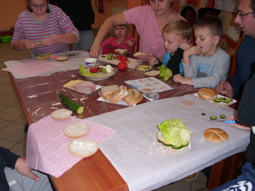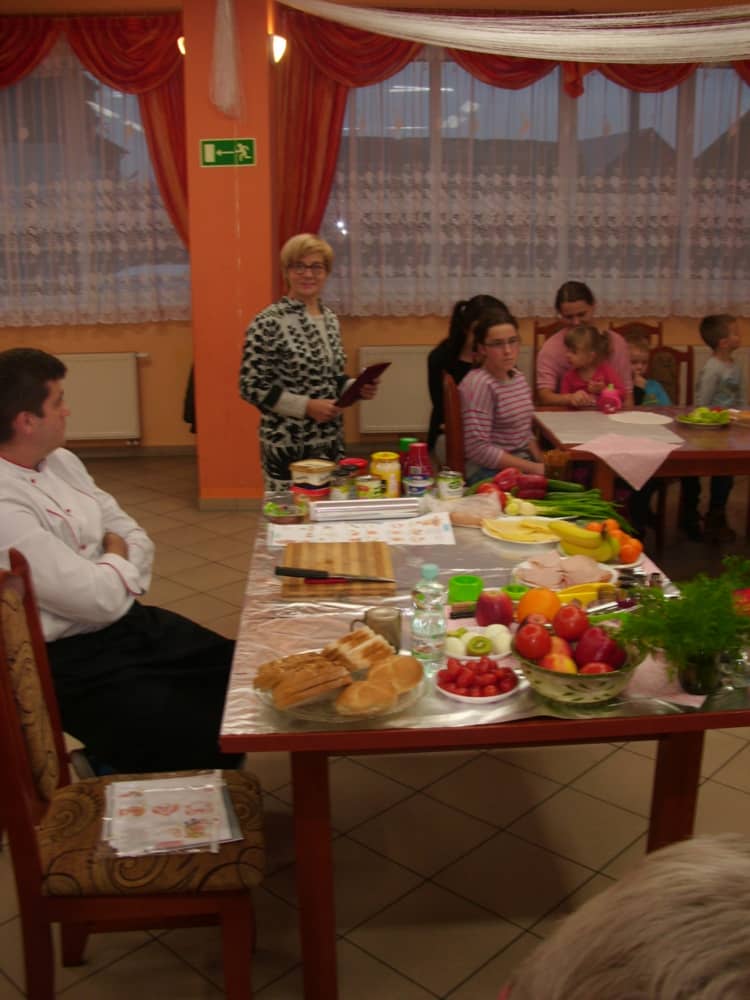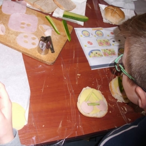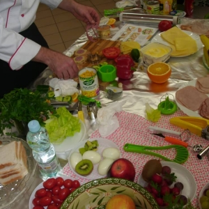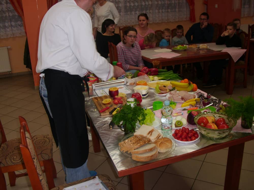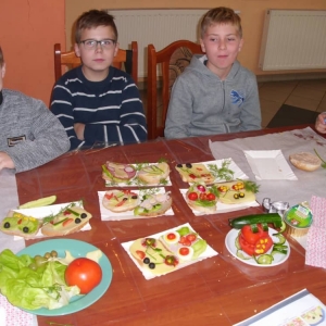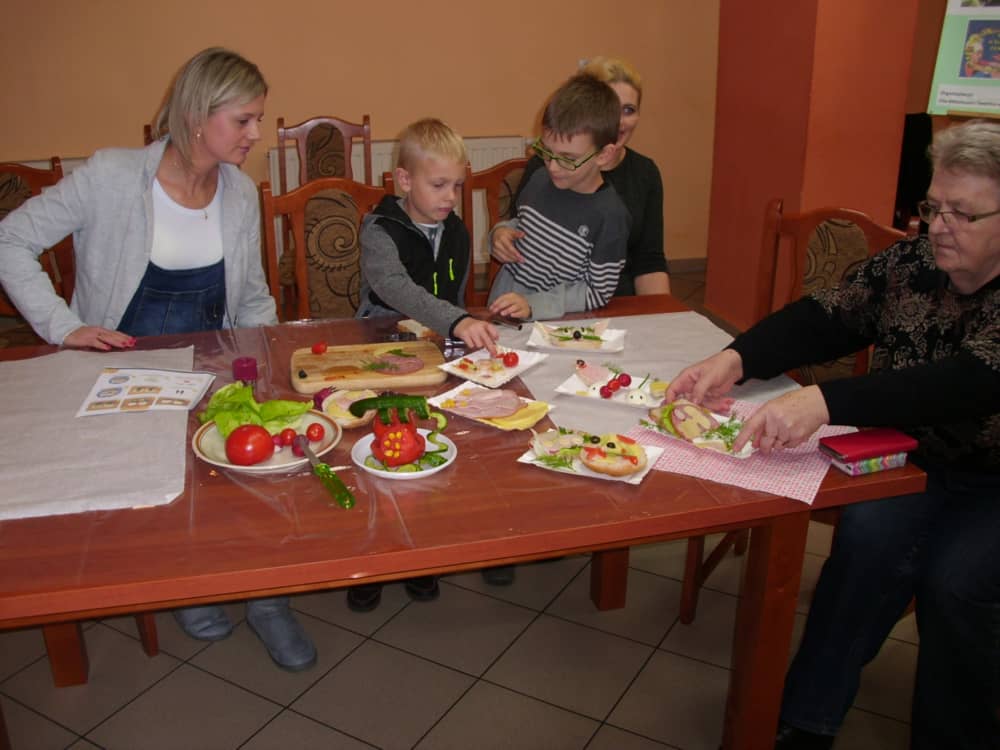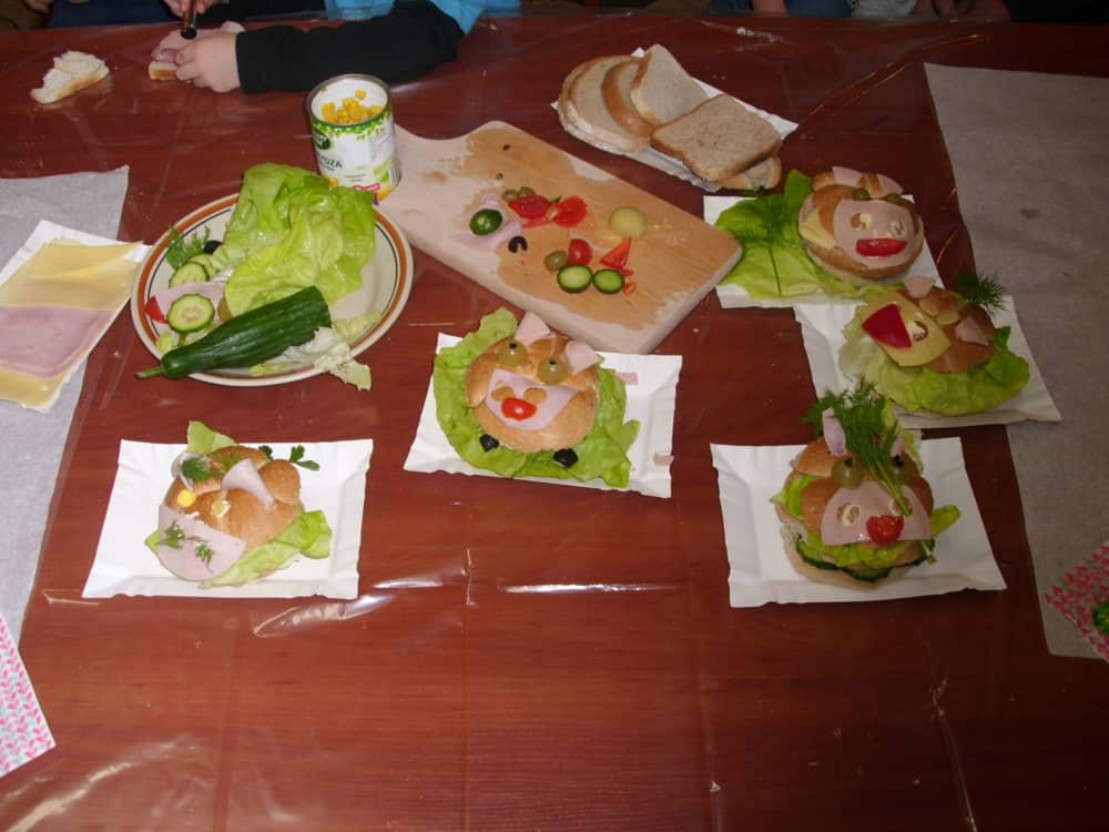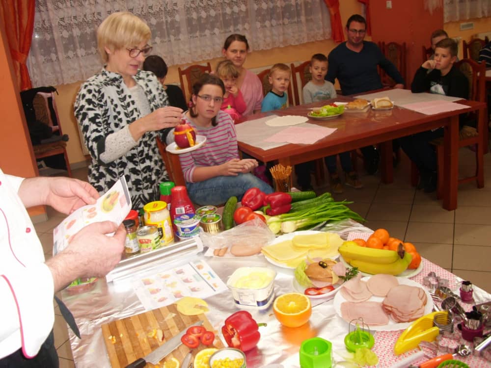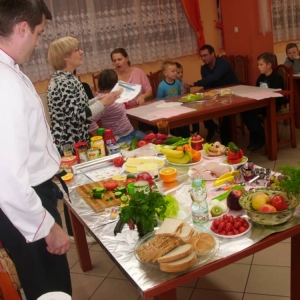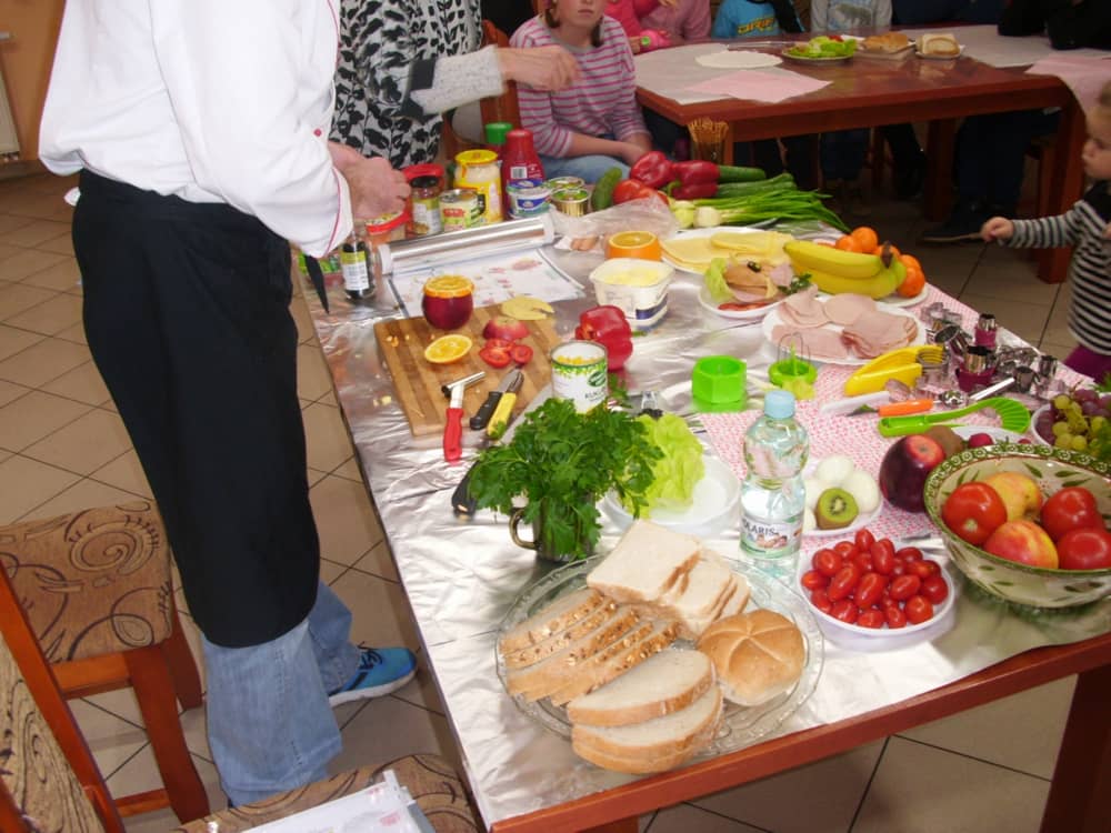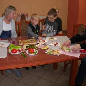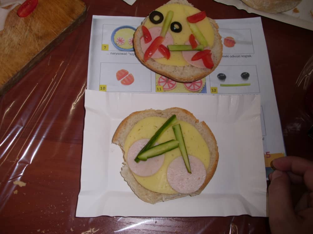 Honorowym gościem, a jednocześnie prowadzącym był zawodowy kucharz Tomasz Brzykcy. Opowiedział uczestnikom o zdrowych produktach, zademonstrował przyrządy służące do ozdabiania potraw, z których korzysta w kuchni. Z warzyw i owoców wyczarował telefon, imbryk, serwis do herbaty. Z pieczywa powstała krowa oraz lew. Po interesującym pokazie, dzieci pod okiem rodziców, babć i opiekunów, (przy dużej dawce śmiechu) same tworzyły kanapkowe cuda. Na koniec nastąpiła demonstracja dzieł i długo wyczekiwana konsumpcja.