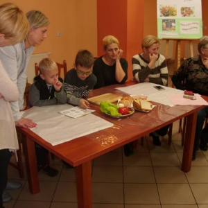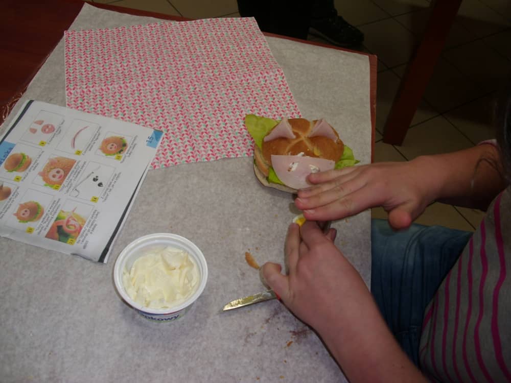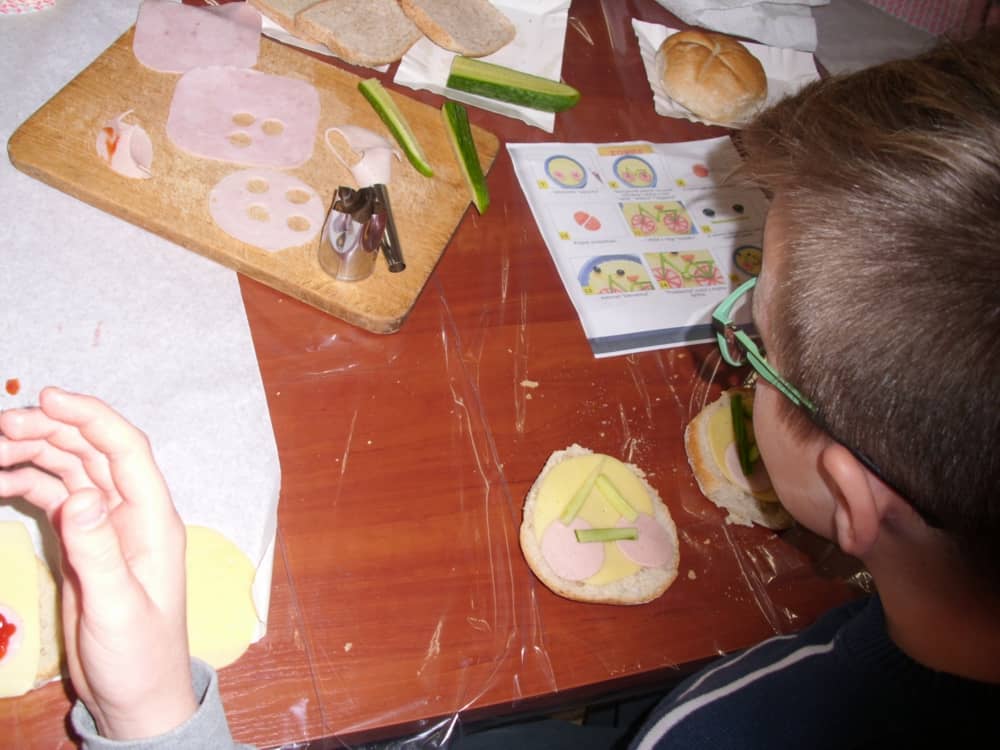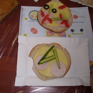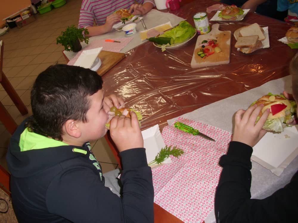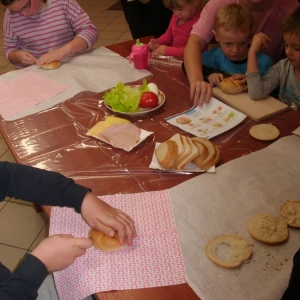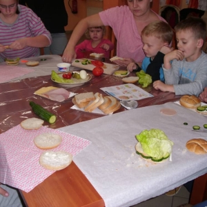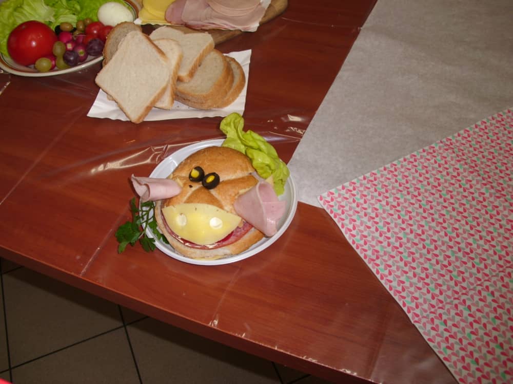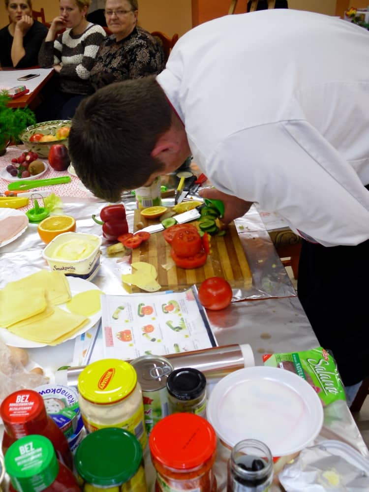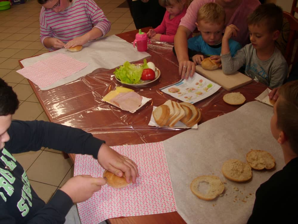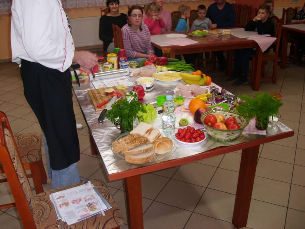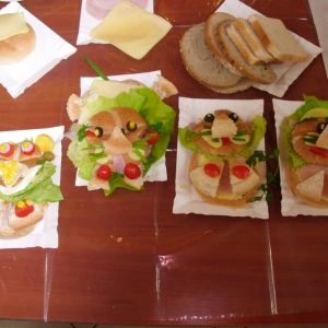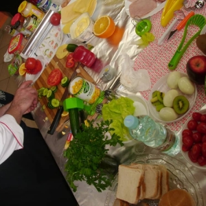 Honorowym gościem, a jednocześnie prowadzącym był zawodowy kucharz Tomasz Brzykcy. Opowiedział uczestnikom o zdrowych produktach, zademonstrował przyrządy służące do ozdabiania potraw, z których korzysta w kuchni. Z warzyw i owoców wyczarował telefon, imbryk, serwis do herbaty. Z pieczywa powstała krowa oraz lew. Po interesującym pokazie, dzieci pod okiem rodziców, babć i opiekunów, (przy dużej dawce śmiechu) same tworzyły kanapkowe cuda. Na koniec nastąpiła demonstracja dzieł i długo wyczekiwana konsumpcja.