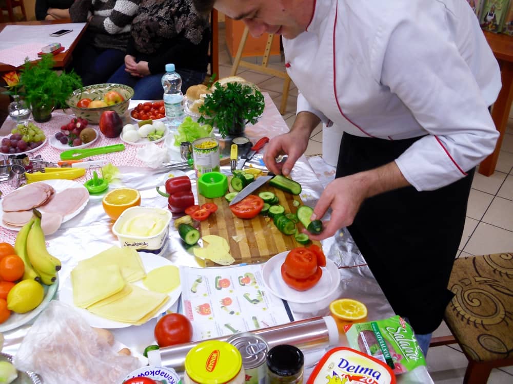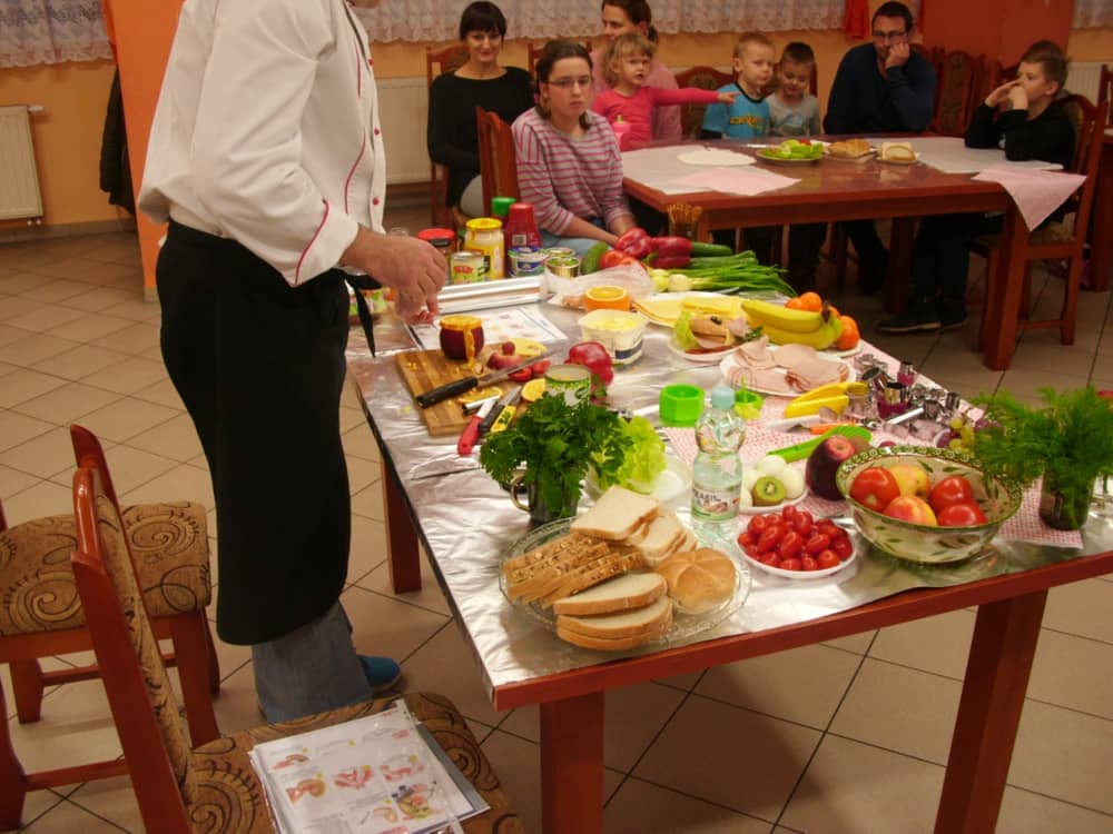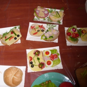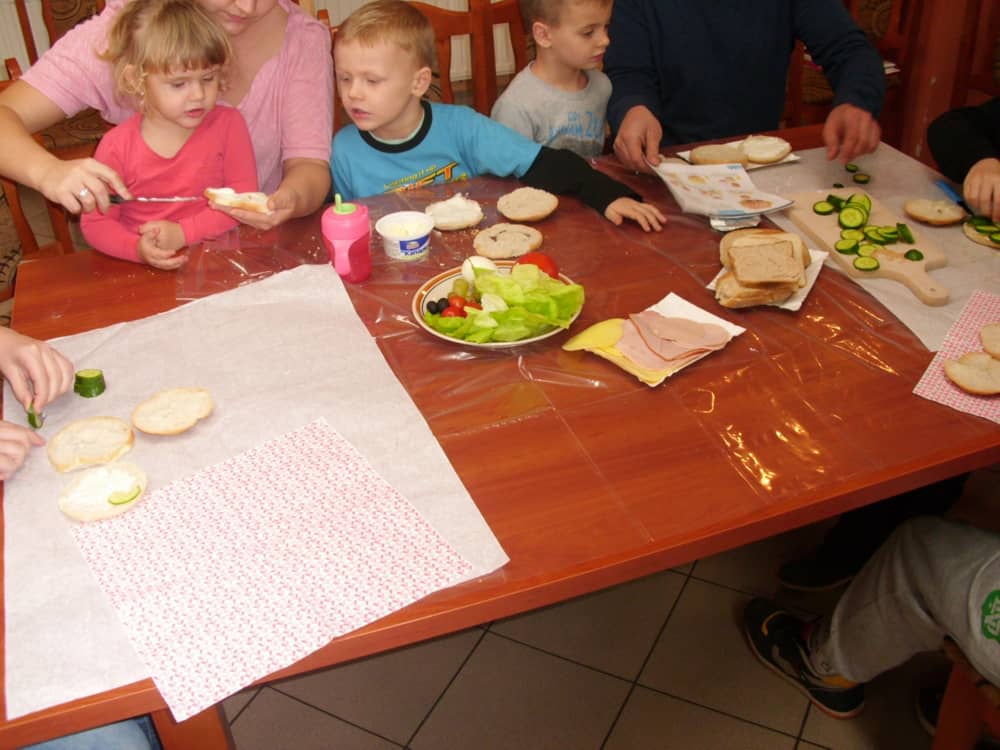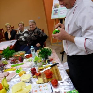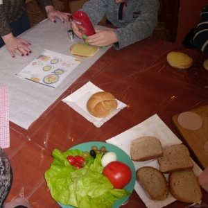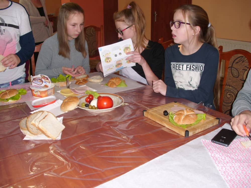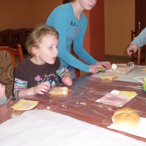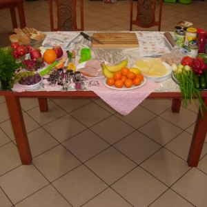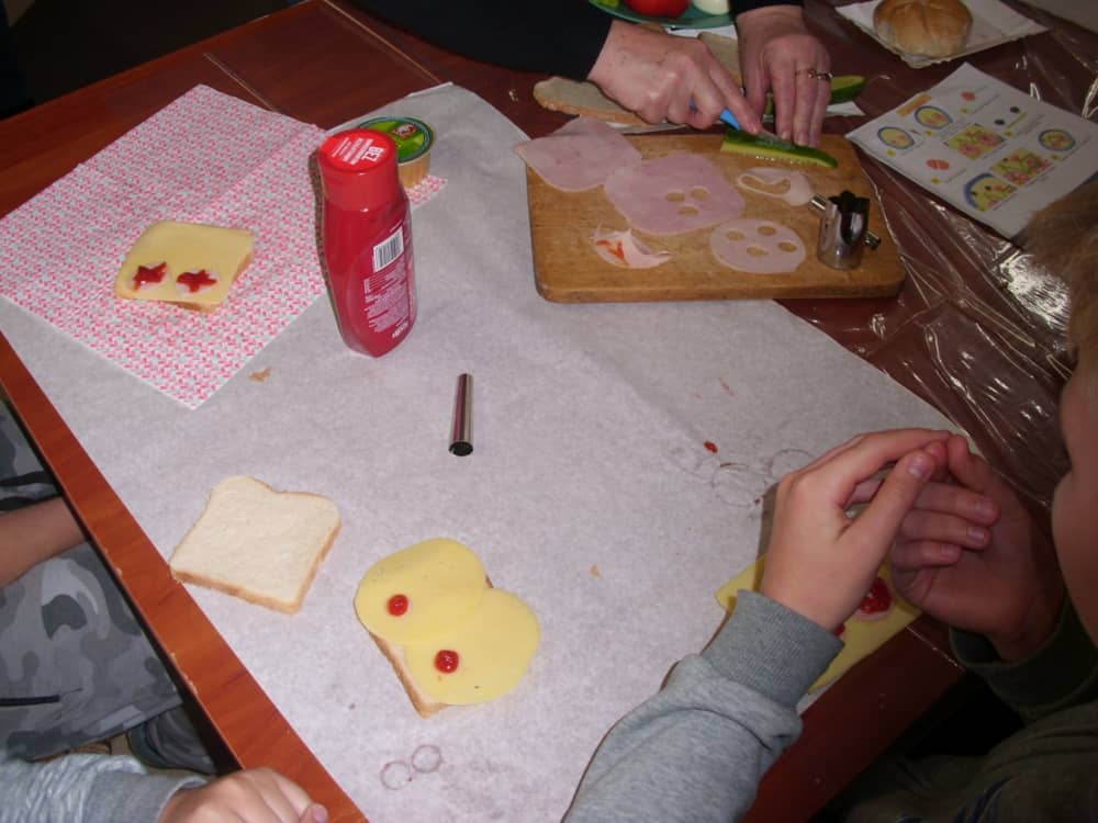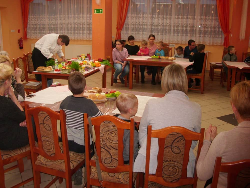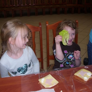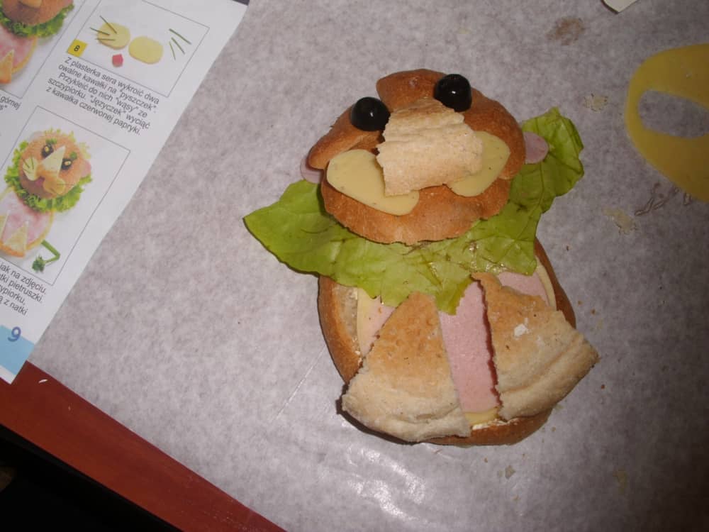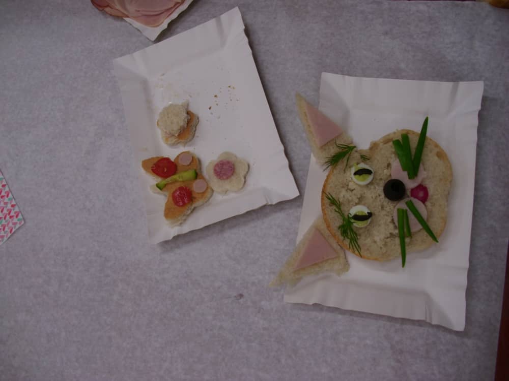 Honorowym gościem, a jednocześnie prowadzącym był zawodowy kucharz Tomasz Brzykcy. Opowiedział uczestnikom o zdrowych produktach, zademonstrował przyrządy służące do ozdabiania potraw, z których korzysta w kuchni. Z warzyw i owoców wyczarował telefon, imbryk, serwis do herbaty. Z pieczywa powstała krowa oraz lew. Po interesującym pokazie, dzieci pod okiem rodziców, babć i opiekunów, (przy dużej dawce śmiechu) same tworzyły kanapkowe cuda. Na koniec nastąpiła demonstracja dzieł i długo wyczekiwana konsumpcja.